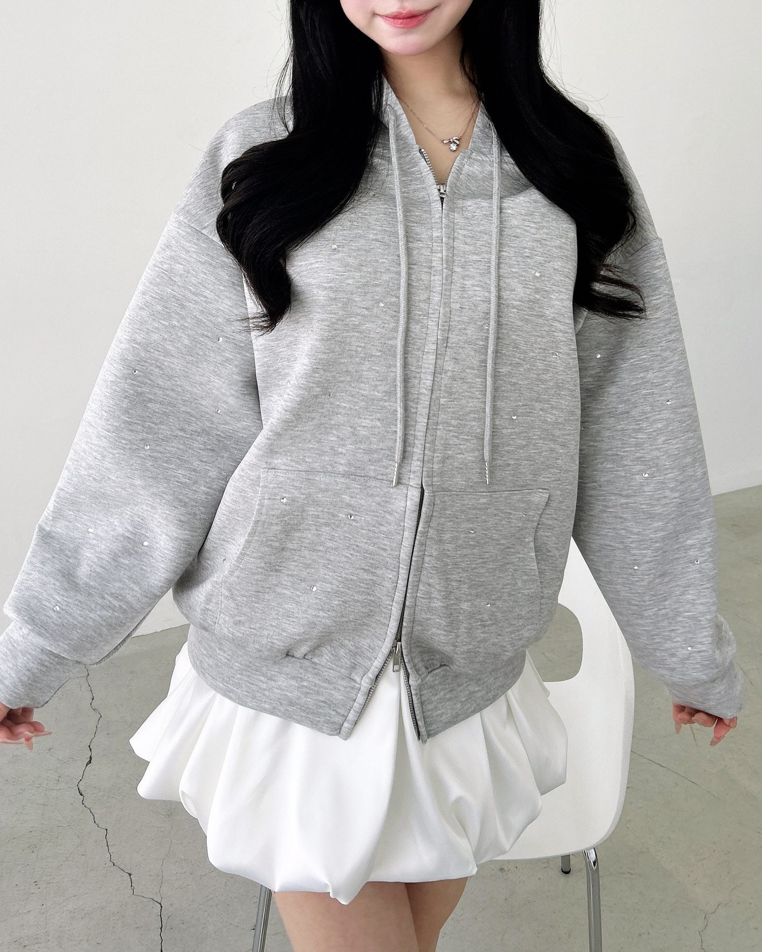 Tシャツやスウェットを合わせれば甘さ控えめのカジュアルなスタイルに。