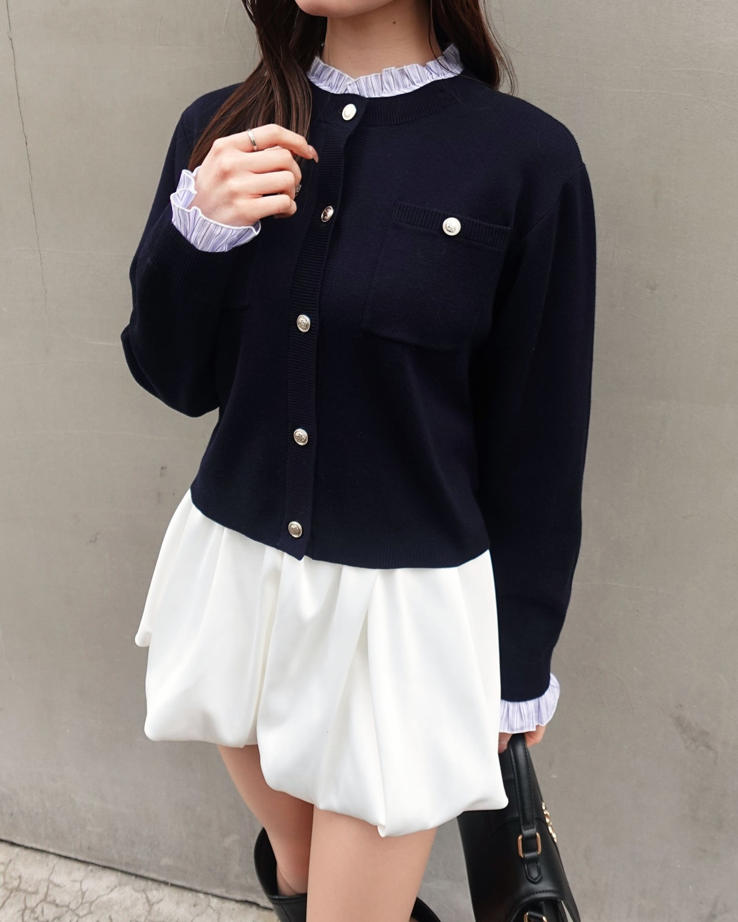 ブラウスやキャミソールと合わせてガーリーに着こなすのもおすすめです◎