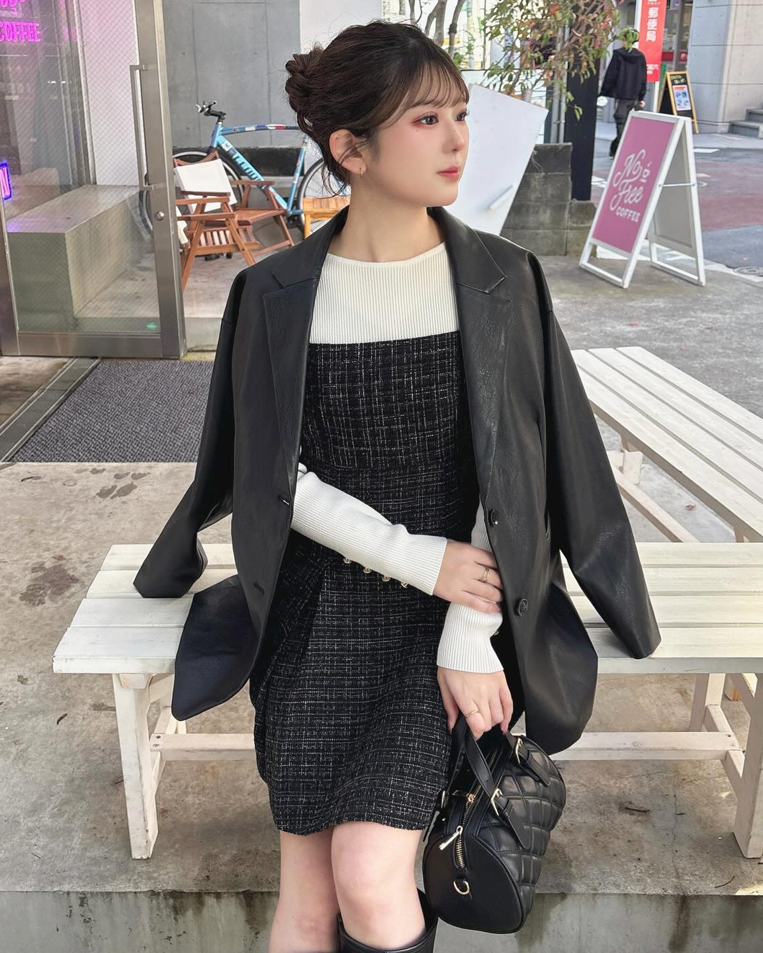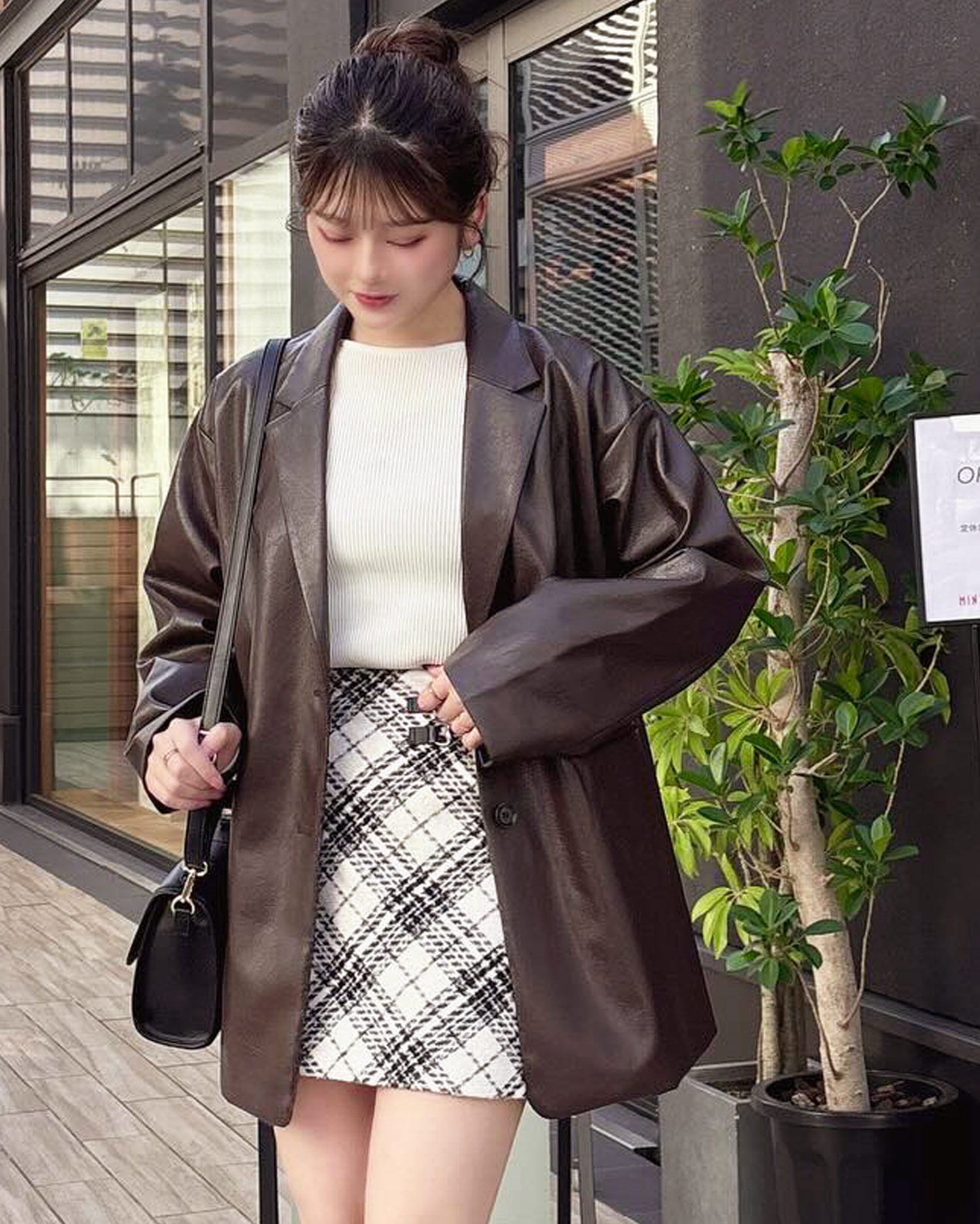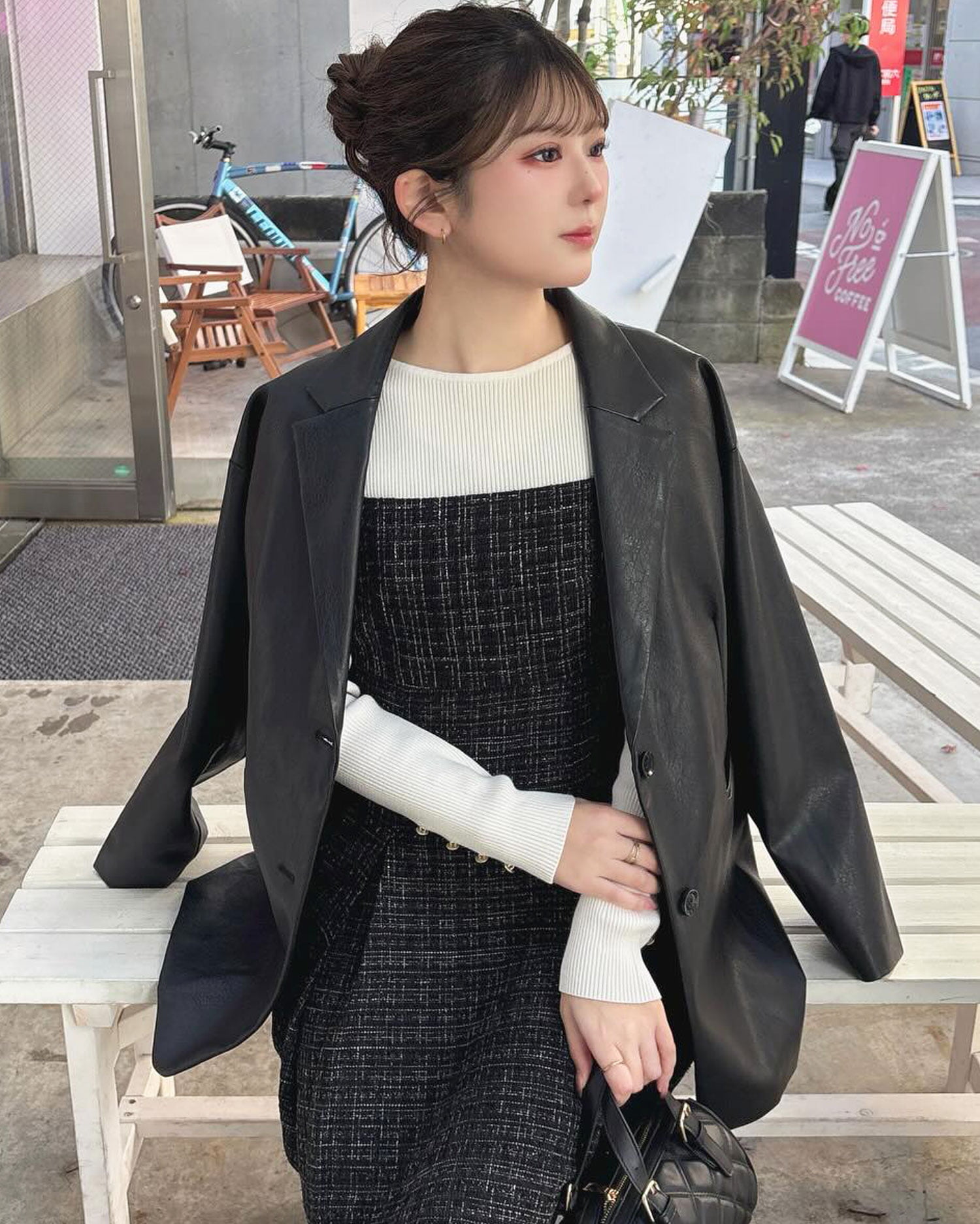 きちんと感のあるテーラードジャケットもフェイクレザーならスタイリッシュ。