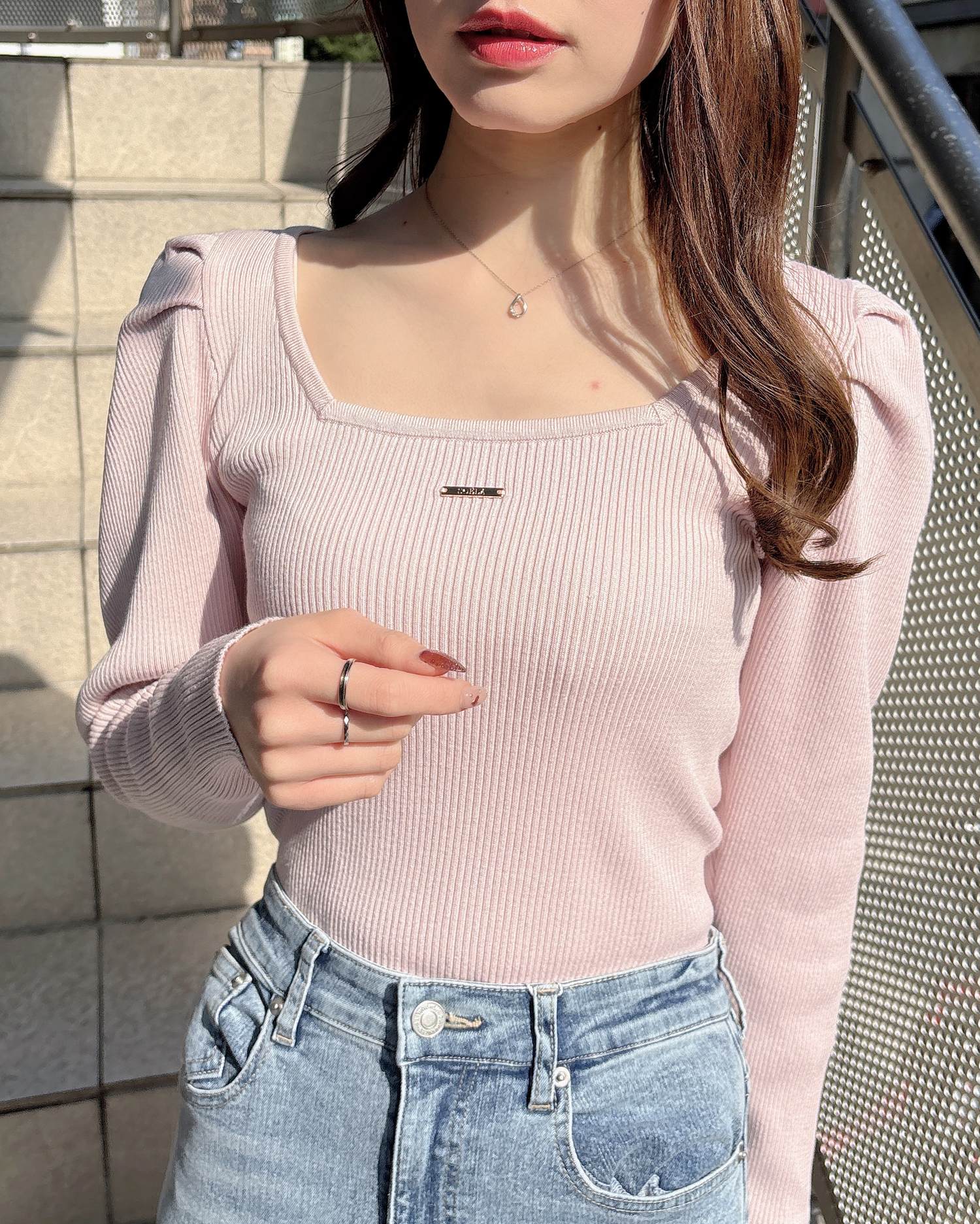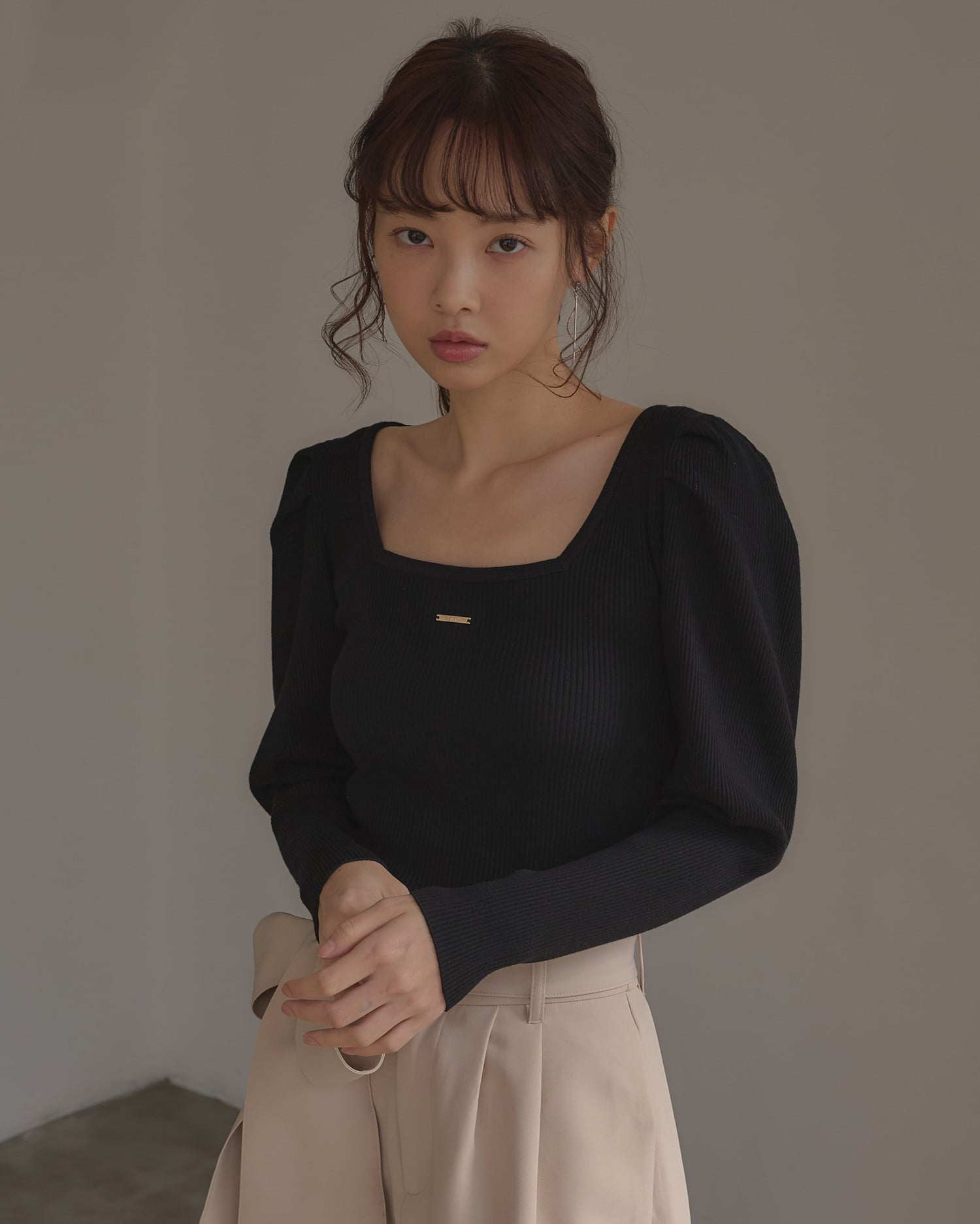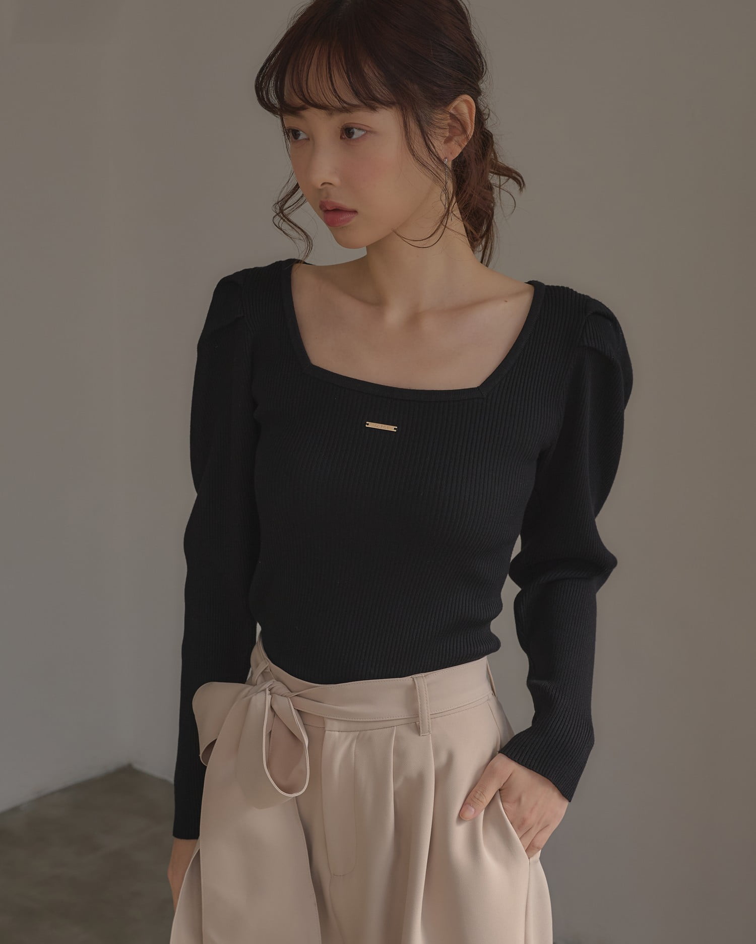 スクエアネックが上品な肌見せを叶えるリブニットトップス。