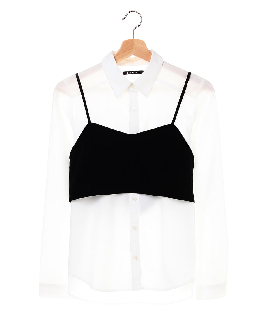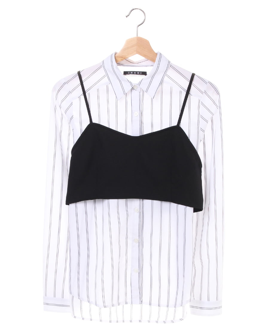 かっちりとしたシルエットのシャツに旬のビスチェをセットにしたおすすめアイテム。ベーシックなシャツはボディに沿うタイトめのシルエットできちんと感があります。華奢なストラップがフェミニンなビスチェは後ろ部分がリボンになっているのでバランス良く合わせられるのが◎。モノトーンのカラー使いが合わせやすく、これからの季節に活躍の予感。単品でも着回せるのでワードローブに追加決定です。