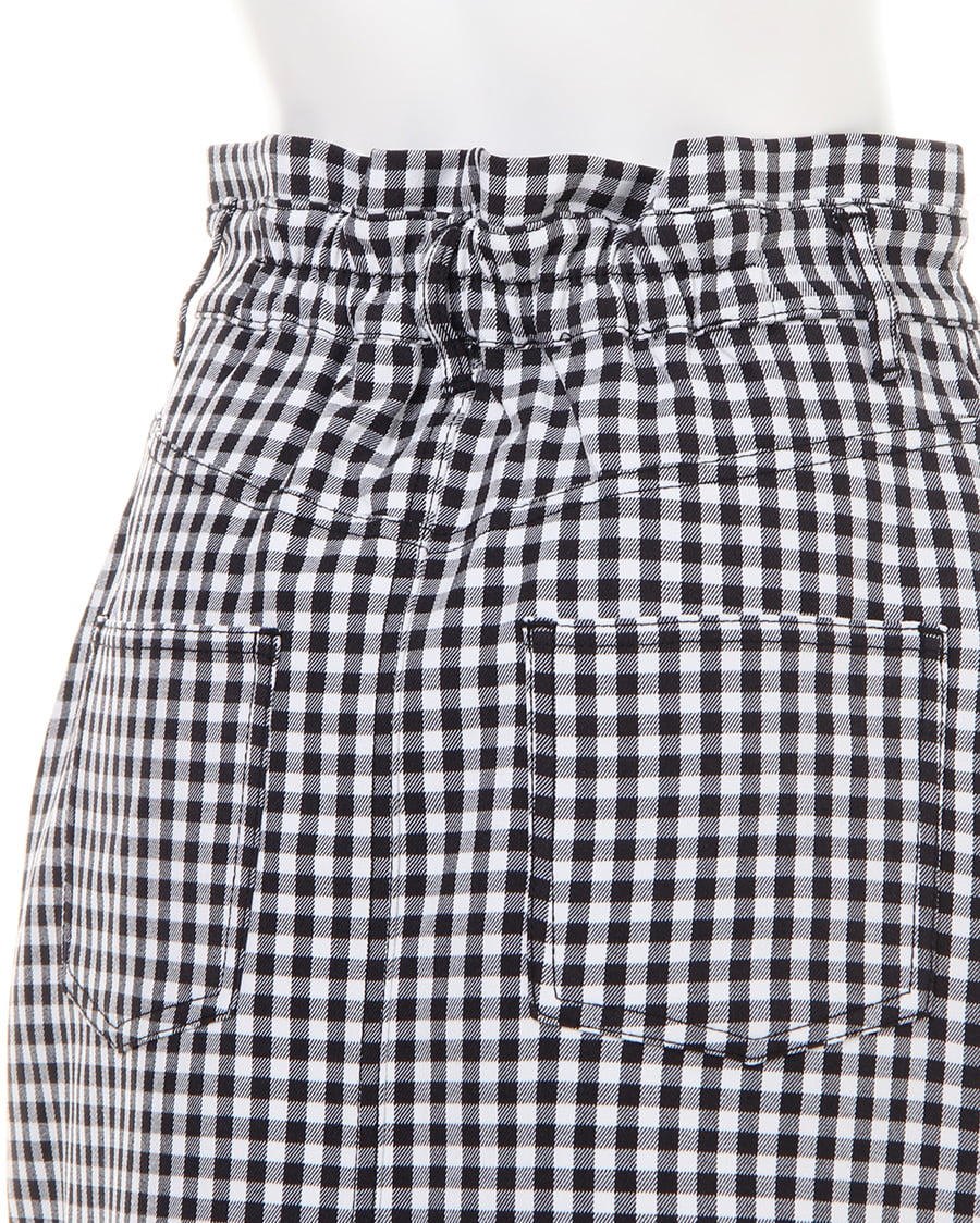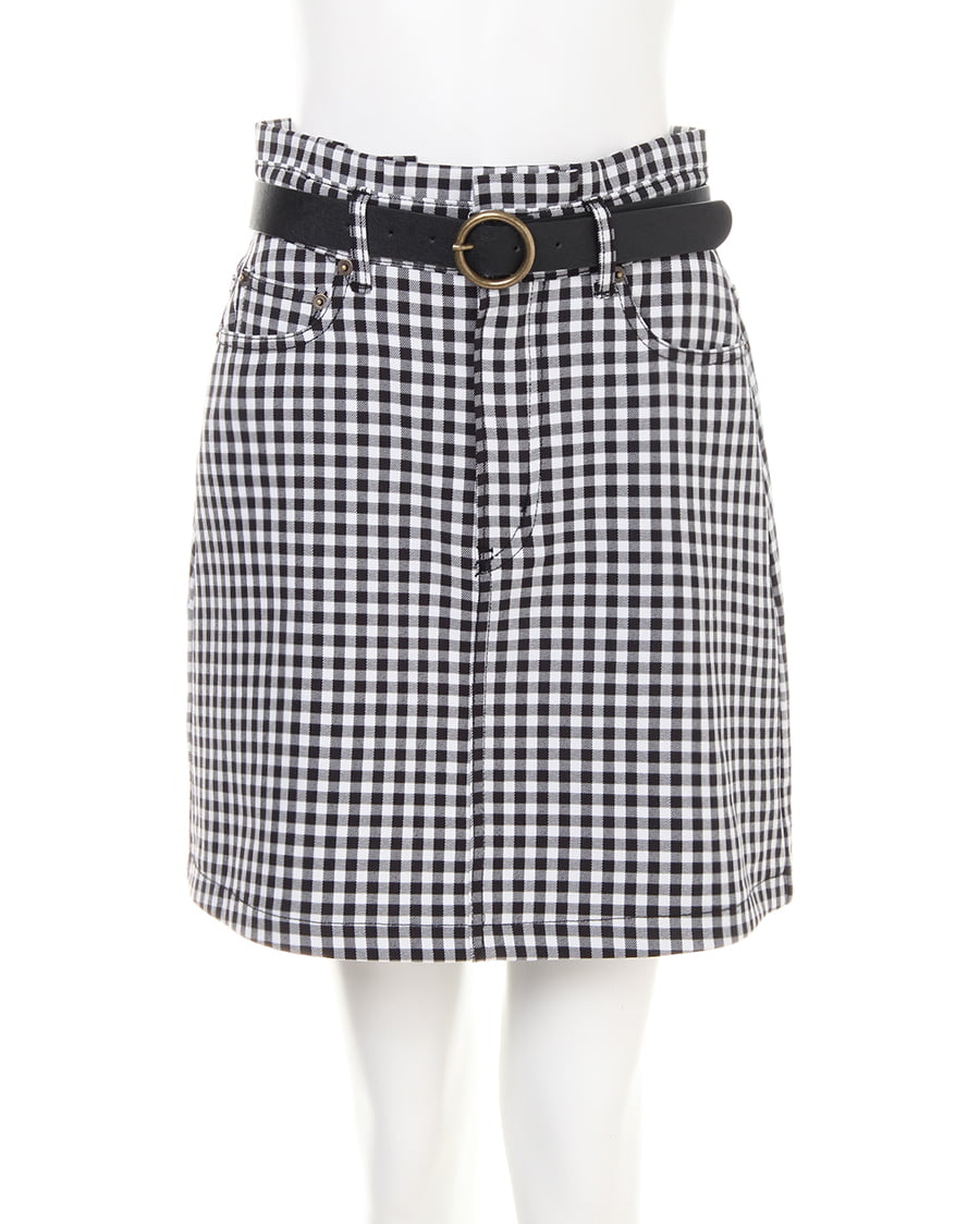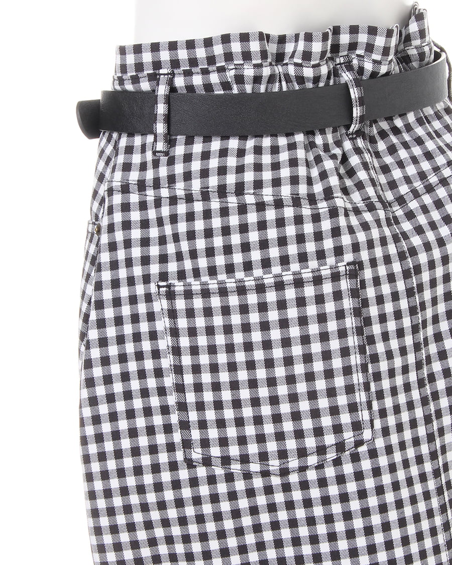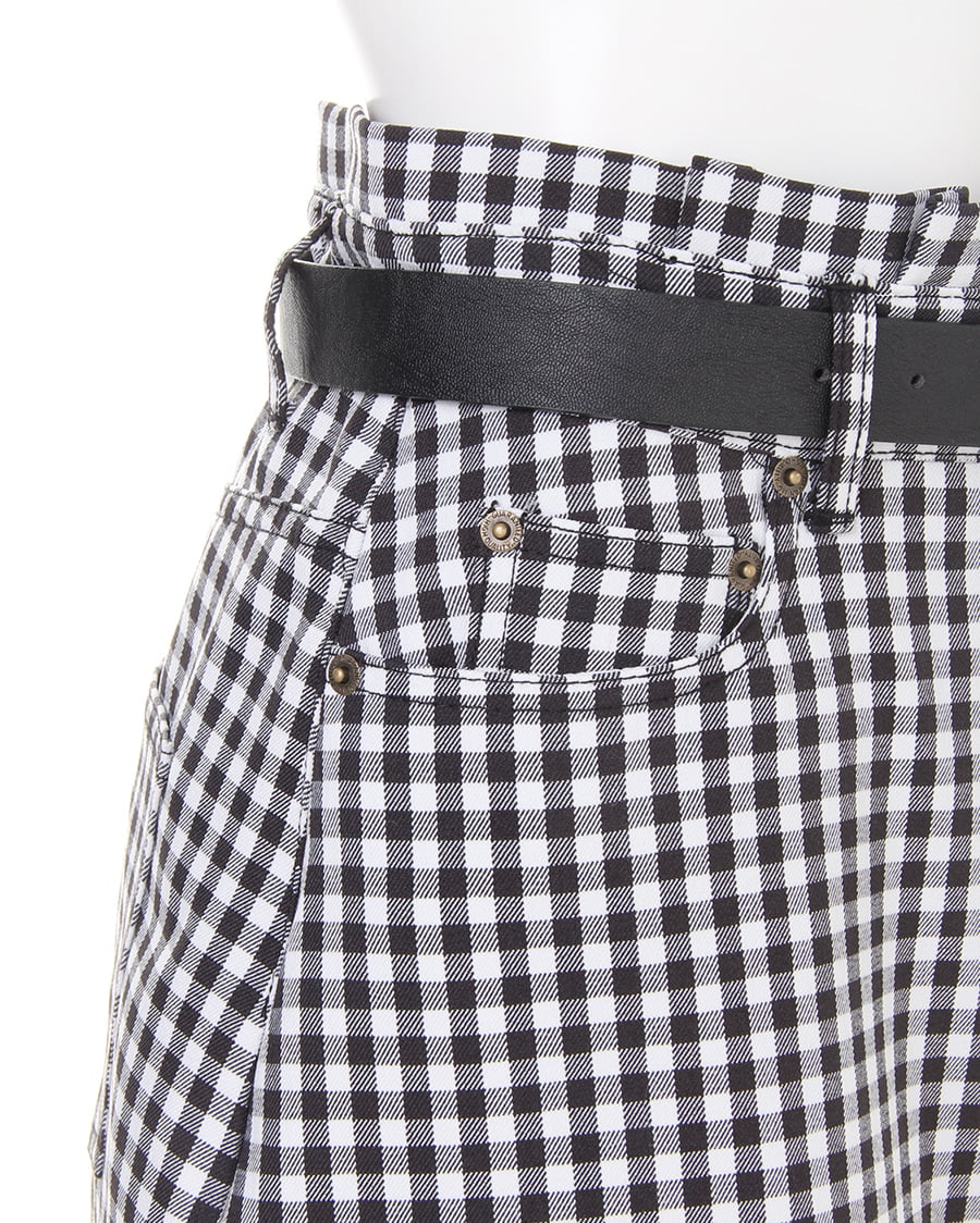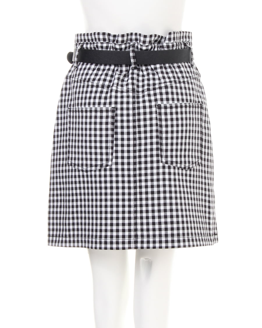 腰周りのラインをキレイに見せる台形シルエットのスカートはギンガムチェックがカジュアル感たっぷり。ウエスト上に少しフリルを入れているので、上半身をすっきり見せ脚長効果も期待できます。しなやかな素材のベルトはサークルバックルがガーリー。ウエスト部分はゴムになっているので脱ぎ穿きも楽チンです。