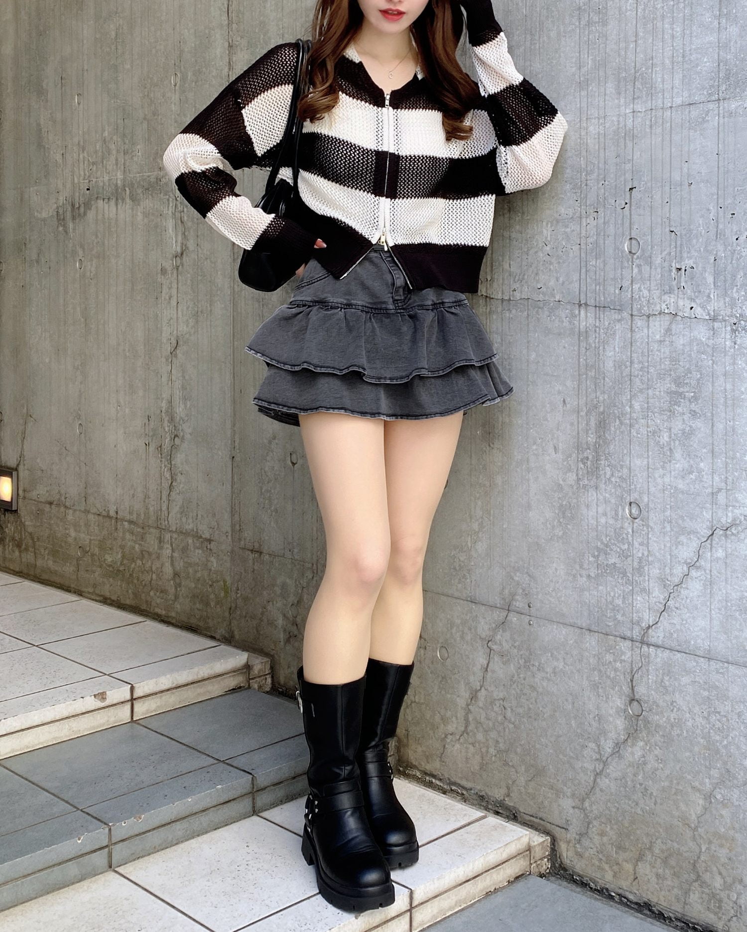 落ち着いたモノトーンカラーのボーダー柄なのでモードなコーデに仕上がります。