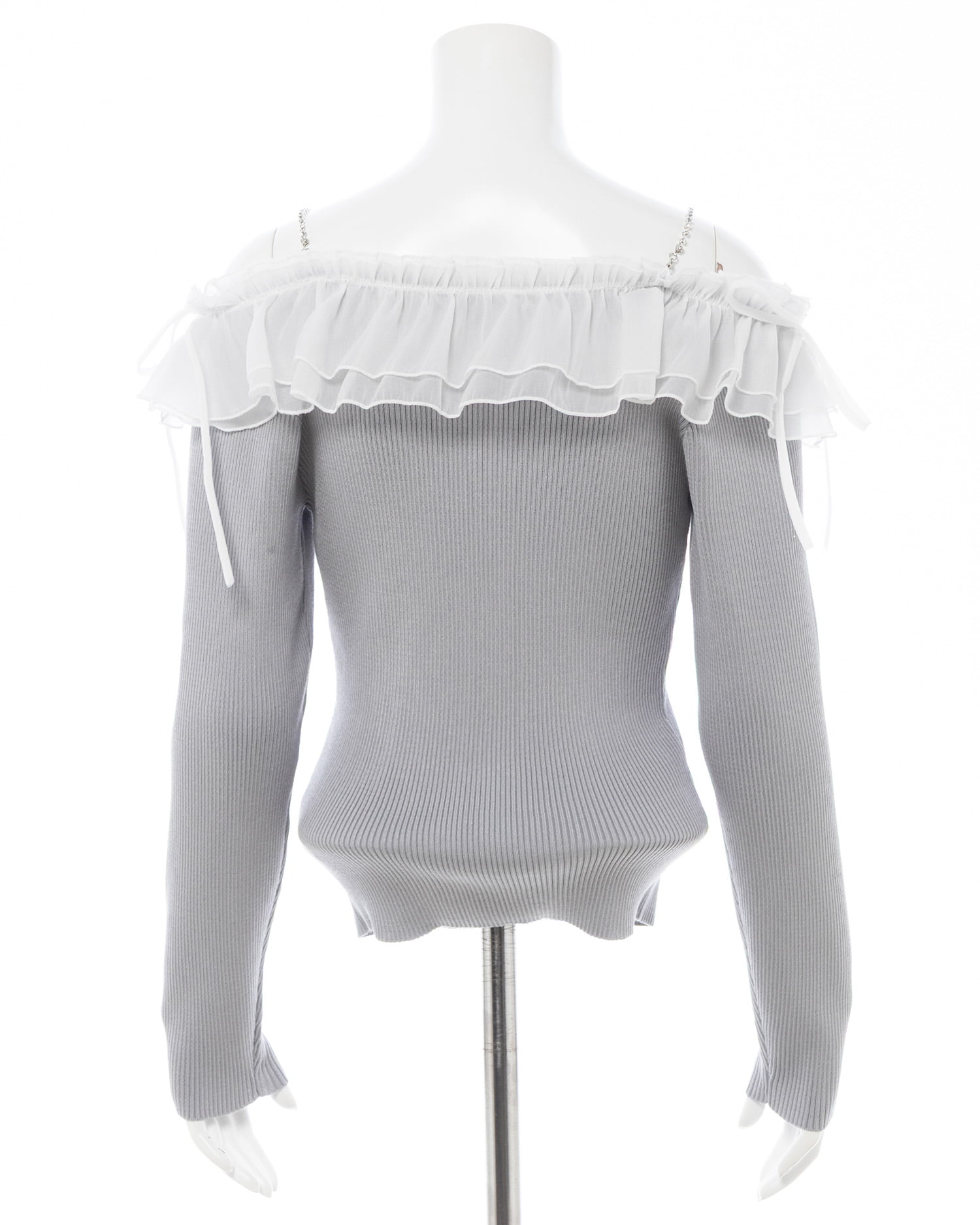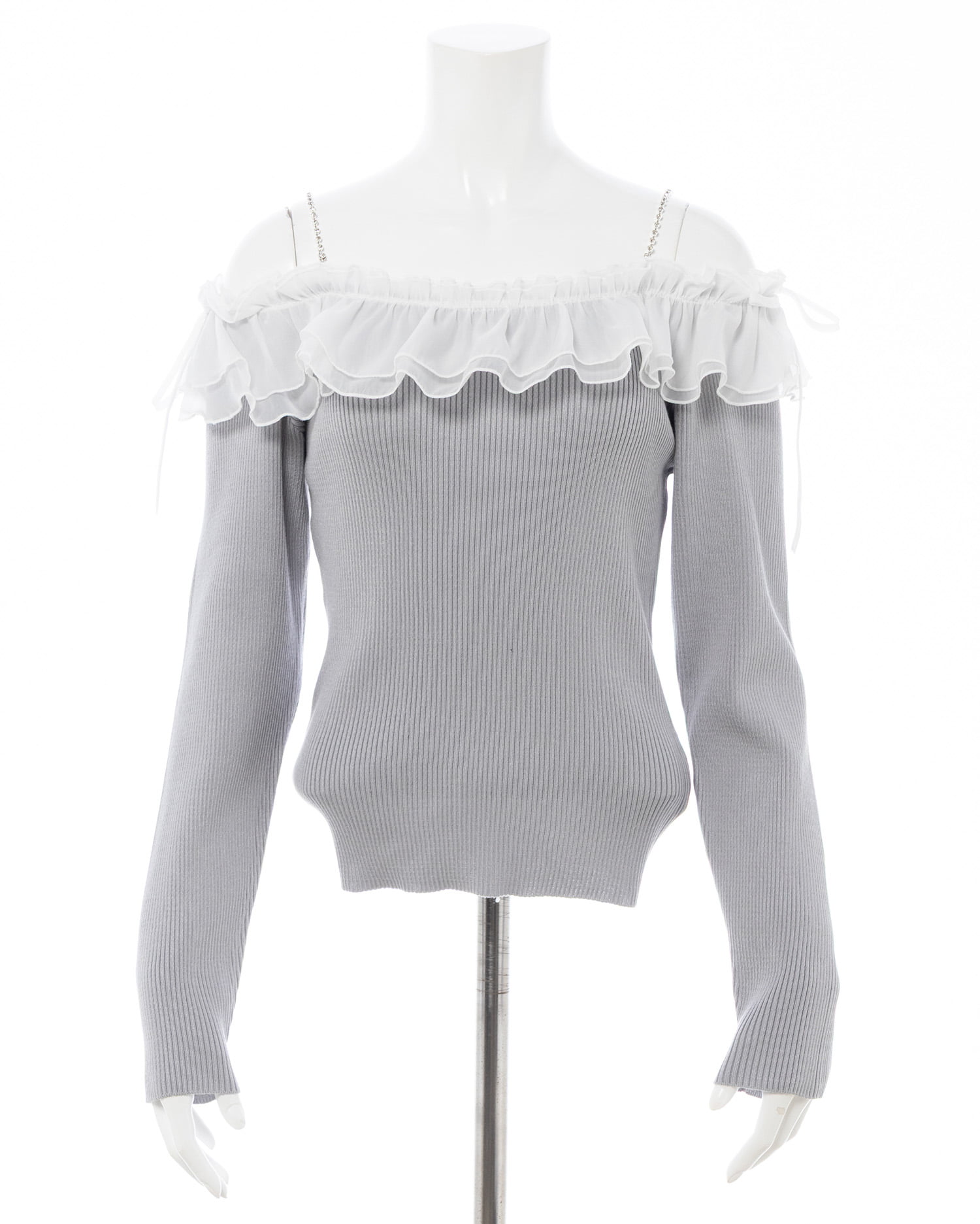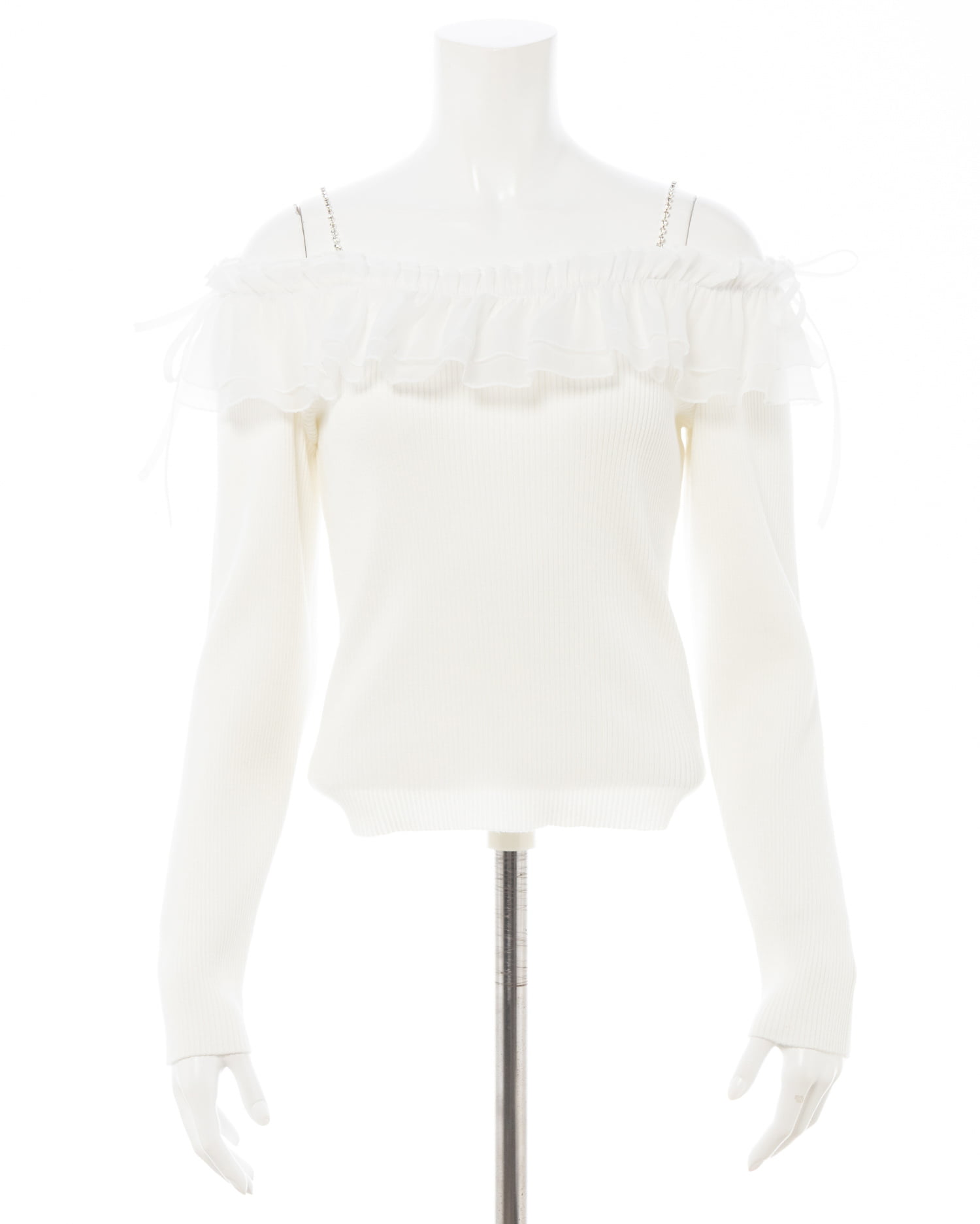 【ラインストーンのストラップとボリュームたっぷりのフリルが目を惹く♡オフショルニットトップス】