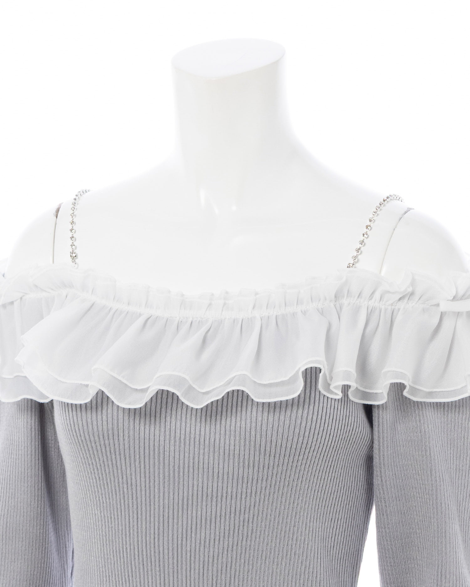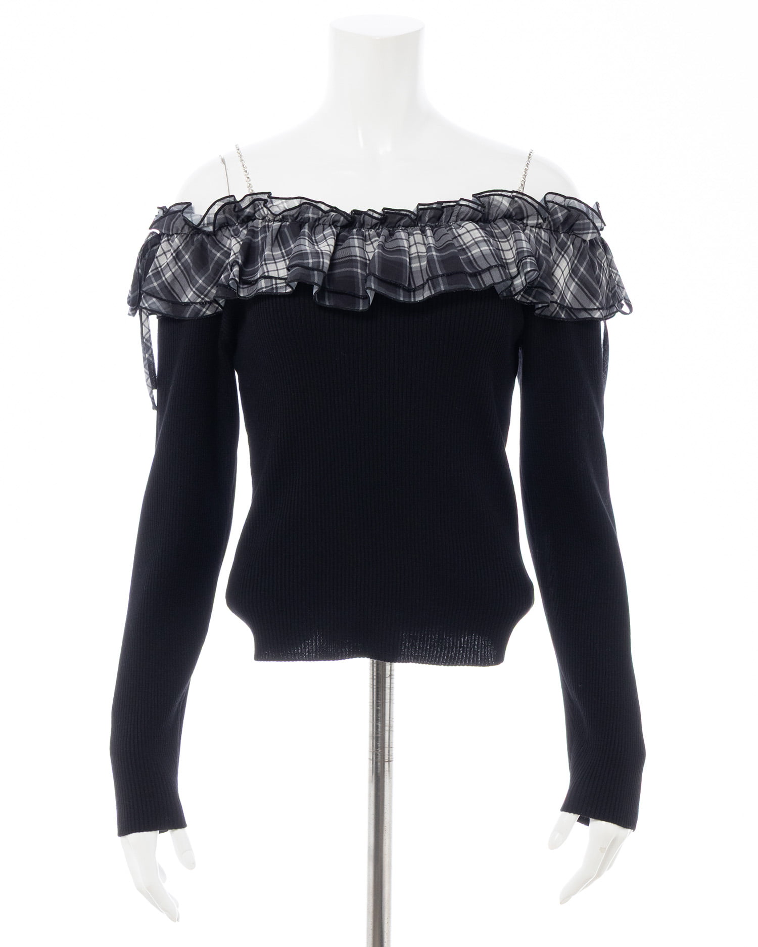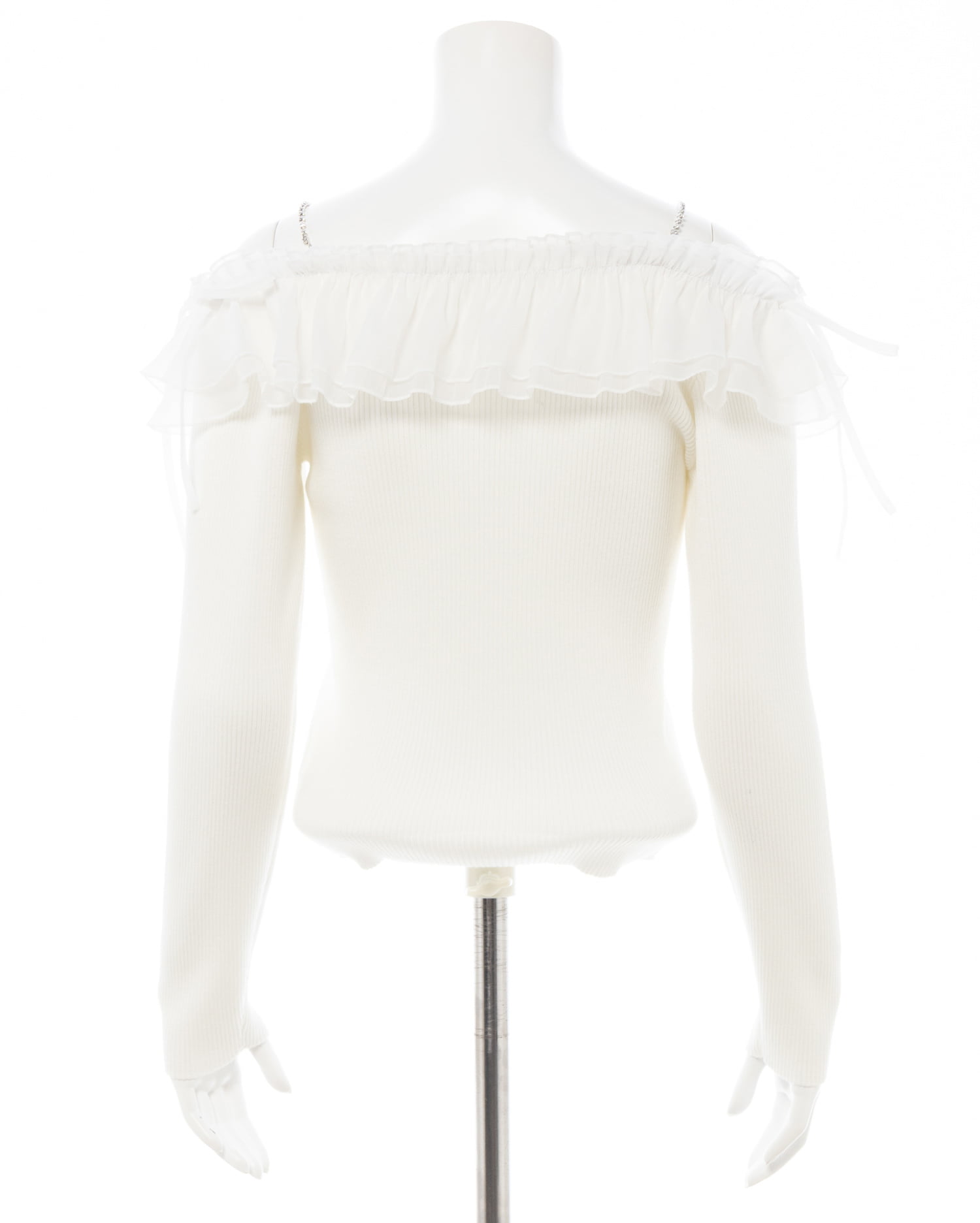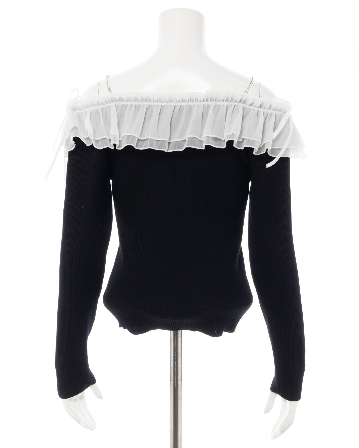 【ラインストーンのストラップとボリュームたっぷりのフリルが目を惹く♡オフショルニットトップス】