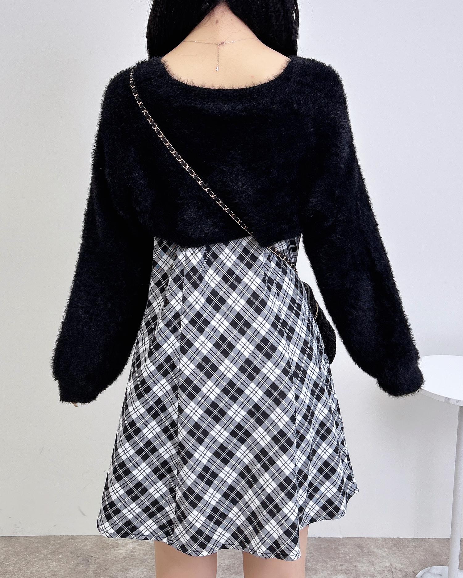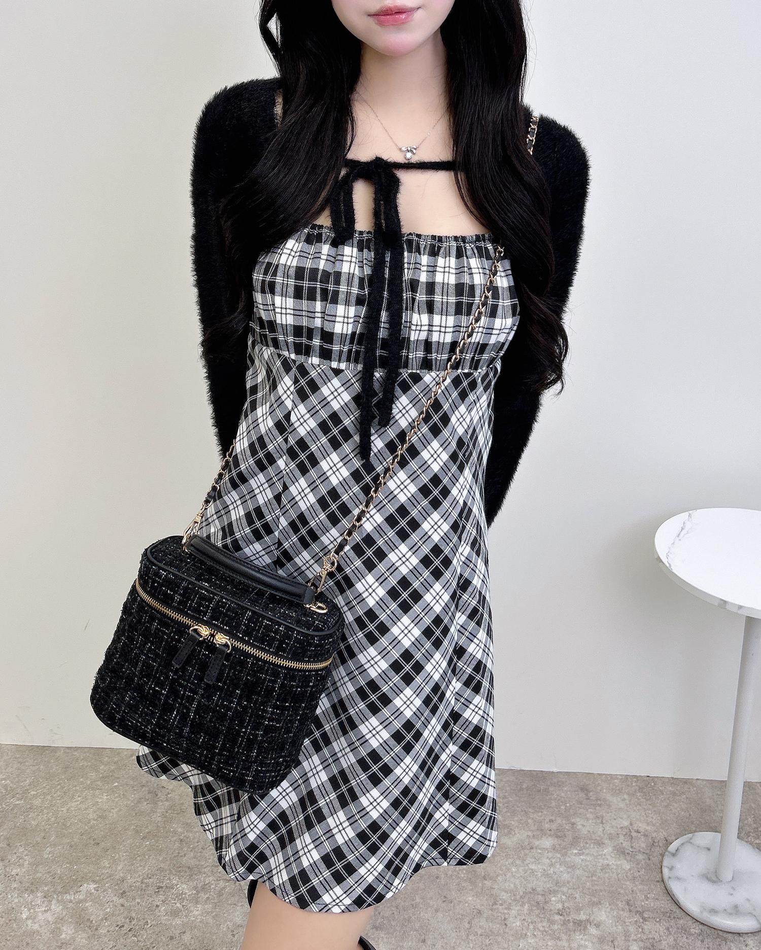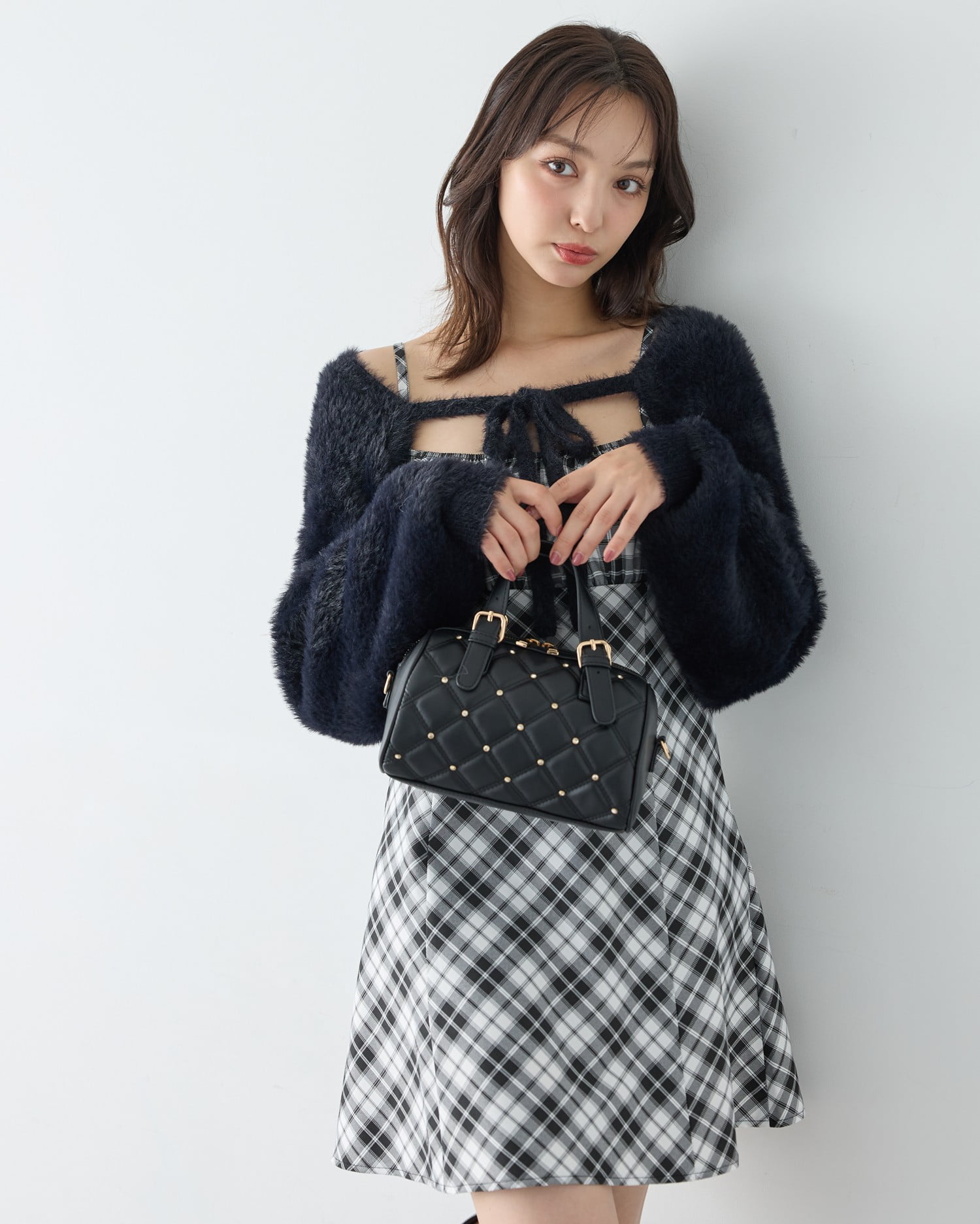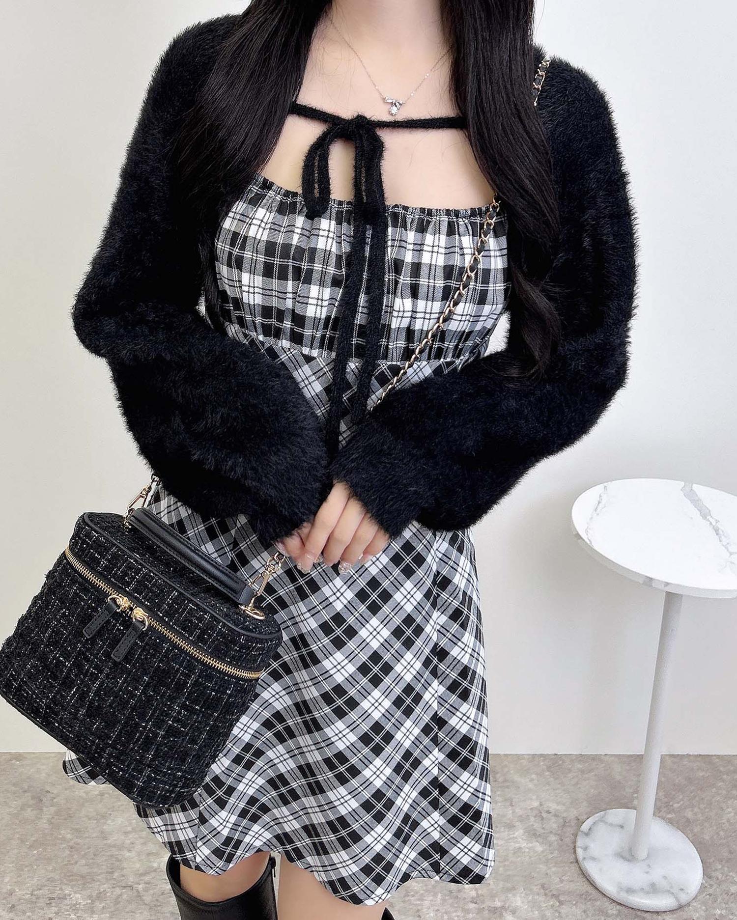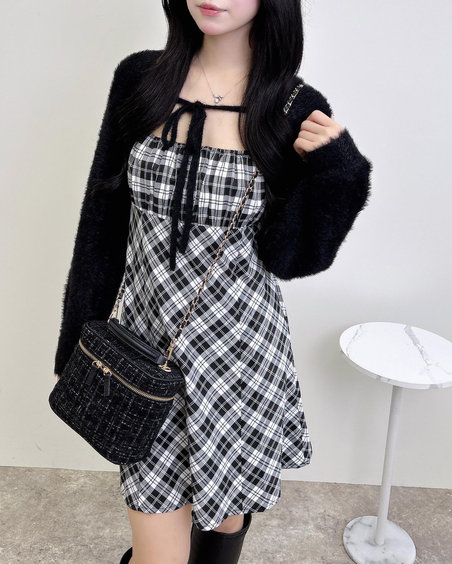 【WEB限定】フェザーボレロニット+チェック柄ミニキャミワンピースセット