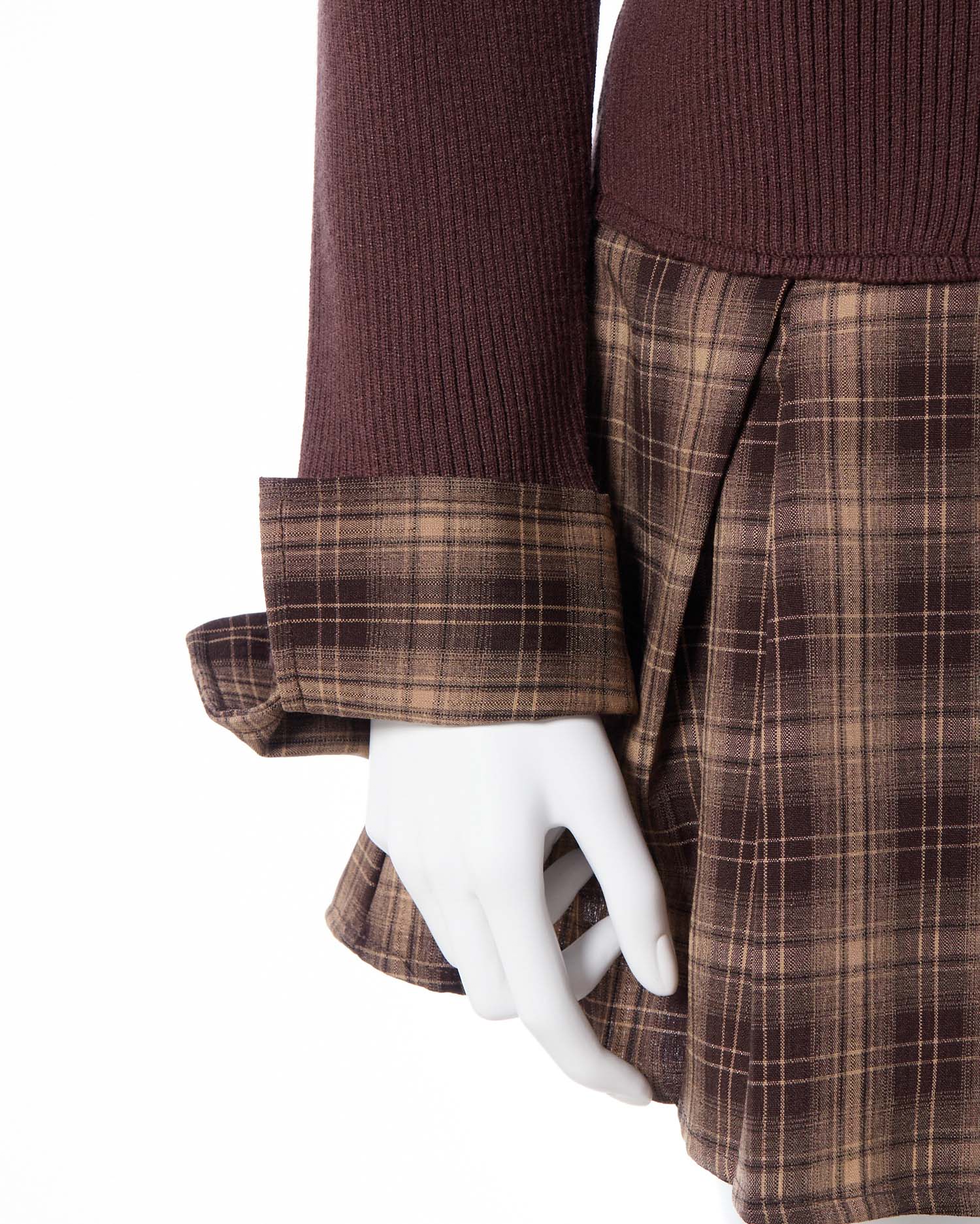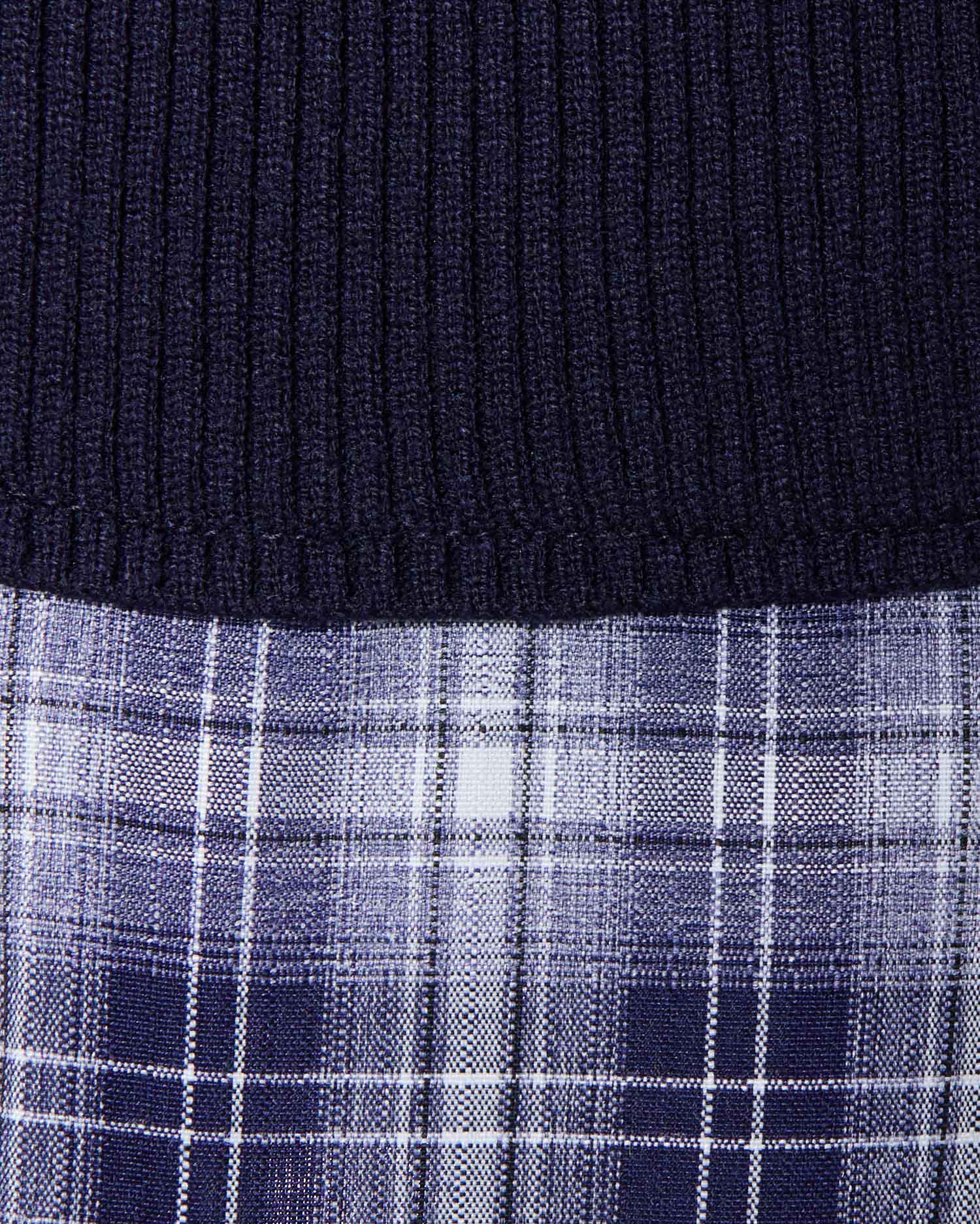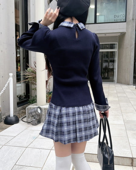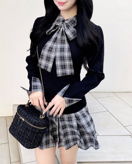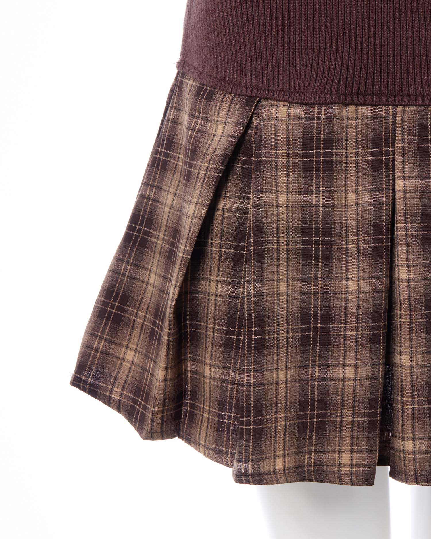 秋らしいチェック柄のシャツとニットのドッキングワンピ。