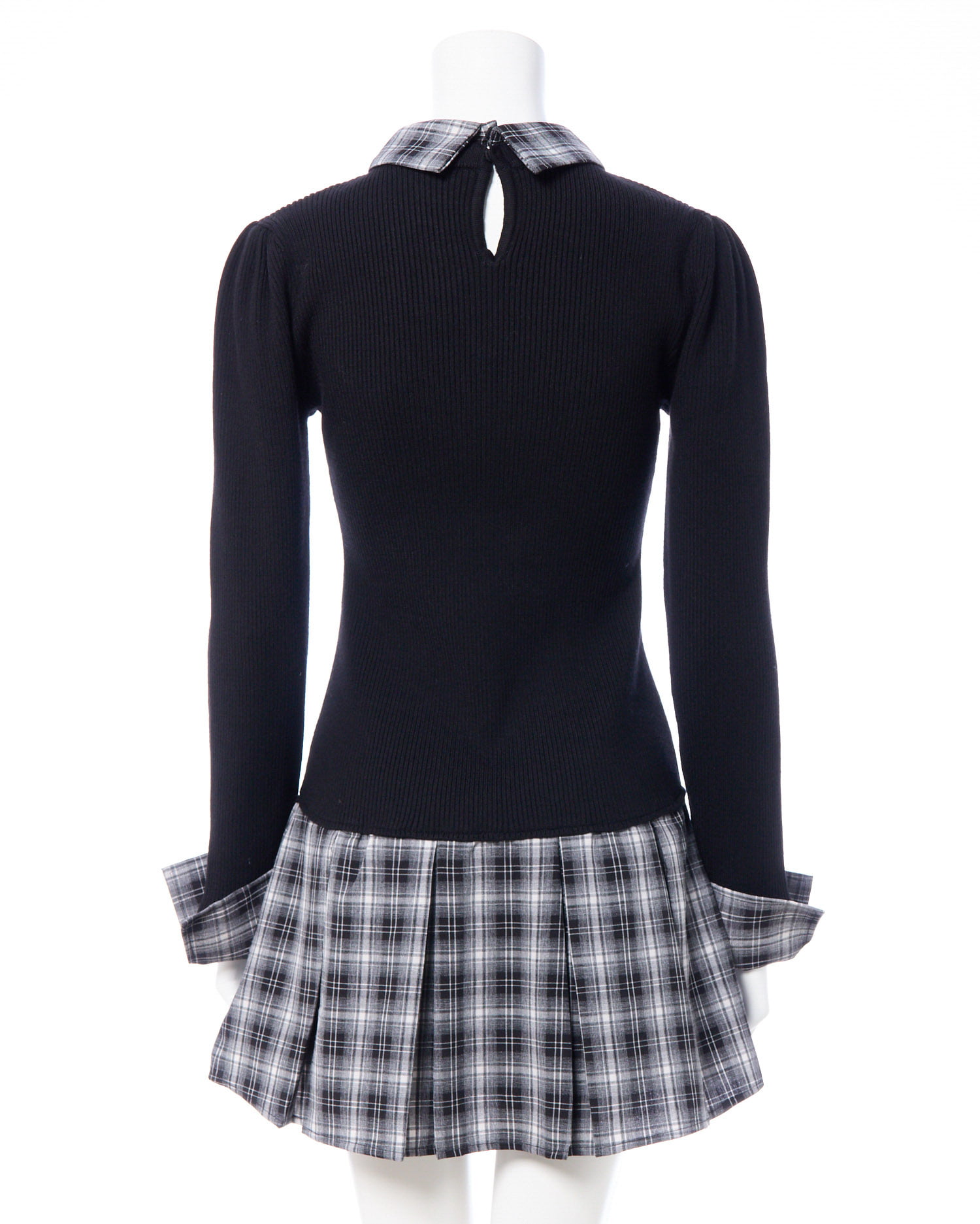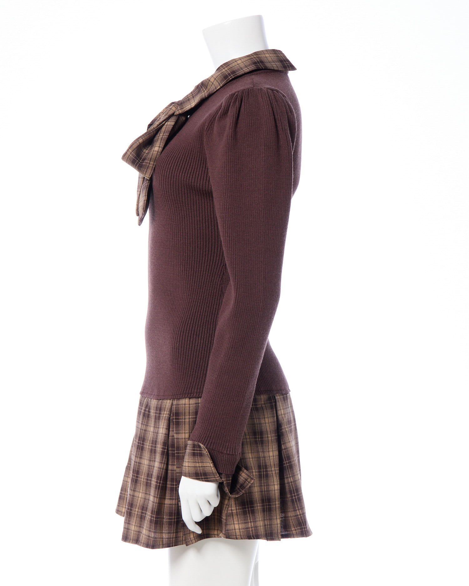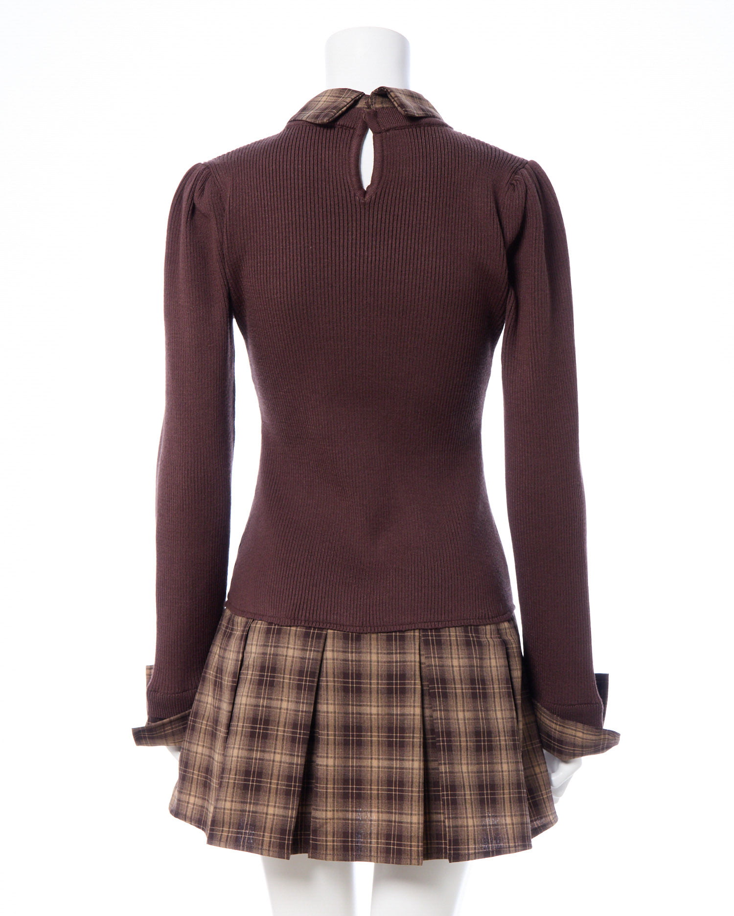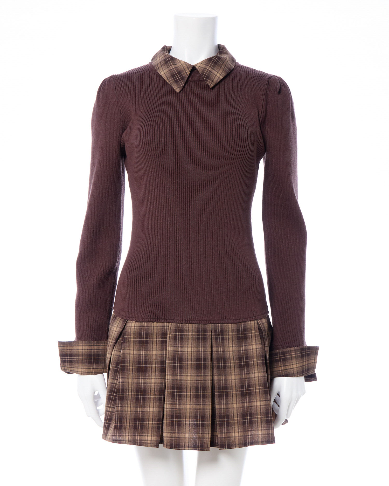 秋らしいチェック柄のシャツとニットのドッキングワンピ。