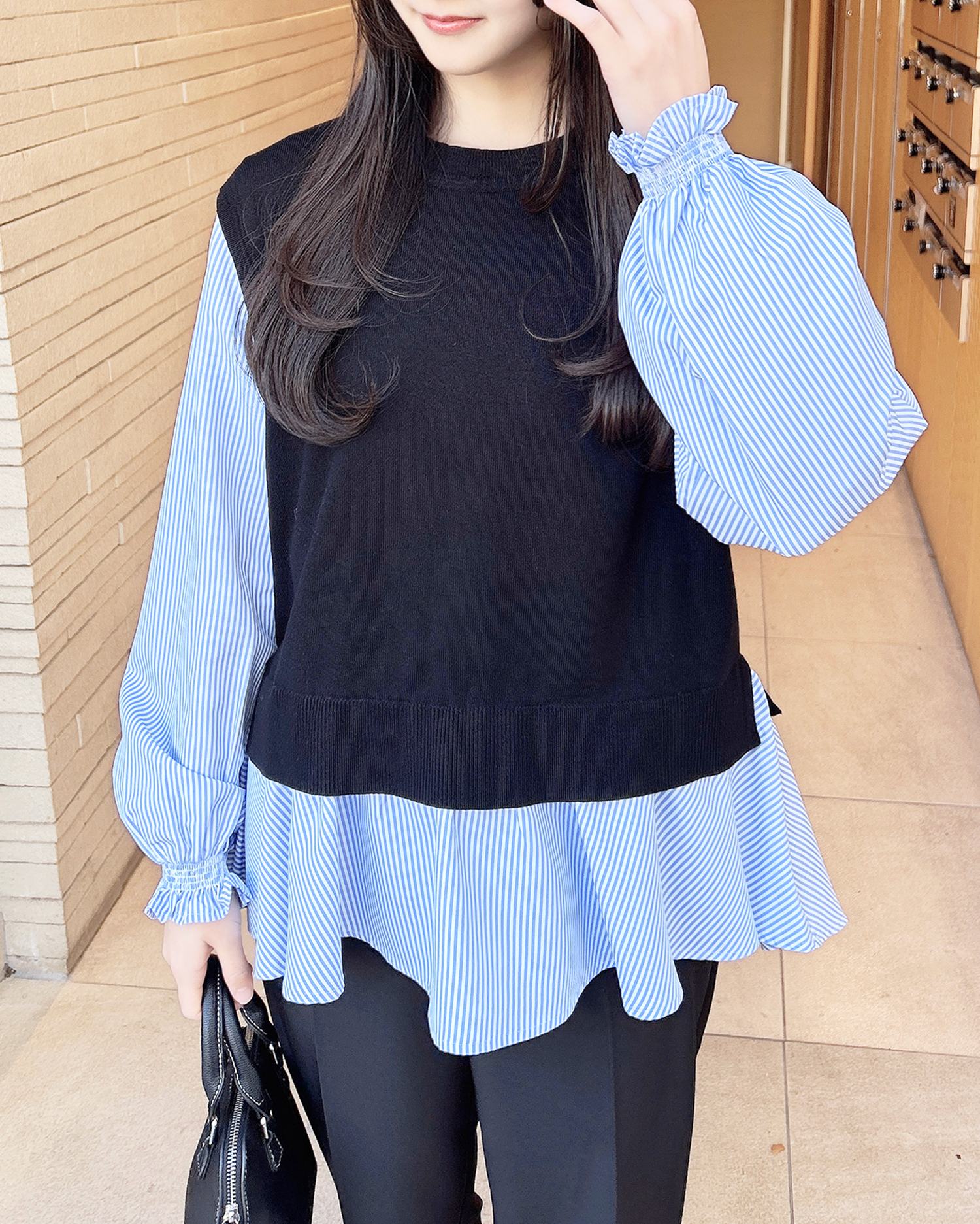 ロング丈のシャツにニットを重ね着したようなドッキングデザインが◎。