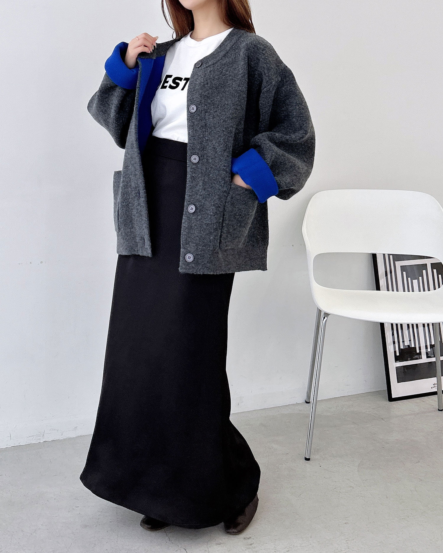 お好みの幅で袖口を折り返し、バイカラーをアクセントにした着こなしを楽しんで。
