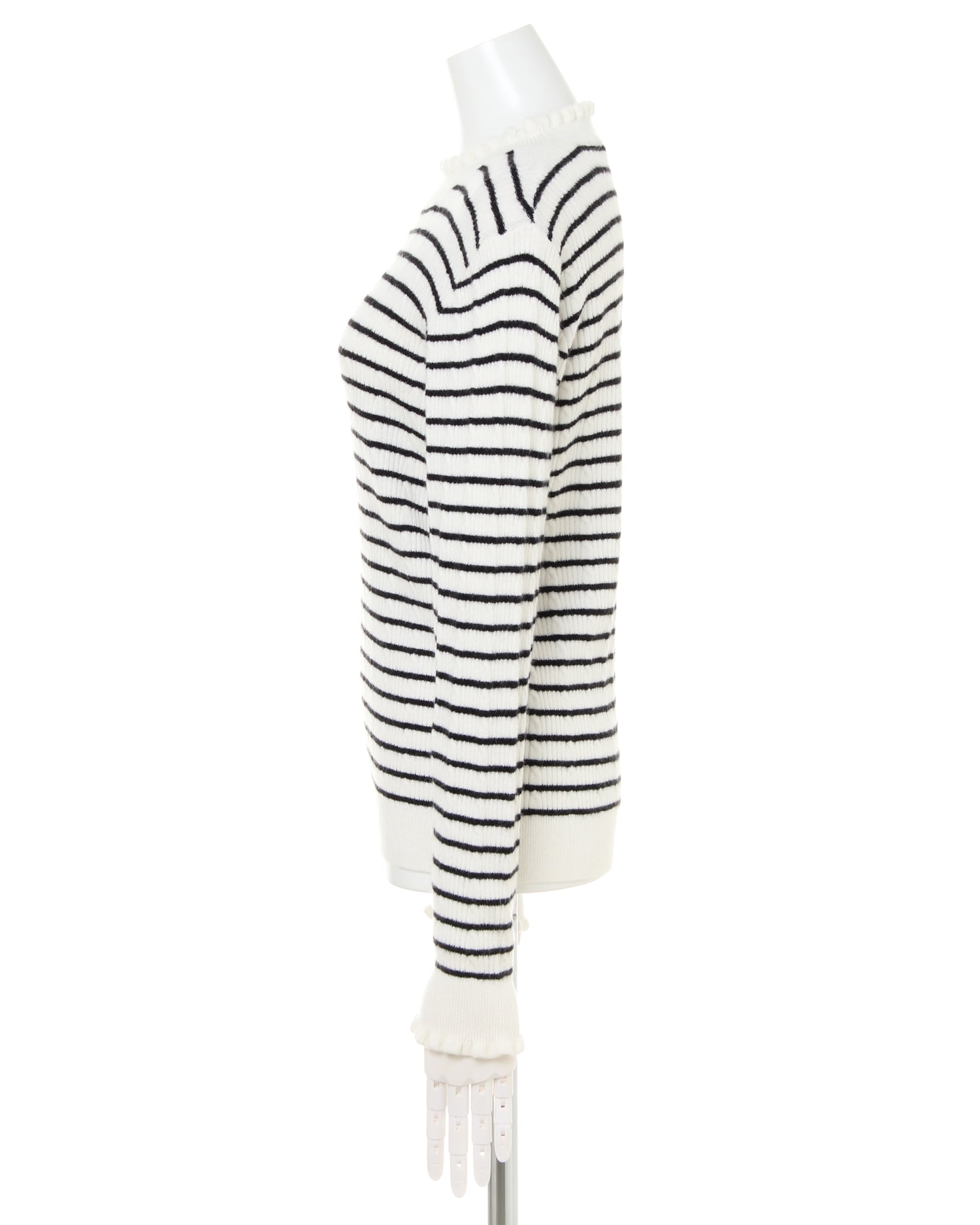 ローゲージ風の控え目なケーブル編みが清楚な雰囲気のトップス。ハイネック部分と袖口のさりげないフリル使いが、大人の可愛さを演出します。柔らかく伸縮性の高い生地は、心地良い肌触りで着心地抜群。コーデに合わせやすいデザインなので、これからの季節に押さえておきたいワンアイテム。色違いで揃えたくなる豊富なカラー展開にも注目です。