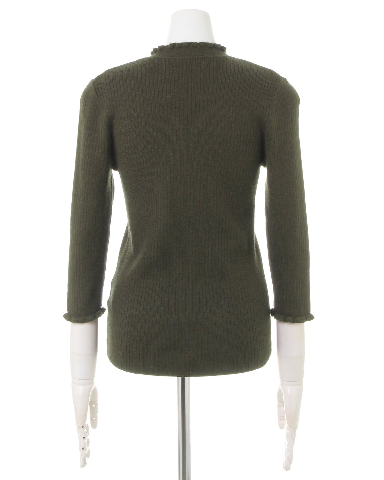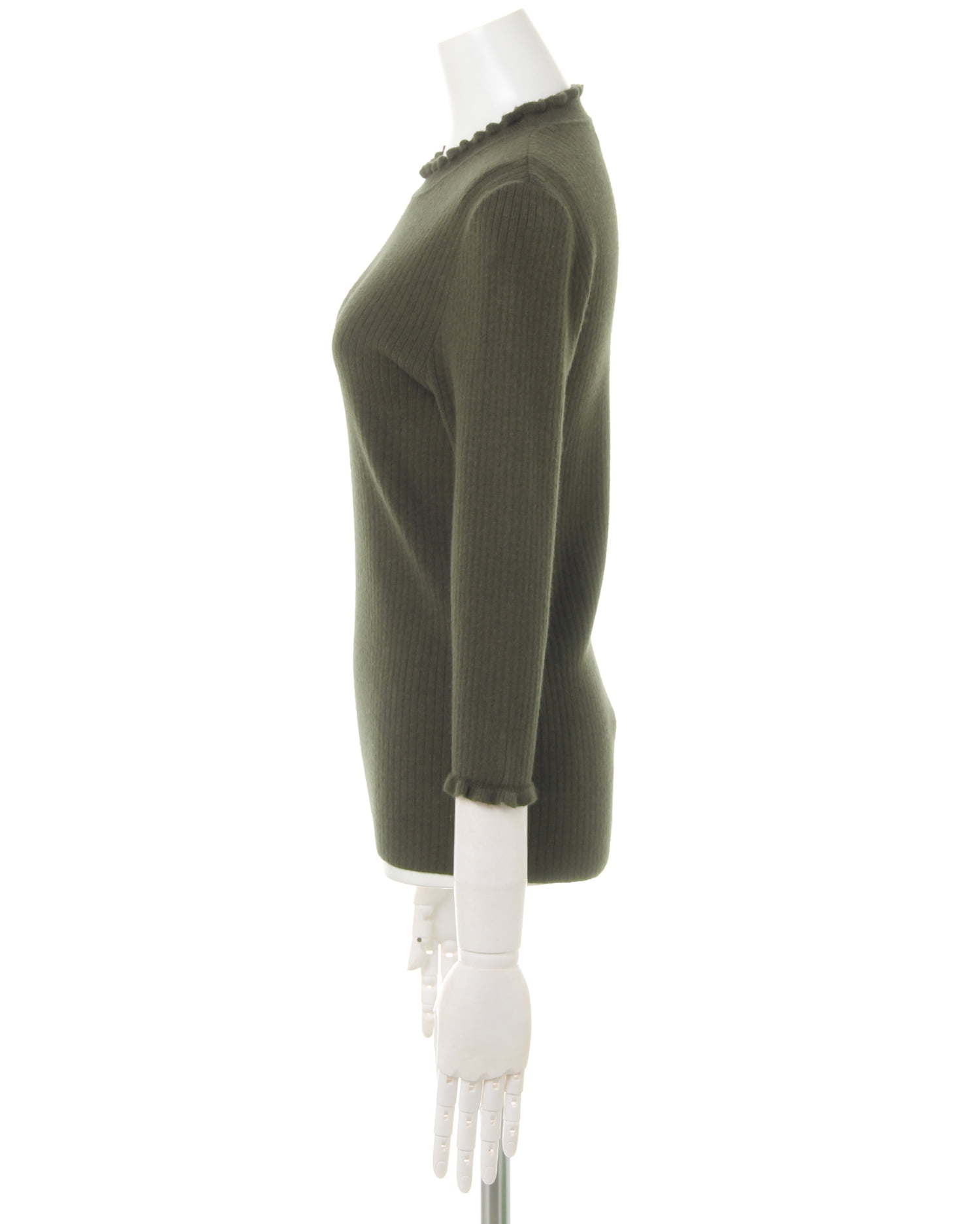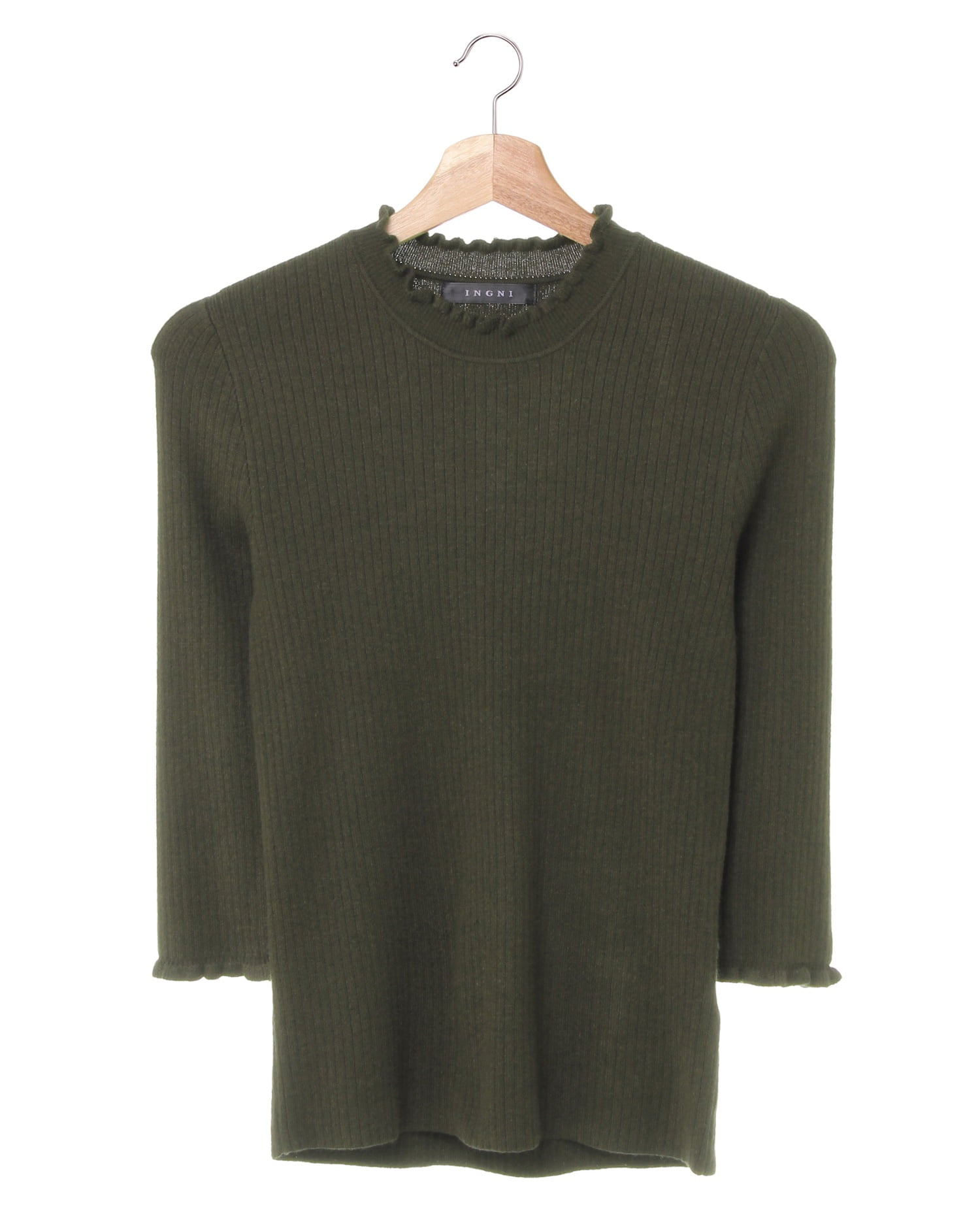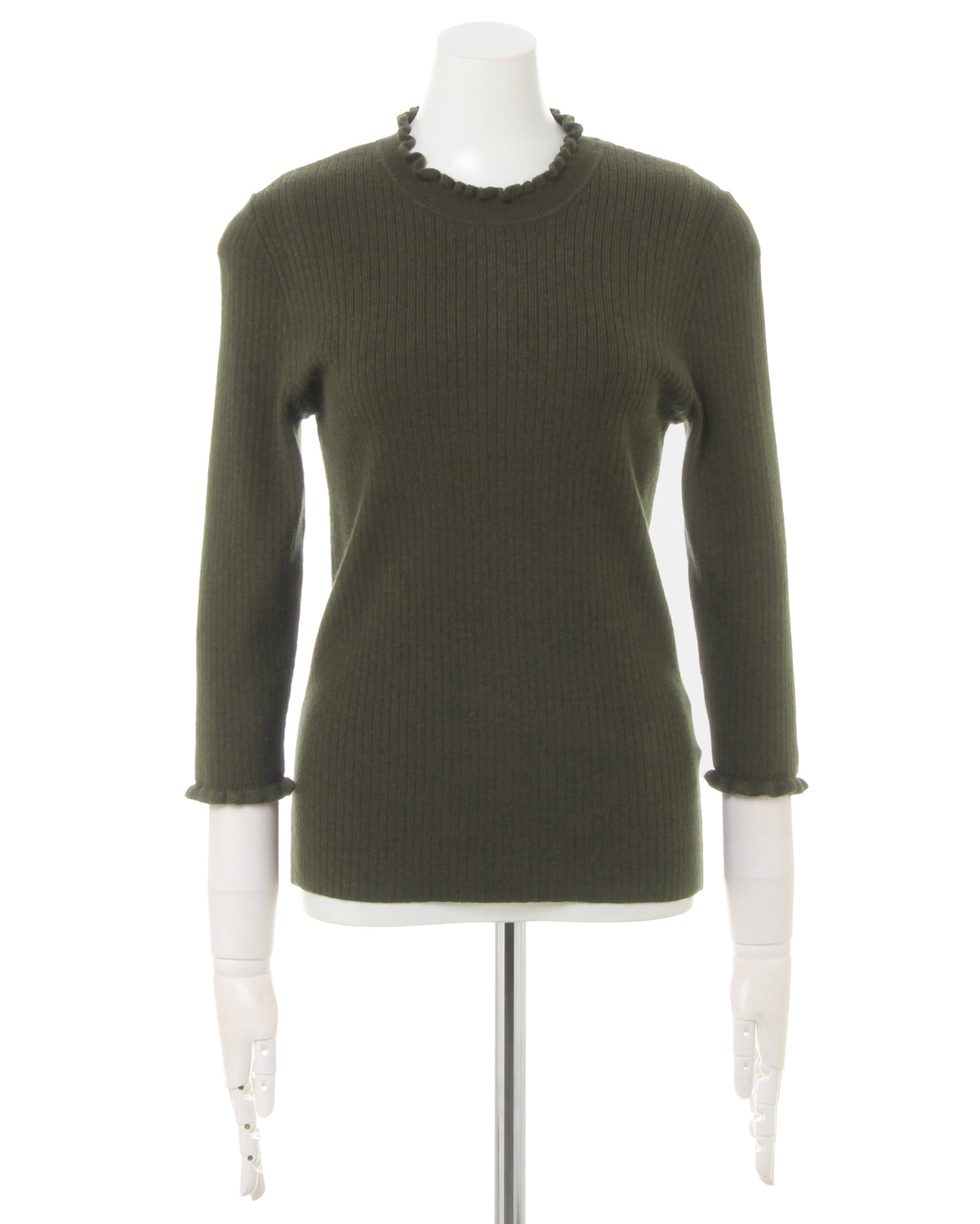 シンプルなリブニットにフリルをあしらいフェミニンに仕上げたオススメの1枚。単品でもインにも合わせやすいベーシックなシルエットで、オンオフ問わずに活躍します。しなやかで伸縮性のある生地が快適な着心地を実現。袖は短めの7分袖なので、ジャケットの袖口から出ないのも使いやすいポイントです。ボディに沿うコンパクトなシルエットでスタイルアップも◎。