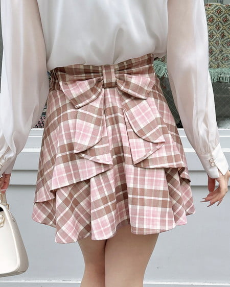 バックリボンチェック柄フレアスカパン