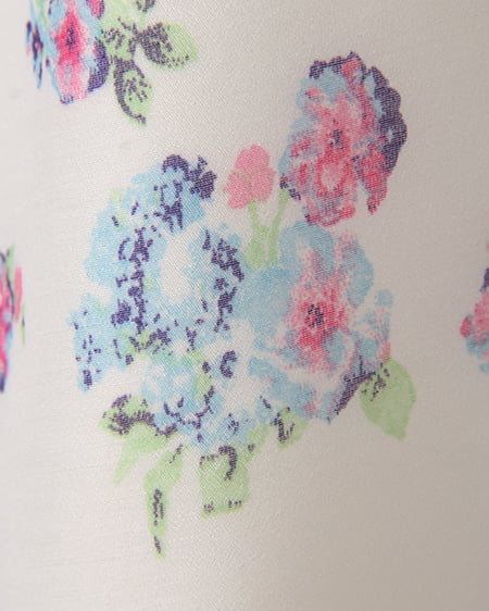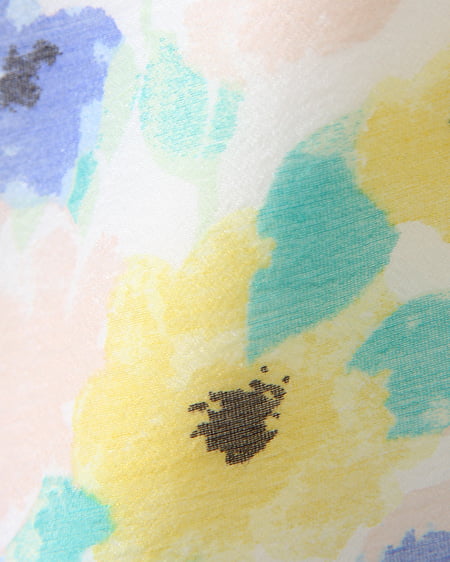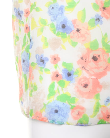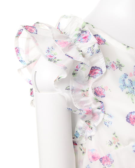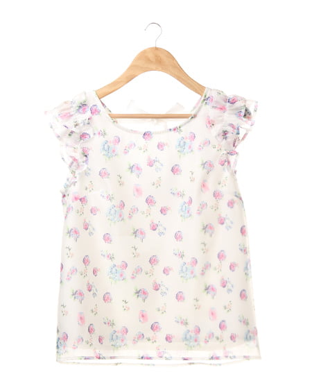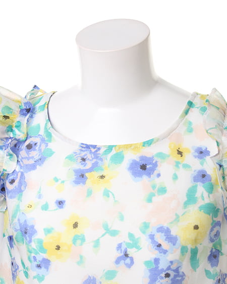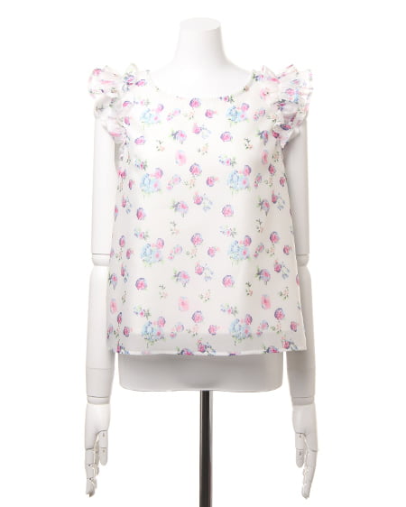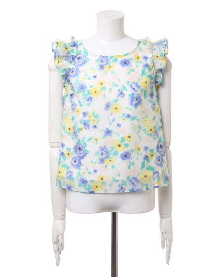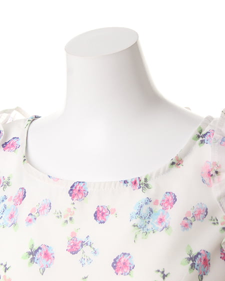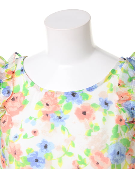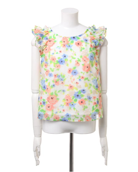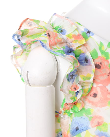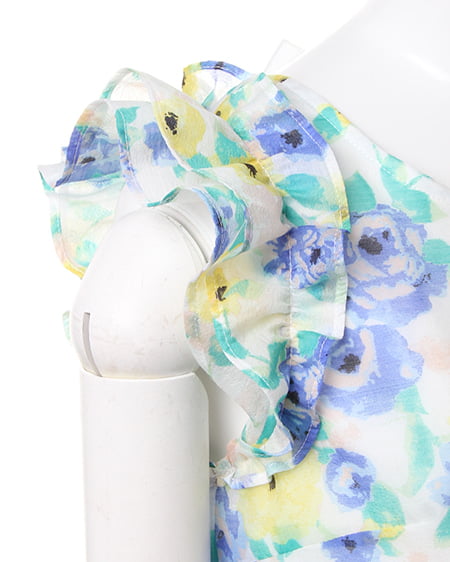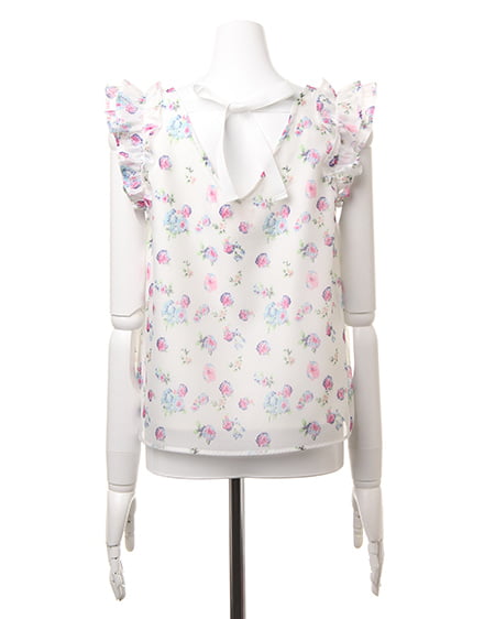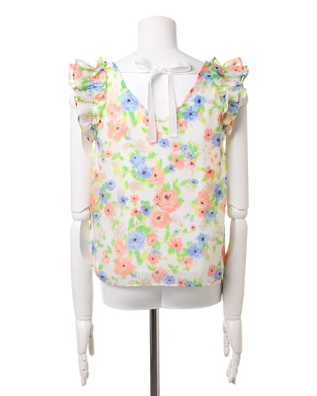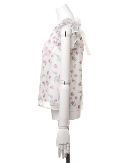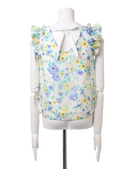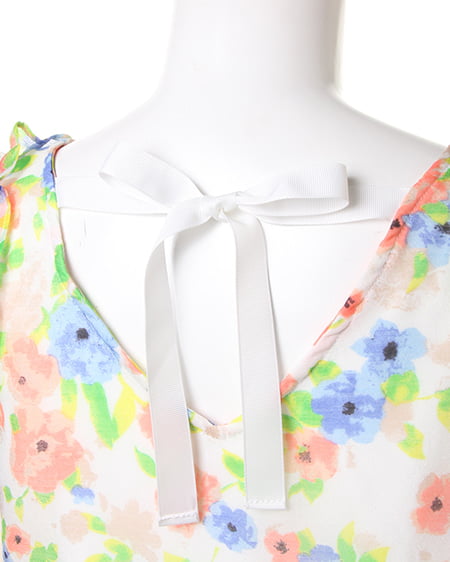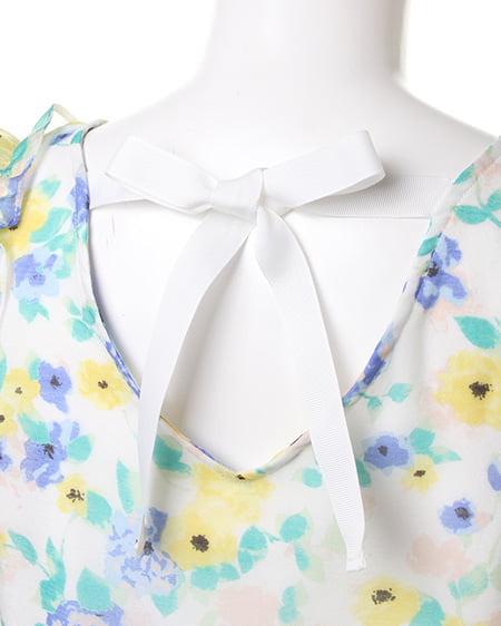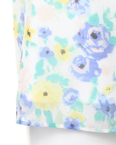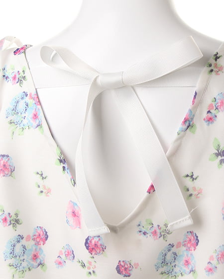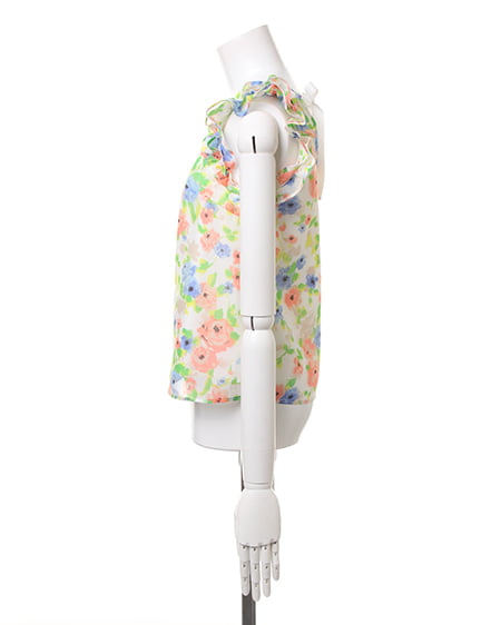 涼感をプラスした華やかトップス。着こなしやすいコンパクトシルエットのノースリブブラウスは花柄をあしらった女性らしい一着。広めの衿開きでデコルテラインをキレイに見せてくれすっきりとした印象です。バックネックにはリボンをあしらいアクセントに。裏地付きで透ける心配もありません。パンツやスカートなどアイテムを選ばず着られる万能さも魅力です。