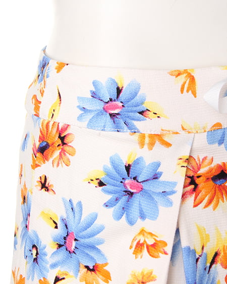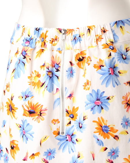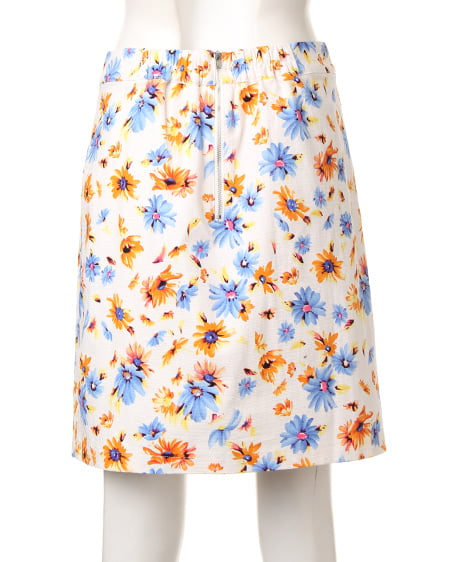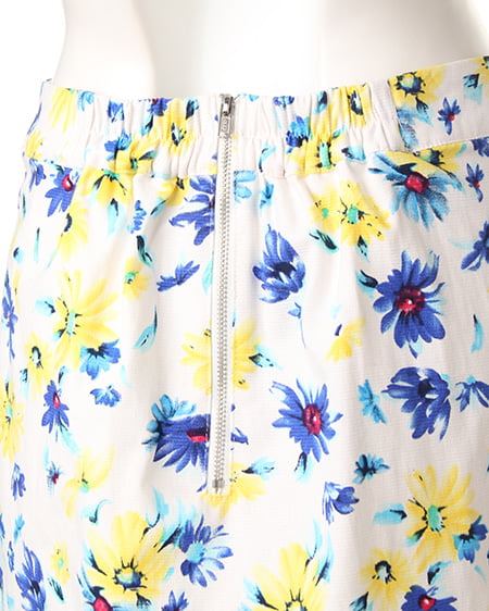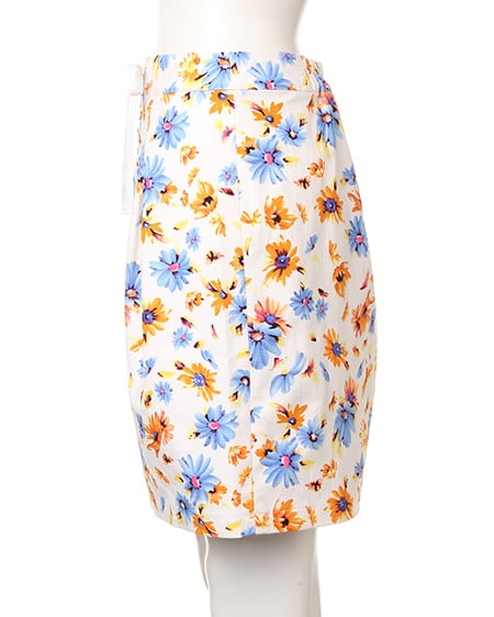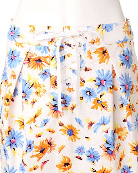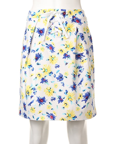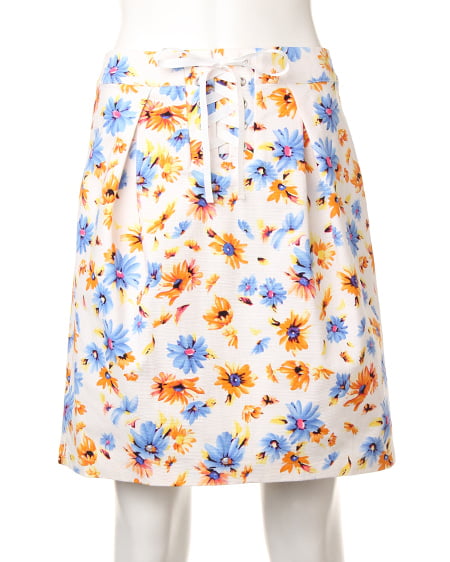 爽やかな色使いがポイントのフラワープリントスカート。フロントのレースアップデザインで今年らしい印象に。程よくタイトに仕上げたフォルムはレディーライクにも着られ、合わせるアイテム次第で幅広く活用できます。