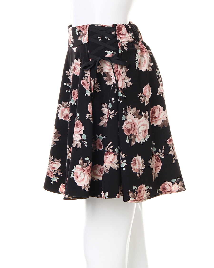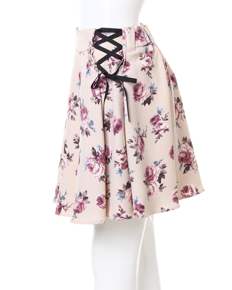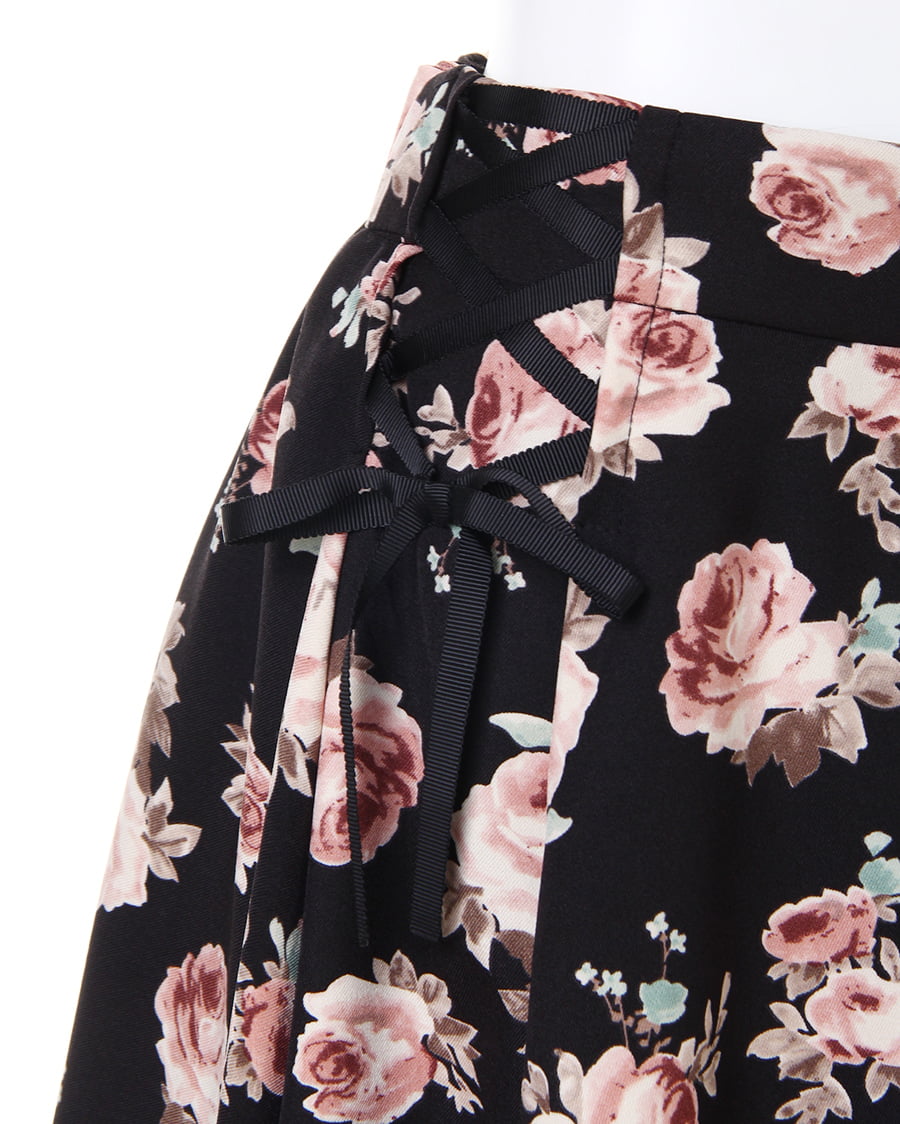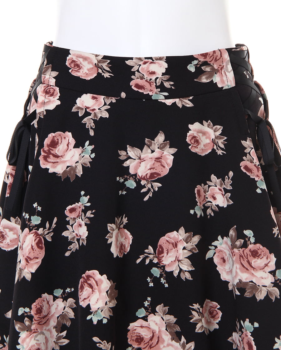 クラシカルなバラ柄をのせた生地を、フレアシルエットに落とし込んだスカート。ふんわり広がるデザインで、ガーリーな印象。トップスをインしてきたときも、サイドのレースアップがポイントに◎。バックウエストのゴムが、ストレスフリーな着心地を実現。しっとり滑らかな裏地を付けているので、防寒性も期待できます。