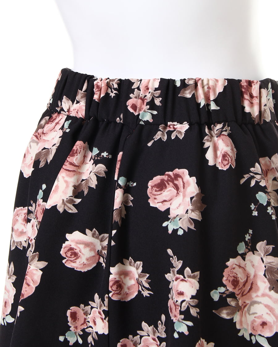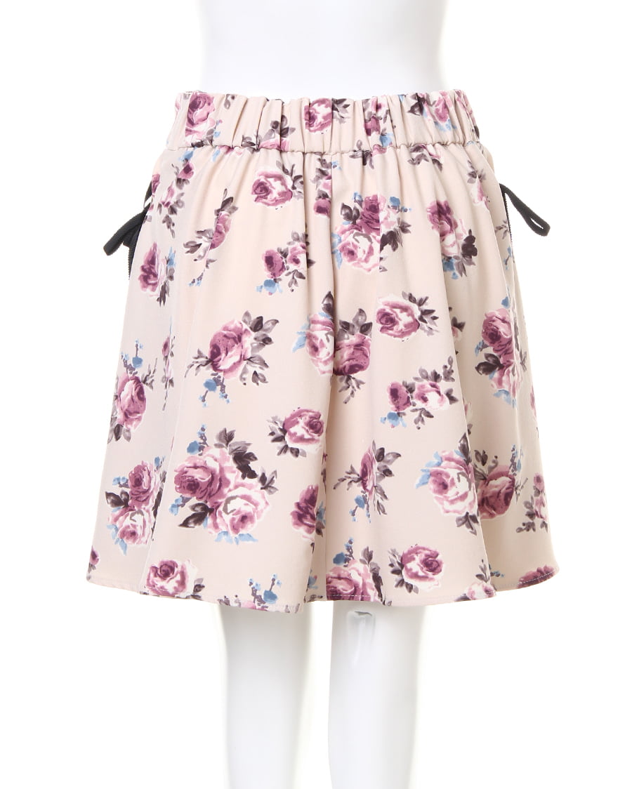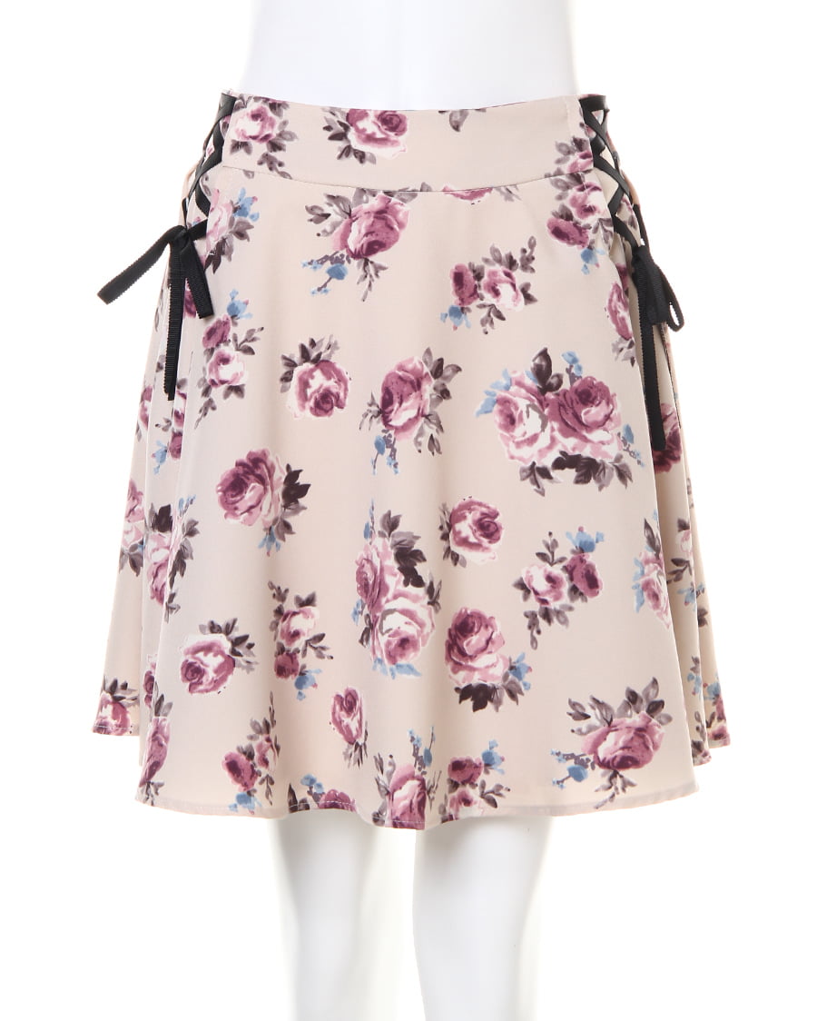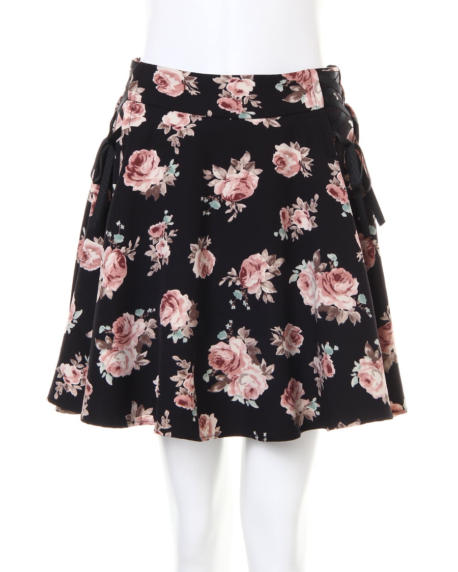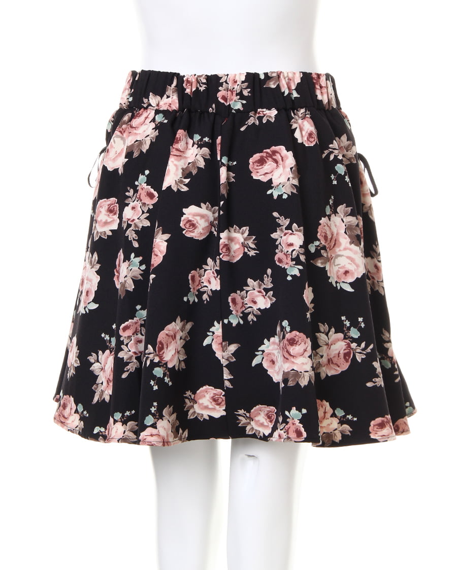 クラシカルなバラ柄をのせた生地を、フレアシルエットに落とし込んだスカート。ふんわり広がるデザインで、ガーリーな印象。トップスをインしてきたときも、サイドのレースアップがポイントに◎。バックウエストのゴムが、ストレスフリーな着心地を実現。しっとり滑らかな裏地を付けているので、防寒性も期待できます。