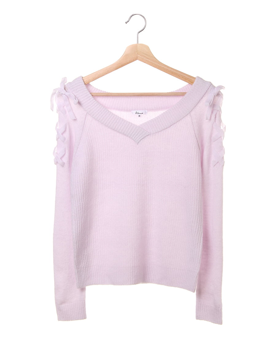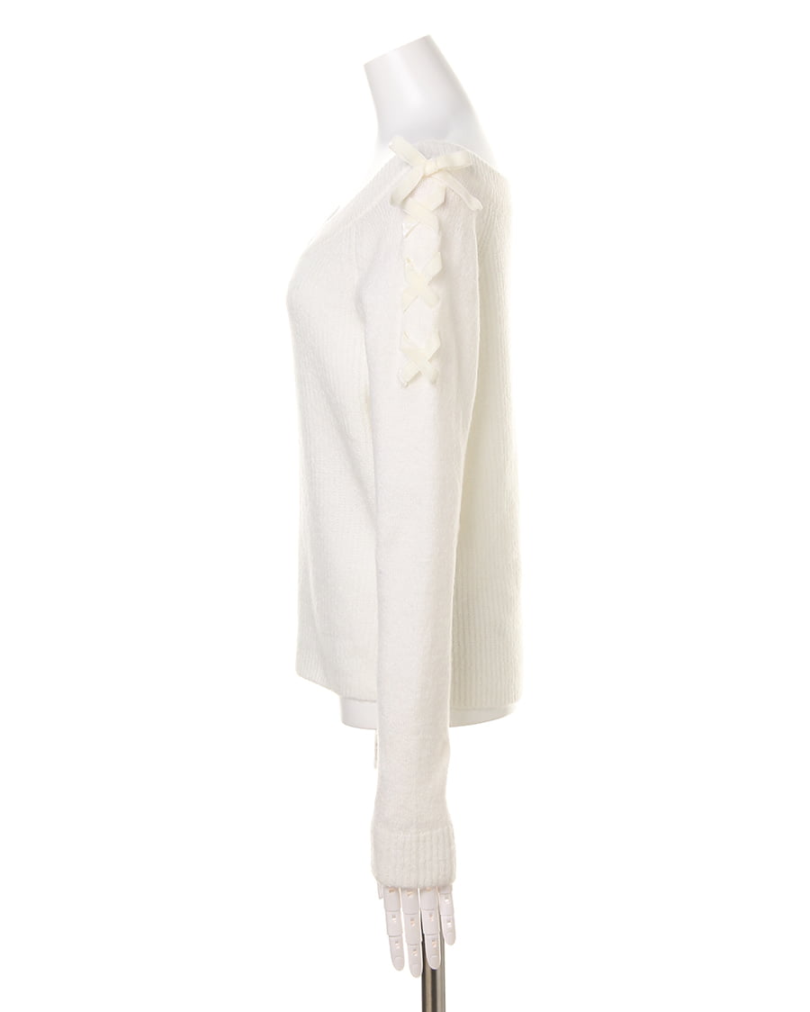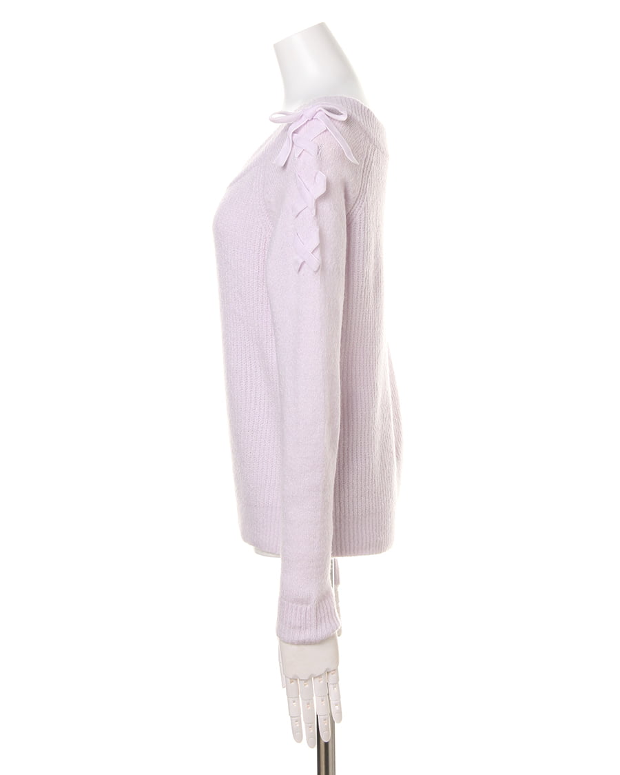すっきり開いた首元やショルダーに施したレースアップ、旬の要素が詰まったニット。身頃は縦シルエットな上品な表情をつけ、袖はすっきり仕立てたニュアンスのある一枚。デコルテラインを広めに設定したデザインは小顔効果も期待できる優秀アイテム。薄手の素材は、アウターのインナーとしてももたつかないのでロングシーズン重宝します。