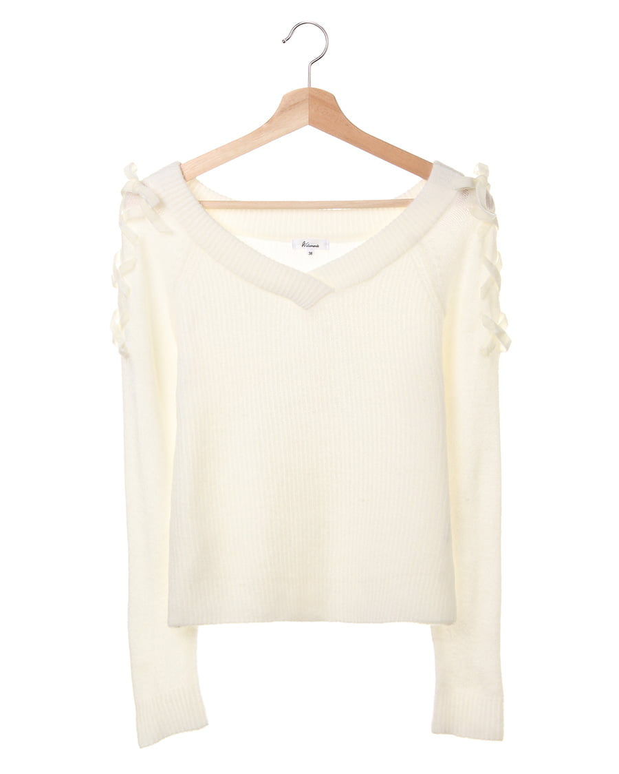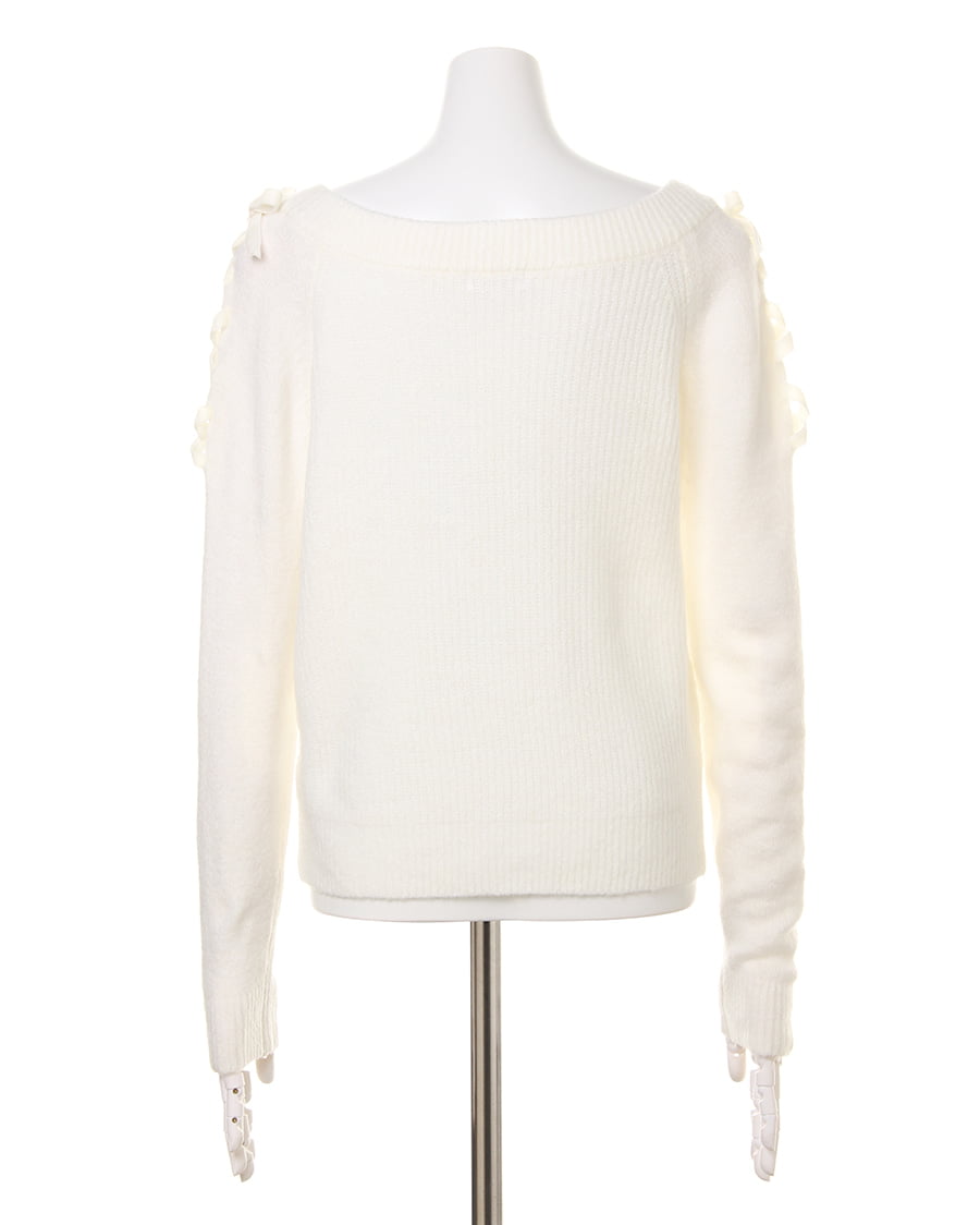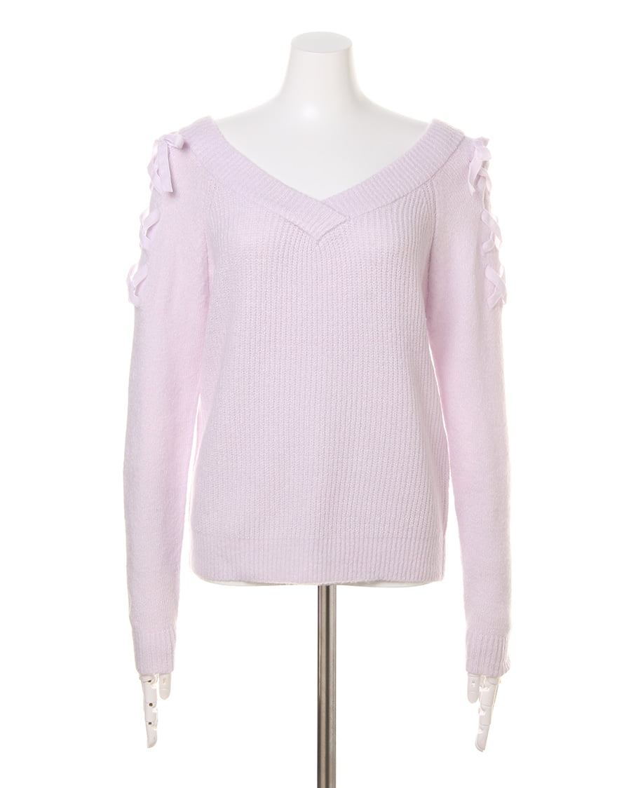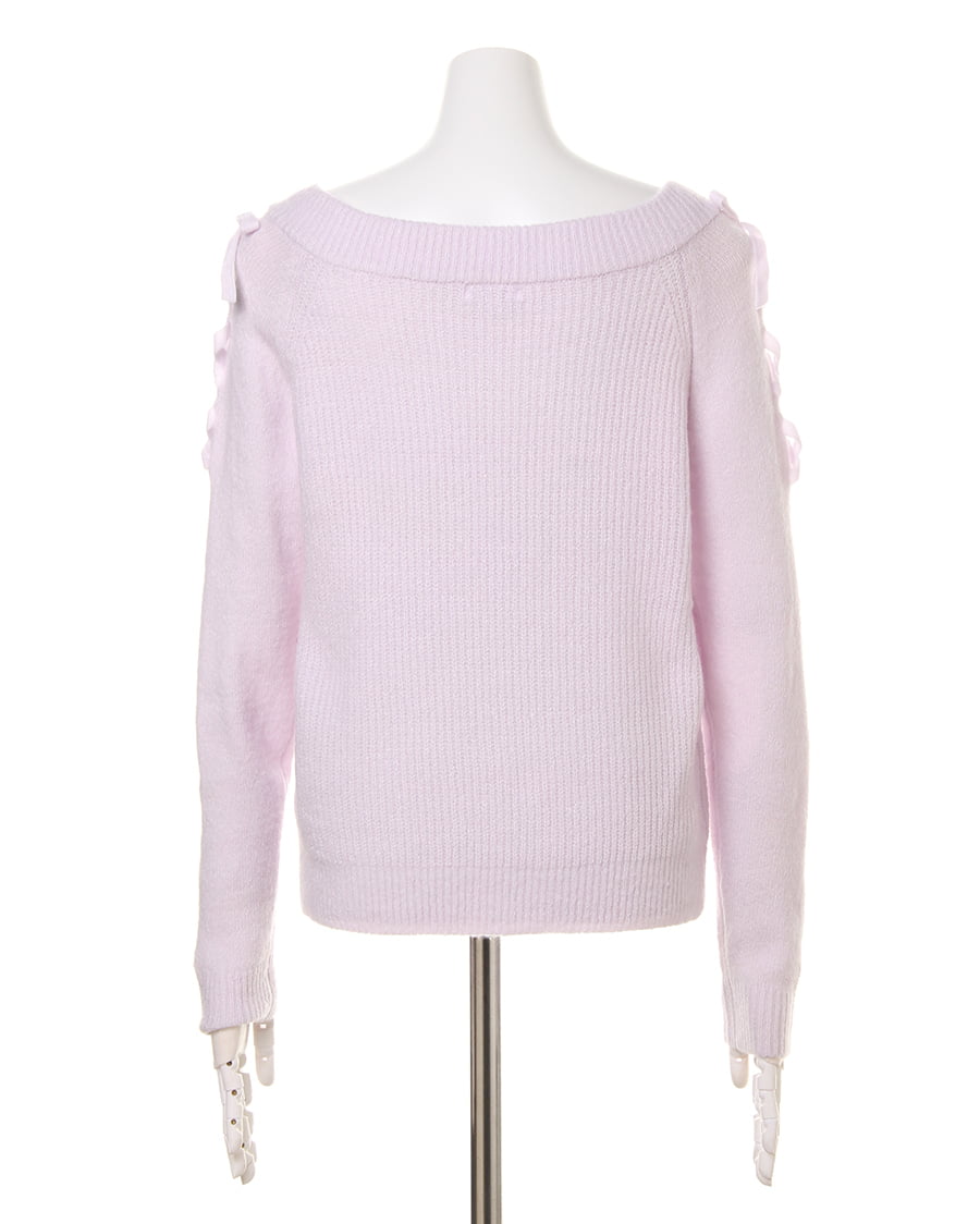 すっきり開いた首元やショルダーに施したレースアップ、旬の要素が詰まったニット。身頃は縦シルエットな上品な表情をつけ、袖はすっきり仕立てたニュアンスのある一枚。デコルテラインを広めに設定したデザインは小顔効果も期待できる優秀アイテム。薄手の素材は、アウターのインナーとしてももたつかないのでロングシーズン重宝します。