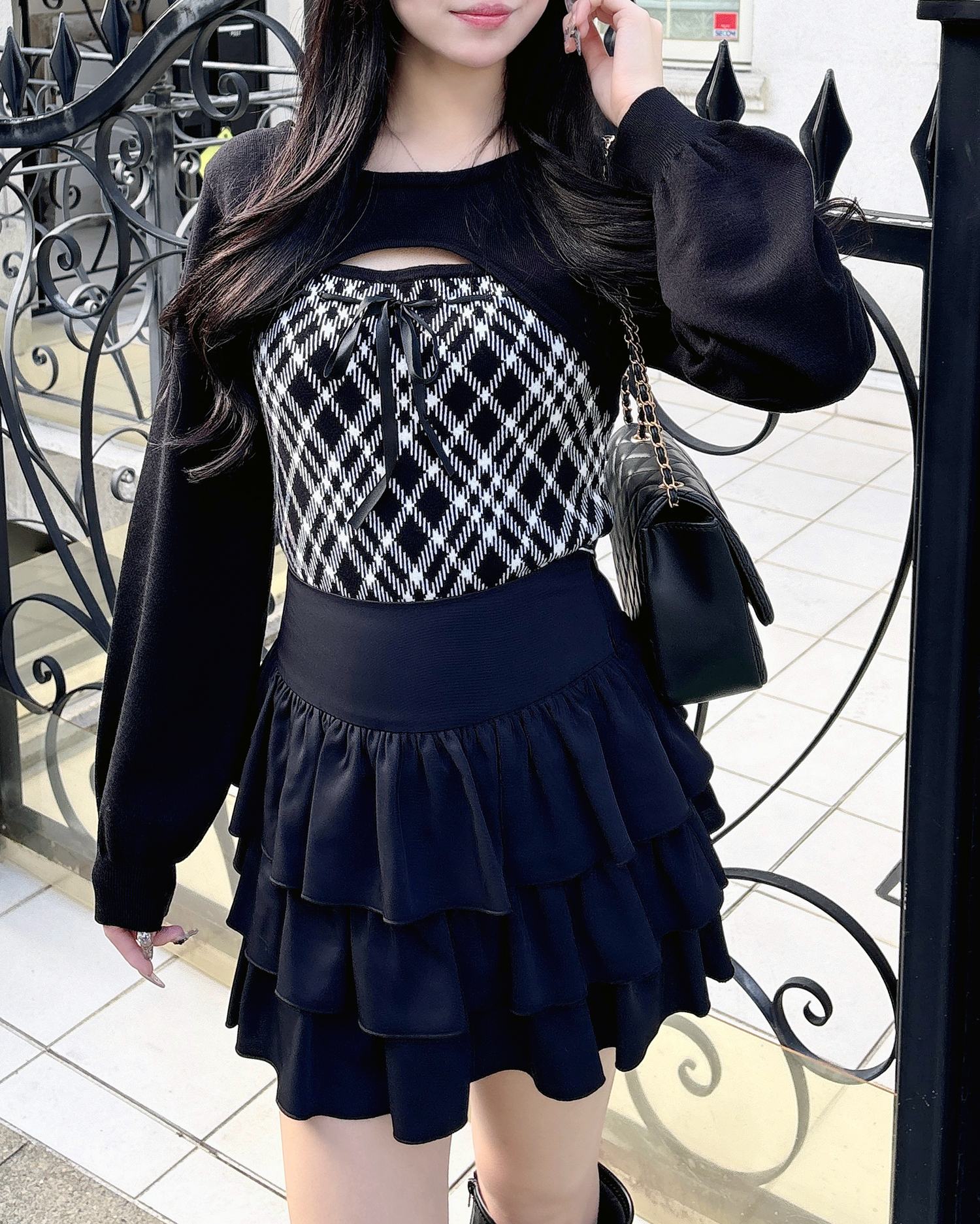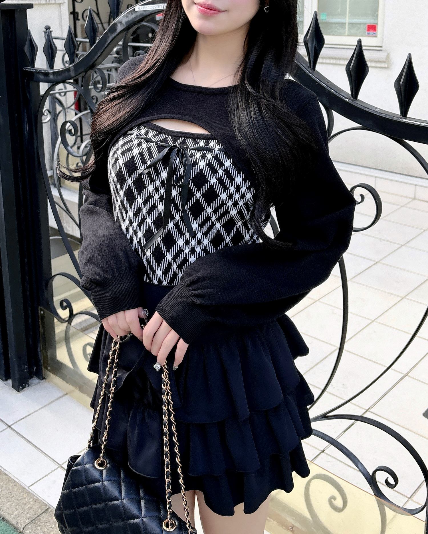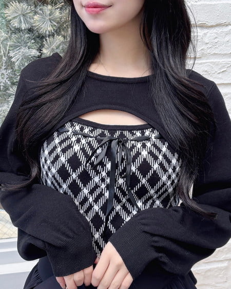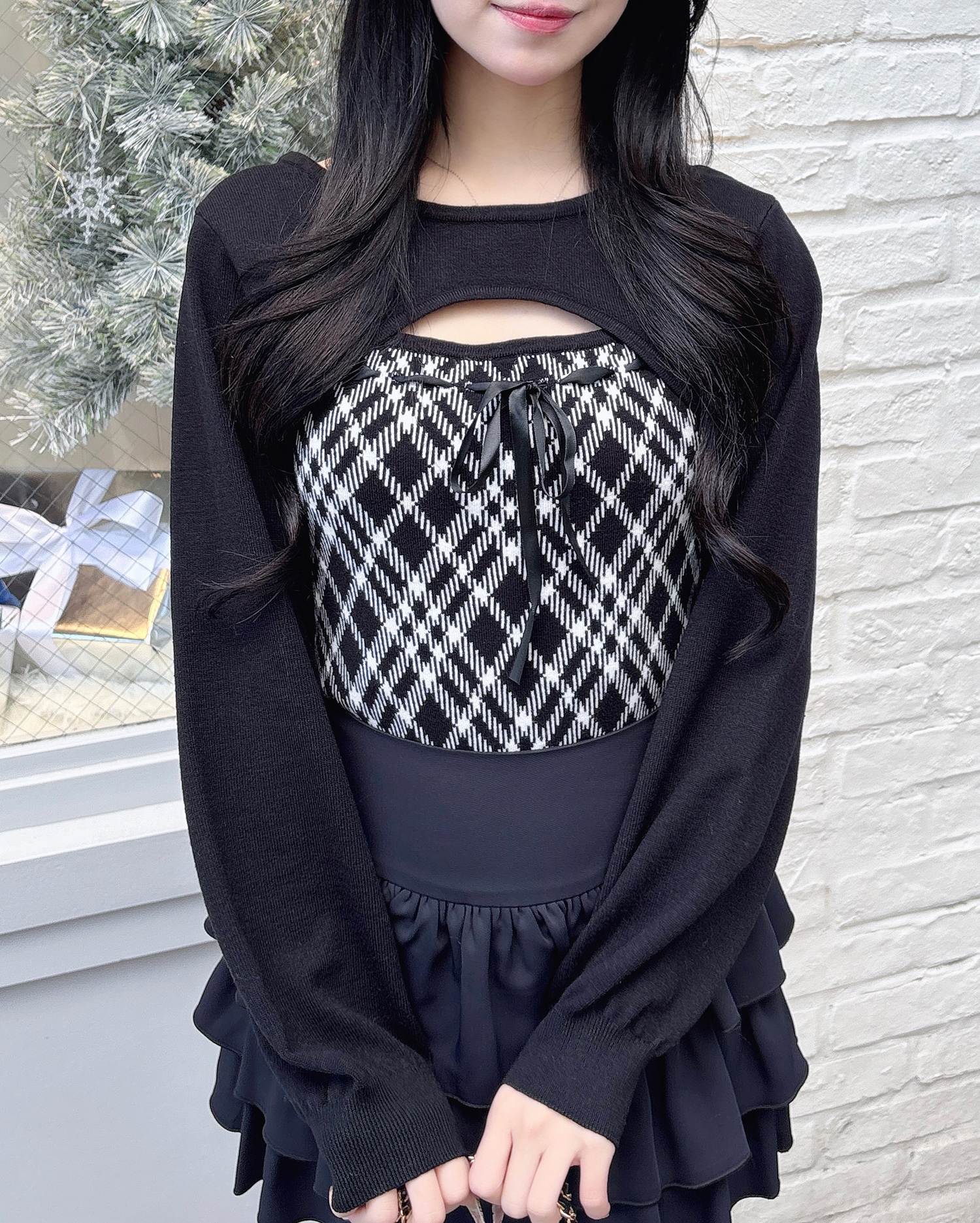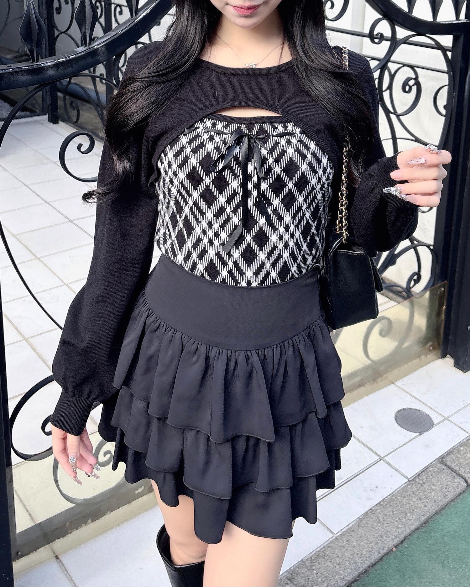 胸元のリボンとチェック柄がコーデのアクセントになり、これを着るだけで