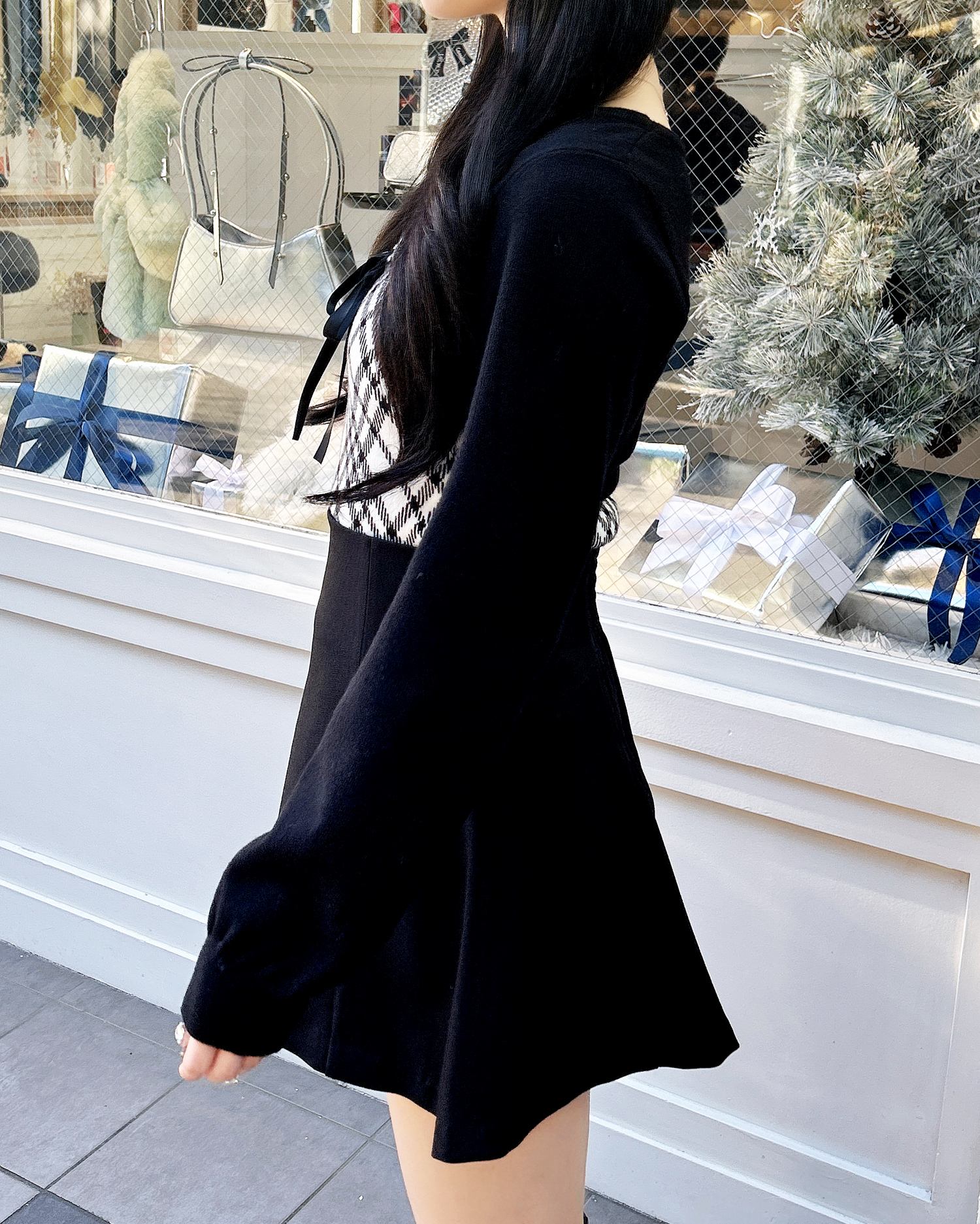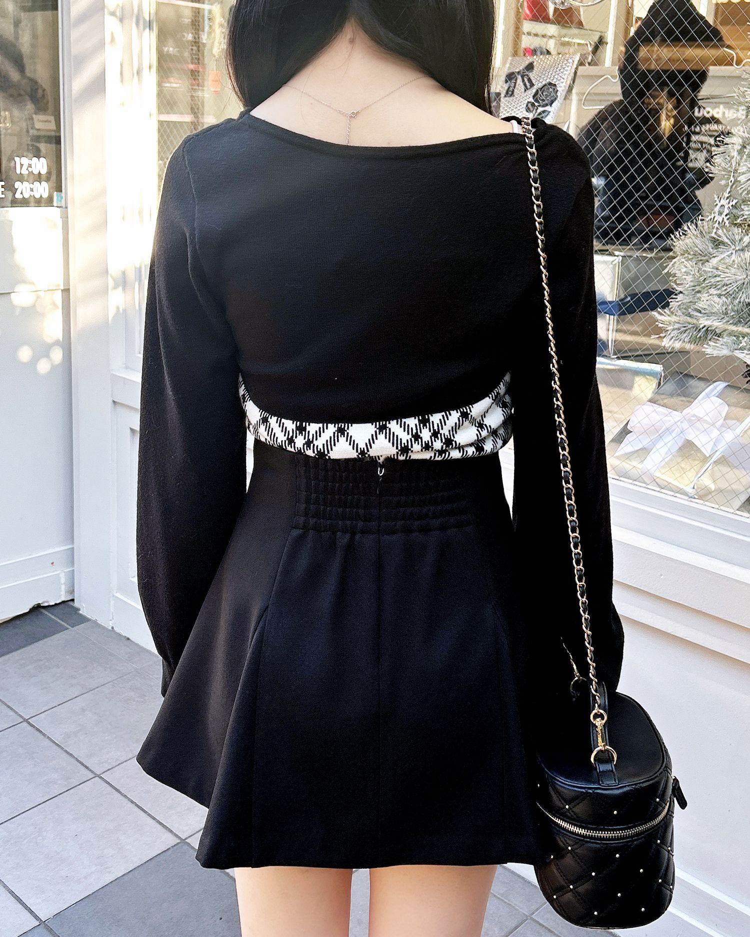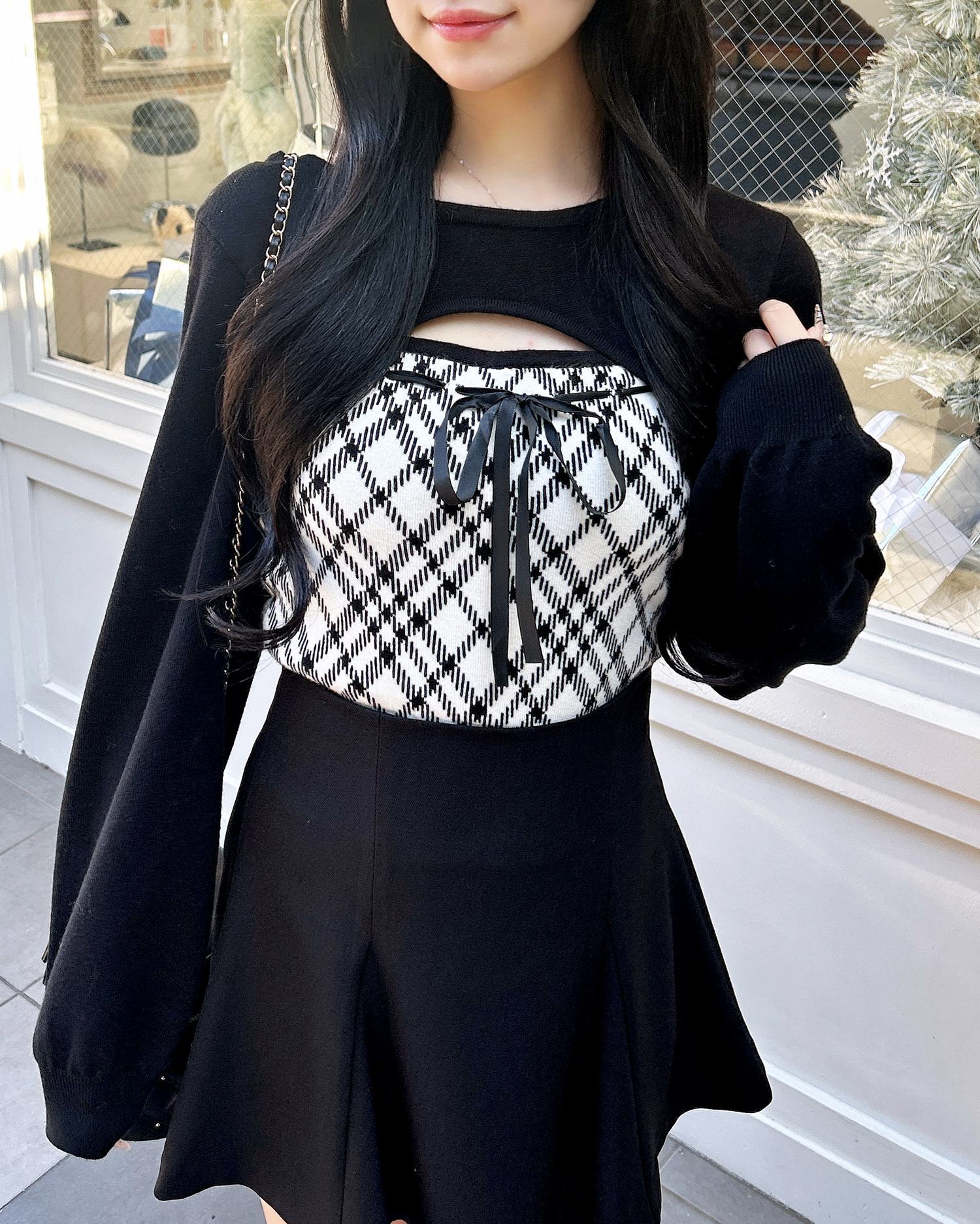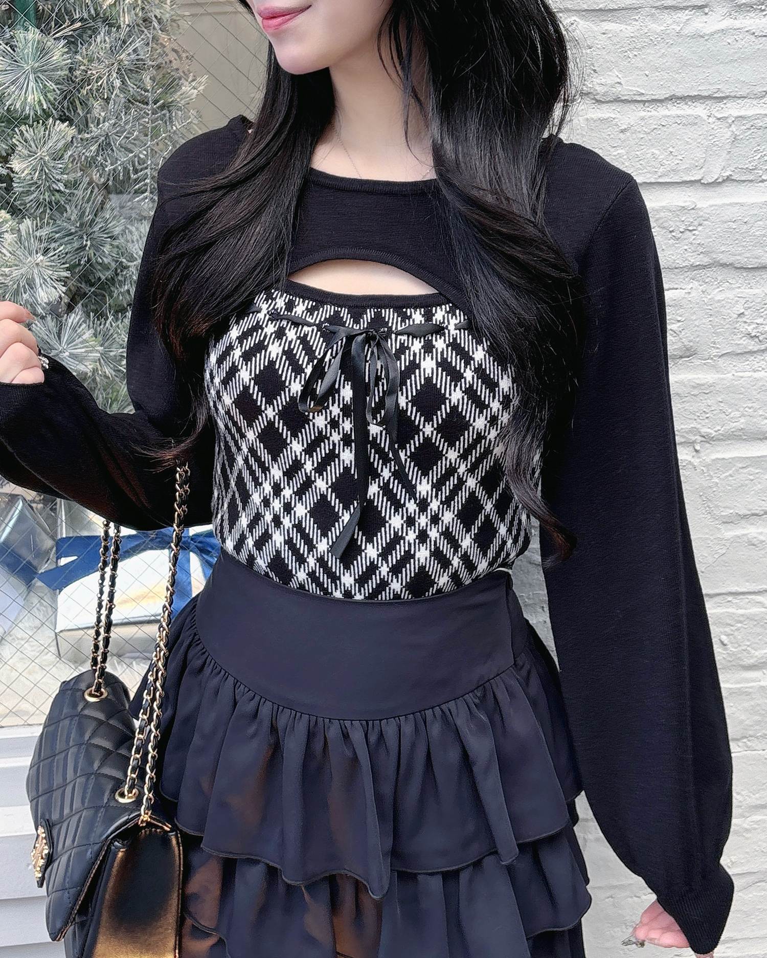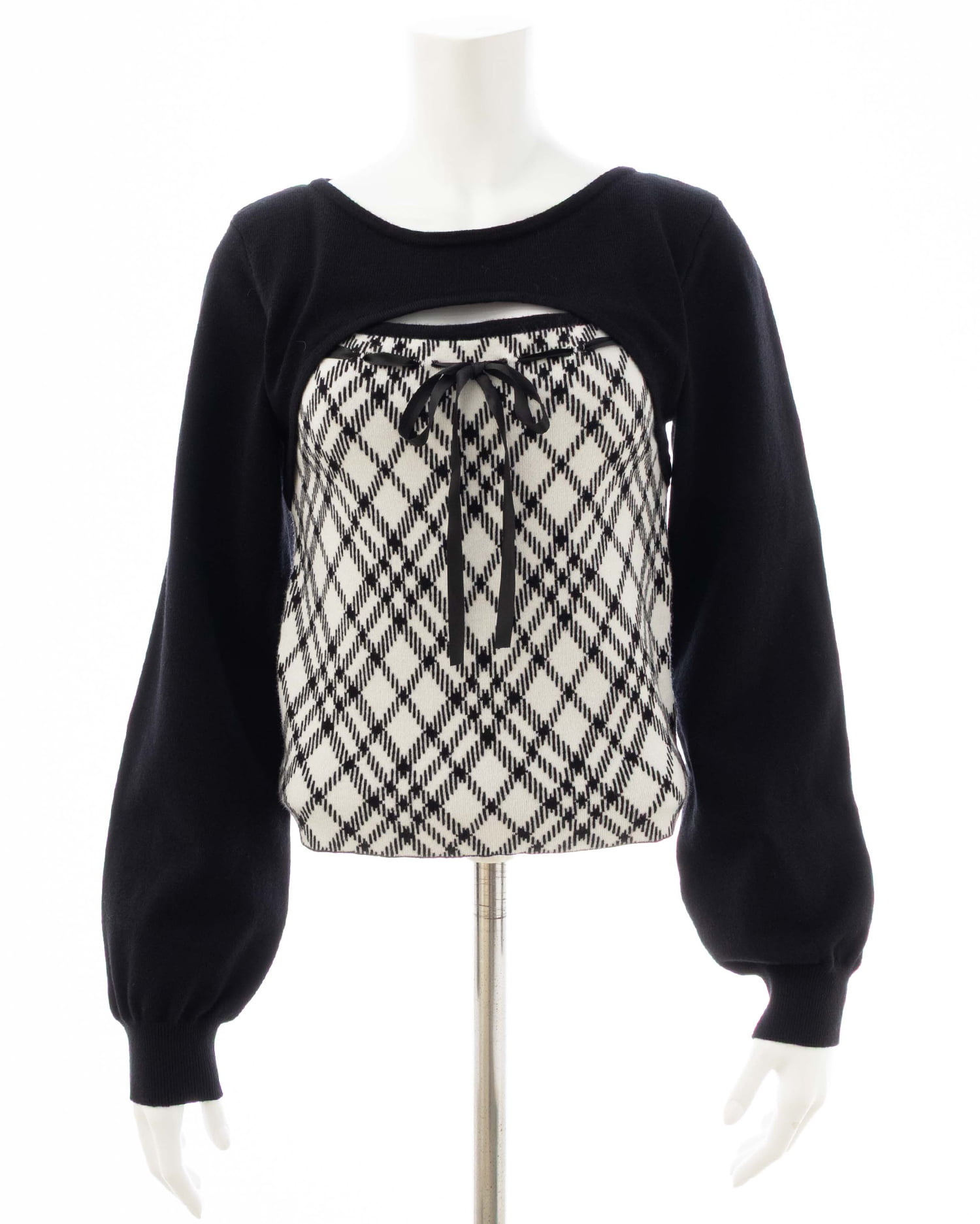 胸元のリボンとチェック柄がコーデのアクセントになり、これを着るだけで