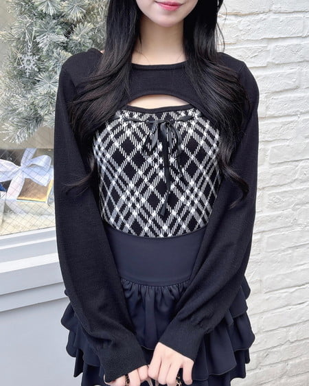 チェック柄デコルテオープンニット