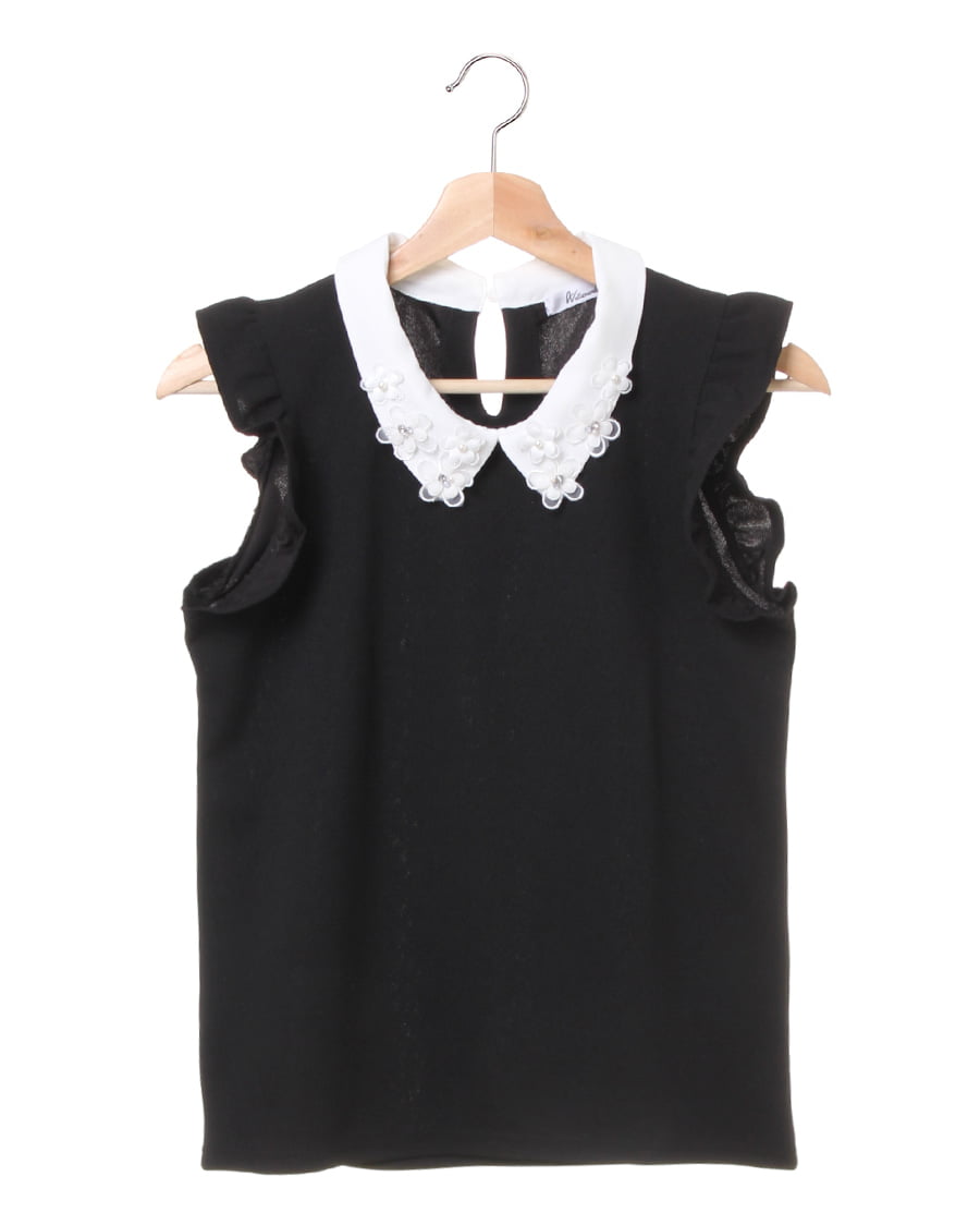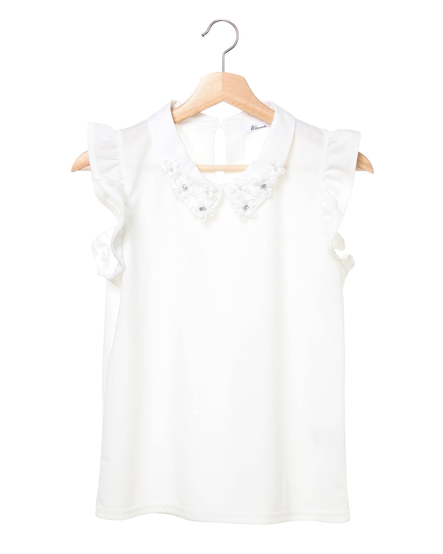 襟付きがきちんと感ある雰囲気のトップスはレースのフラワーモチーフにビジュー装飾をプラスした華やかな1枚。アクセサリー要らずで顔周りを明るく見せてくれます。伸縮性が高く柔らかな生地で着心地も抜群、オンオフ問わずデイリーに使えるオススメな1枚です。袖にはトレンドのフリルを採用。デザイン性が高くコーデの主役アイテムとしても◎。