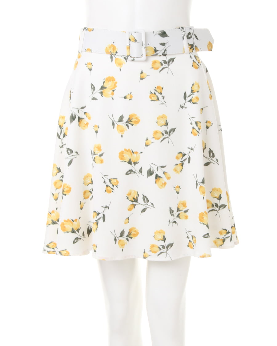 ハリと光沢感のある生地が上品でエレガントなスカート。フィット&フレアシルエットが足をきれいにメイク、可憐な花柄が女性らしい印象を演出します。ベルトのスクエアバックルがきちんと感をプラス、オンオフ問わず使える万能アイテム。バックウエストに入れたゴムで最適なフィット感を実現します。