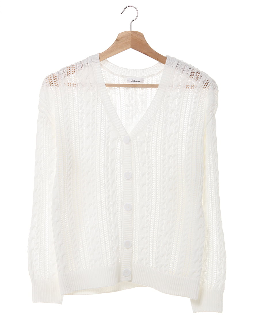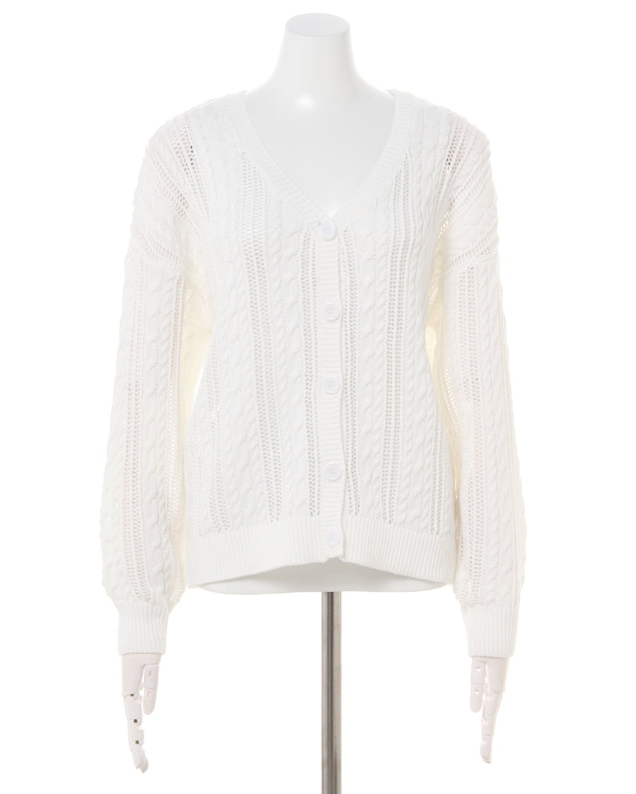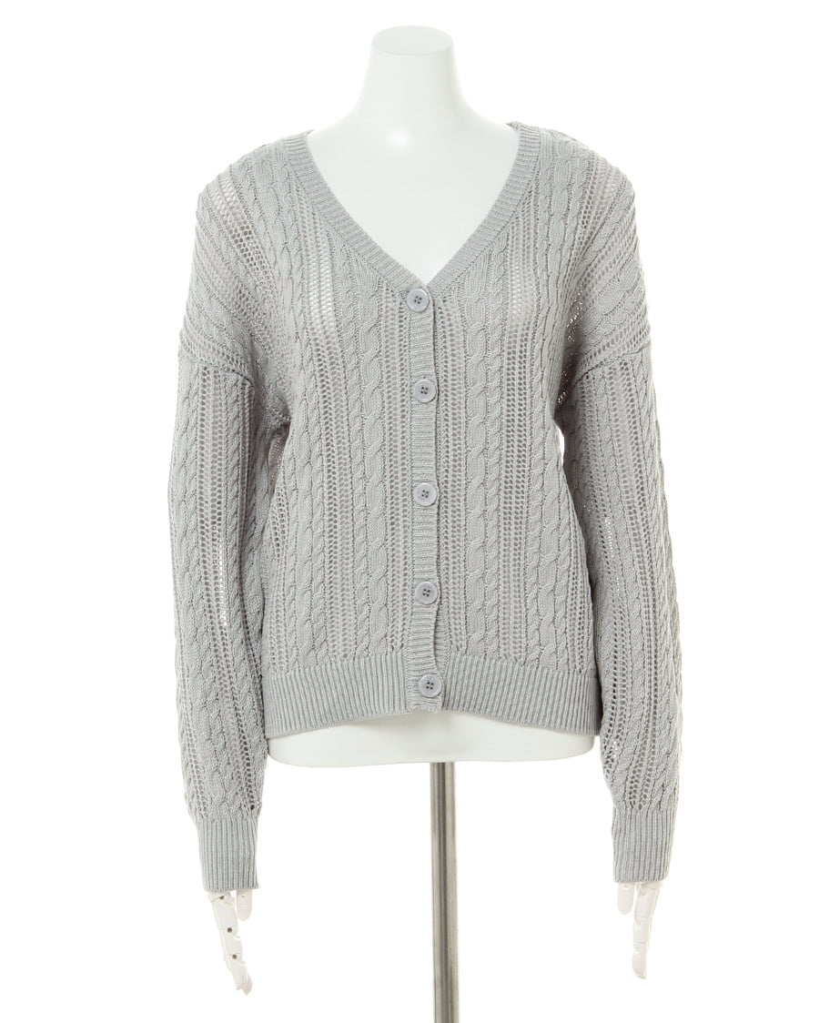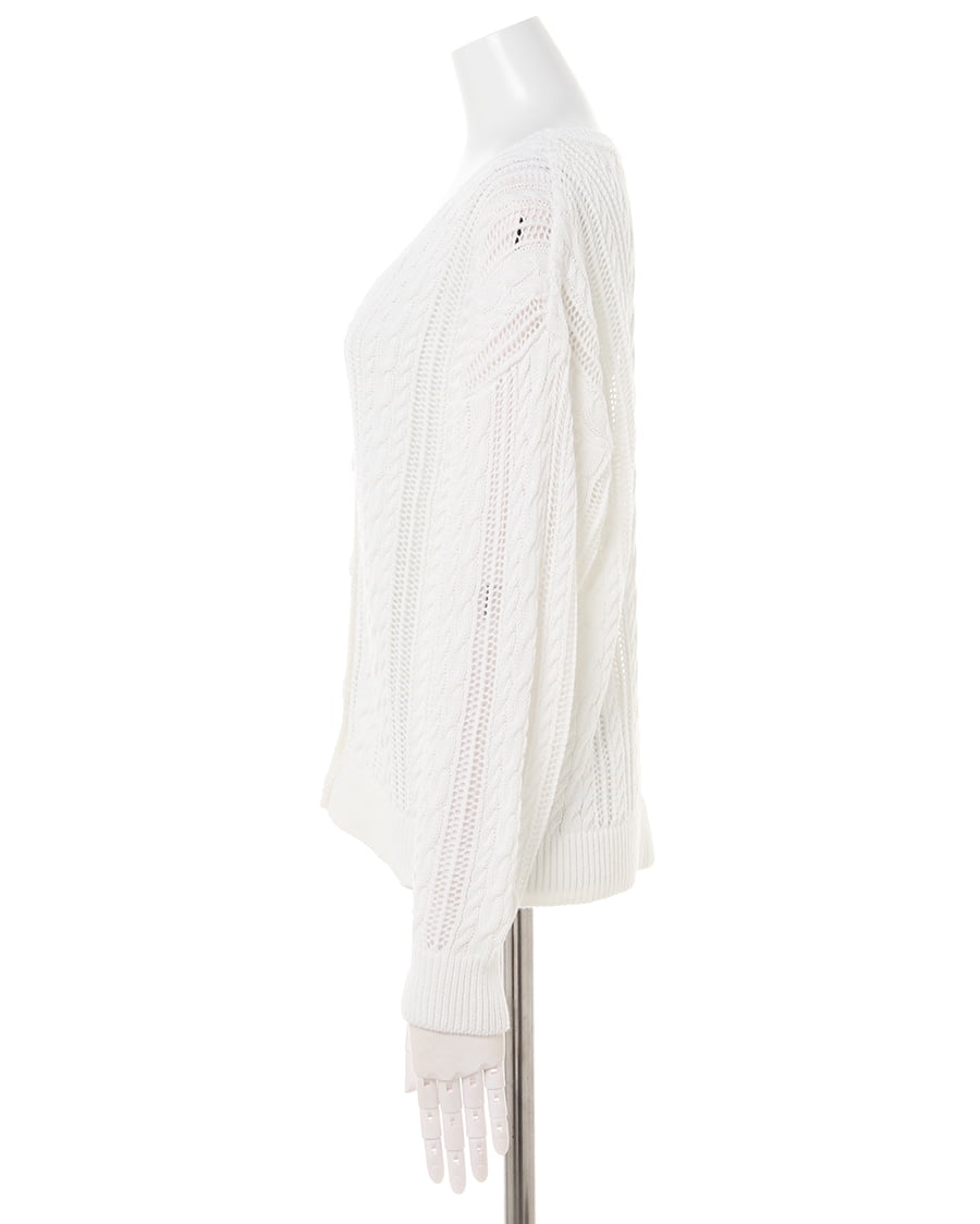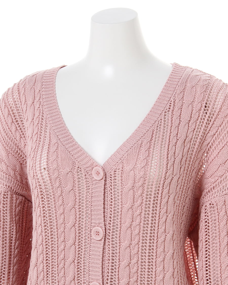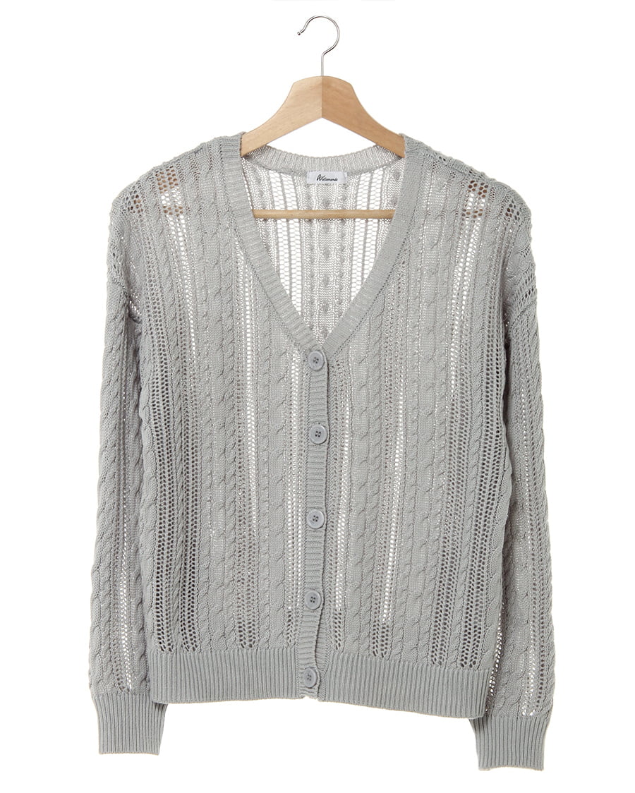 編み地の変化で抜け感のあるスタイルを叶えるVネックカーディガン。ケーブル編みと透け感ある編地のコントラストがレディな雰囲気を演出。フロントにはコロンと丸いフォルムのボタンをアクセントにして、クラシカルに仕上げています。インナーとのカラーコントラストで様々なスタイルを実現。上品なカラーラインナップでオンオフ問わずに着回せます。