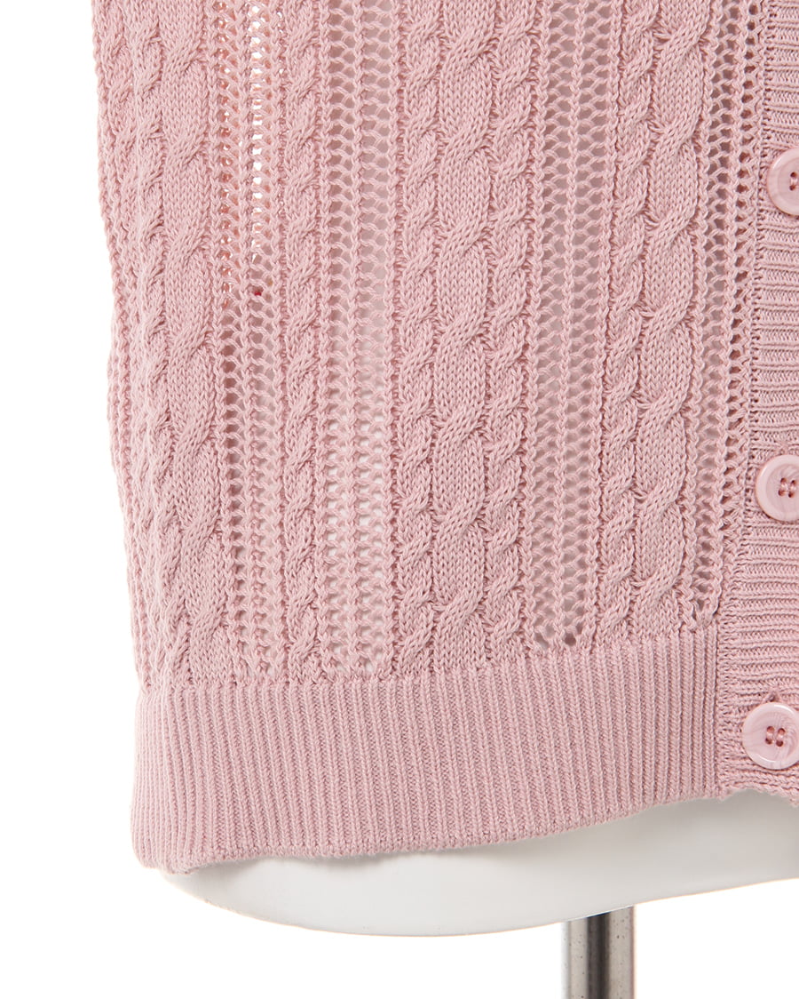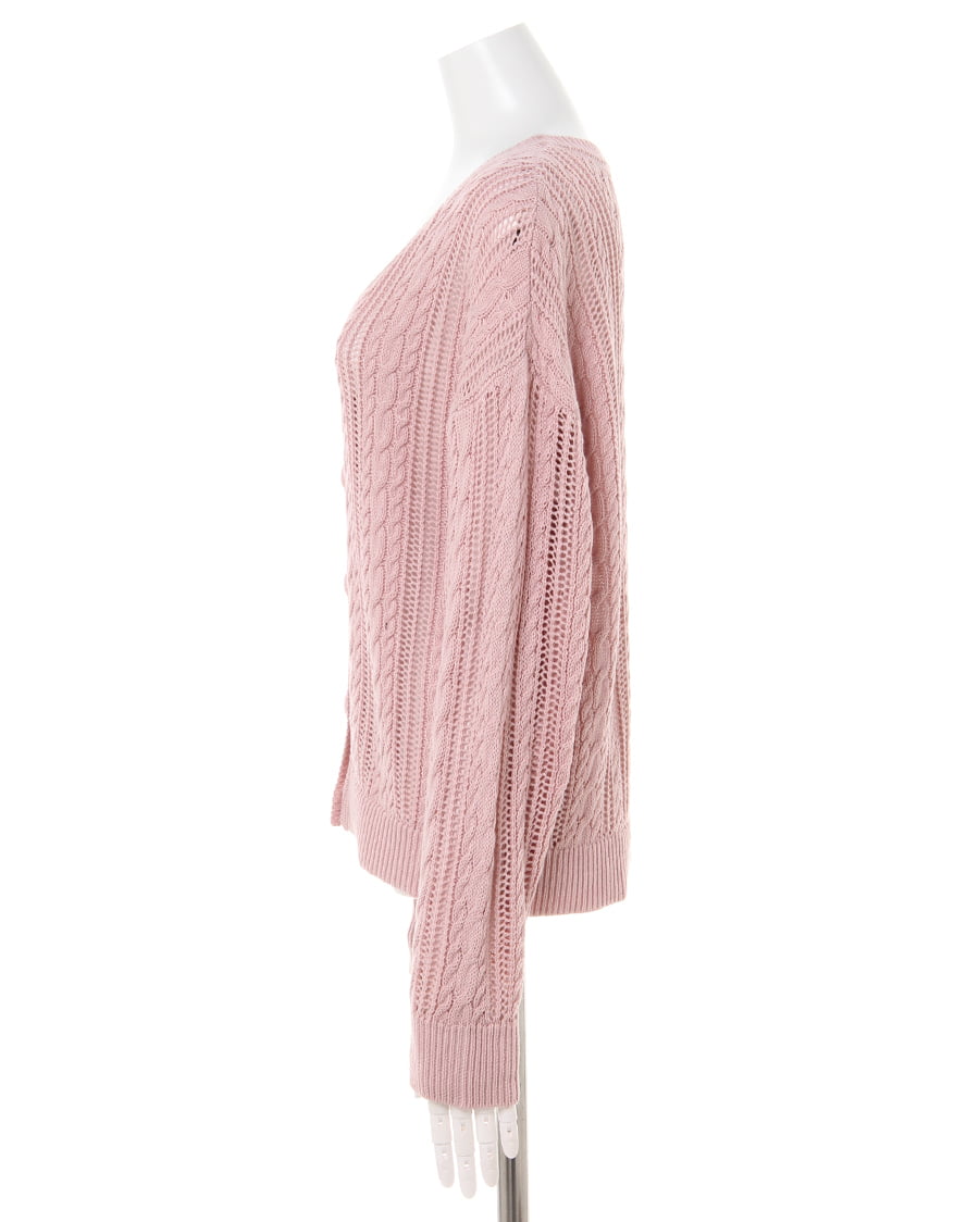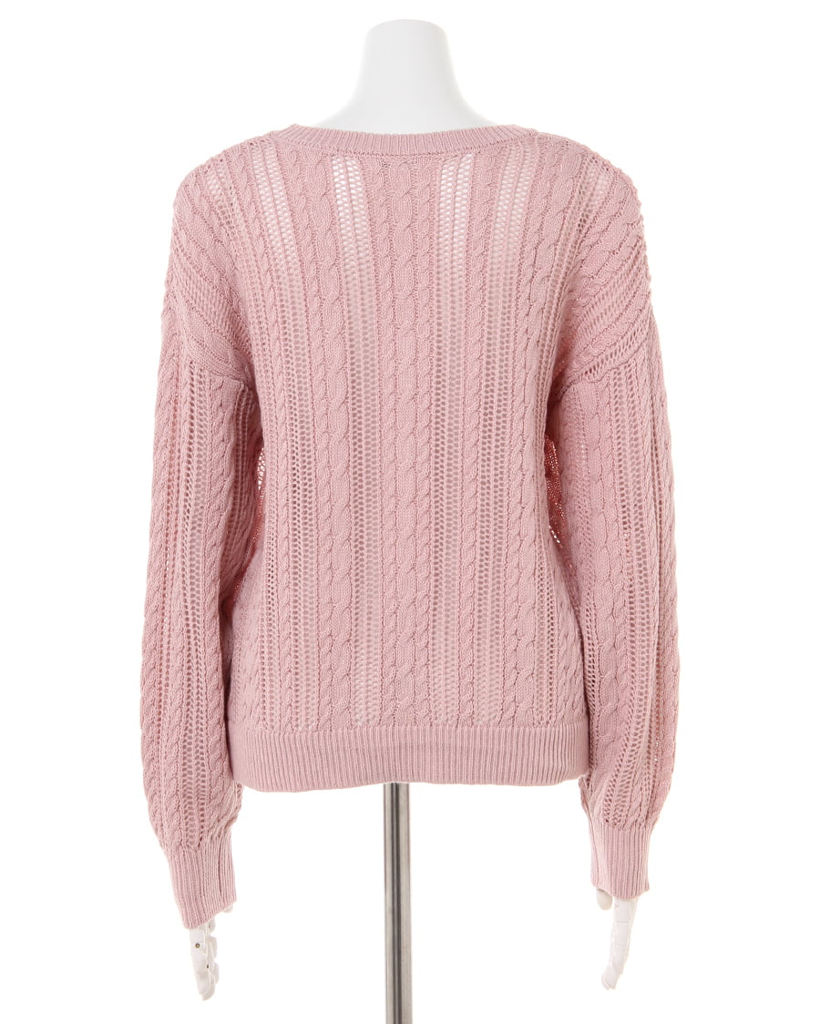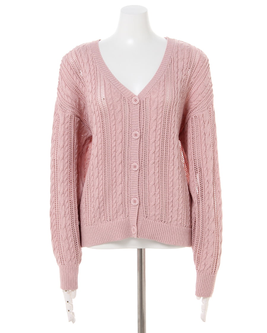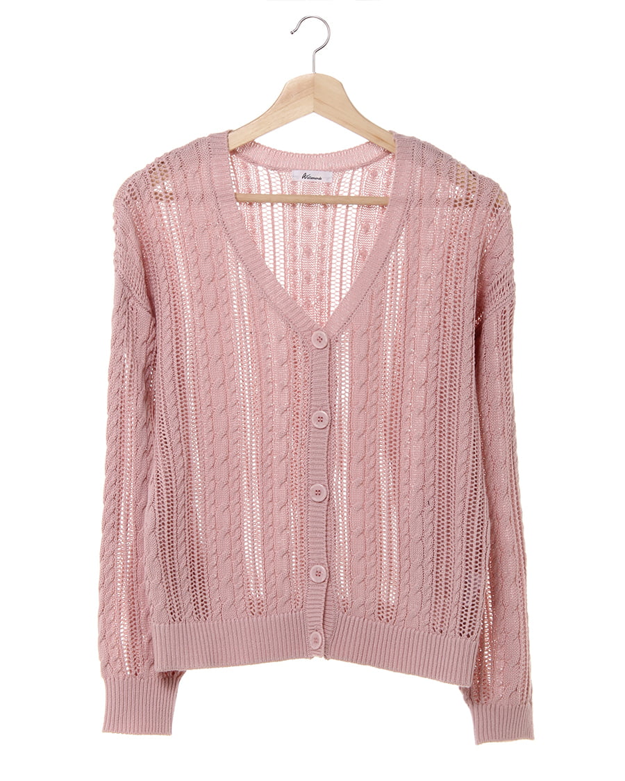 編み地の変化で抜け感のあるスタイルを叶えるVネックカーディガン。ケーブル編みと透け感ある編地のコントラストがレディな雰囲気を演出。フロントにはコロンと丸いフォルムのボタンをアクセントにして、クラシカルに仕上げています。インナーとのカラーコントラストで様々なスタイルを実現。上品なカラーラインナップでオンオフ問わずに着回せます。