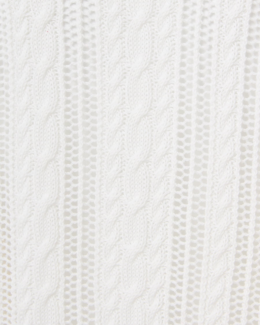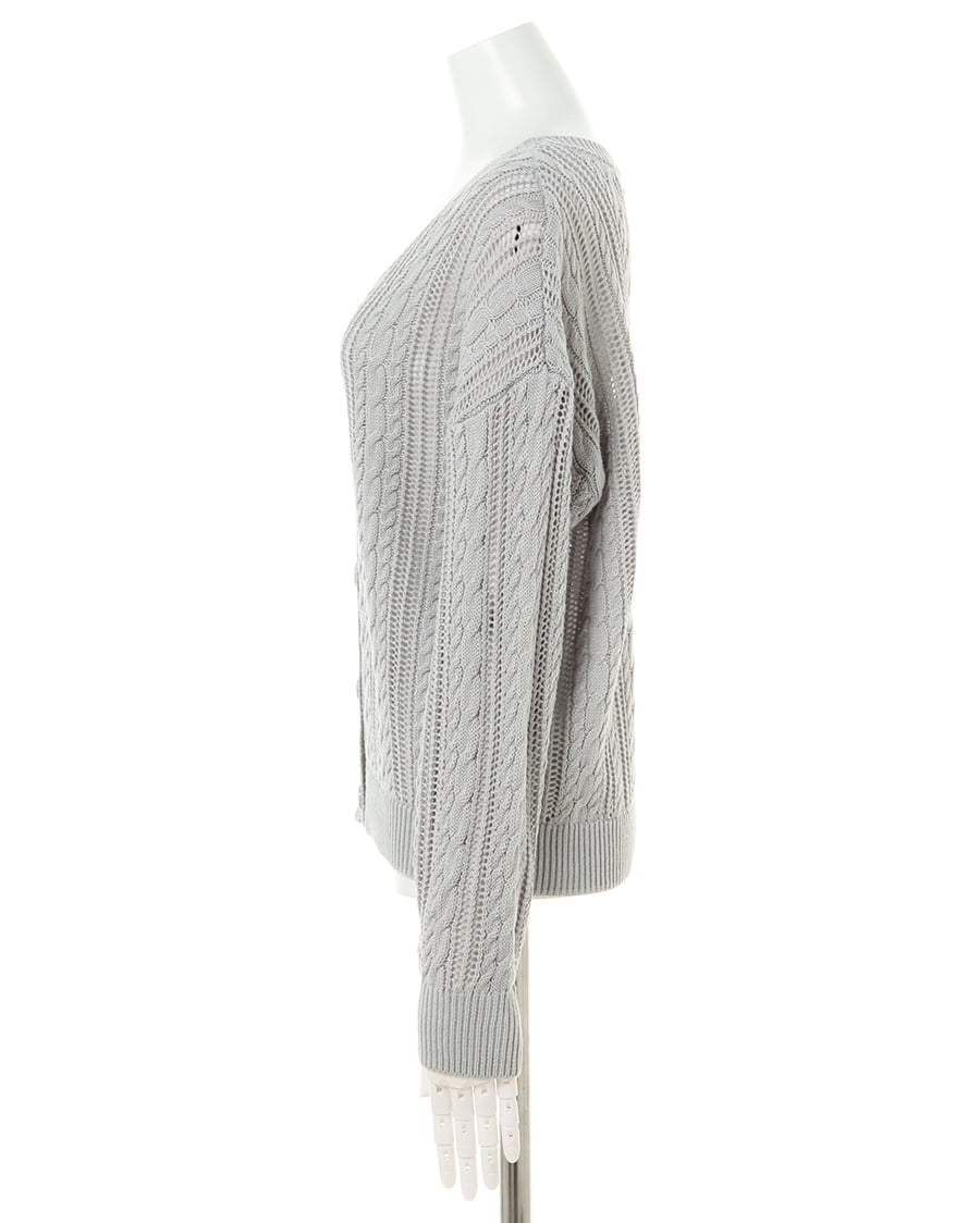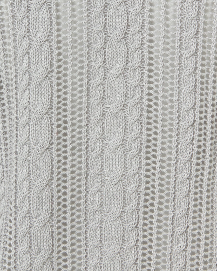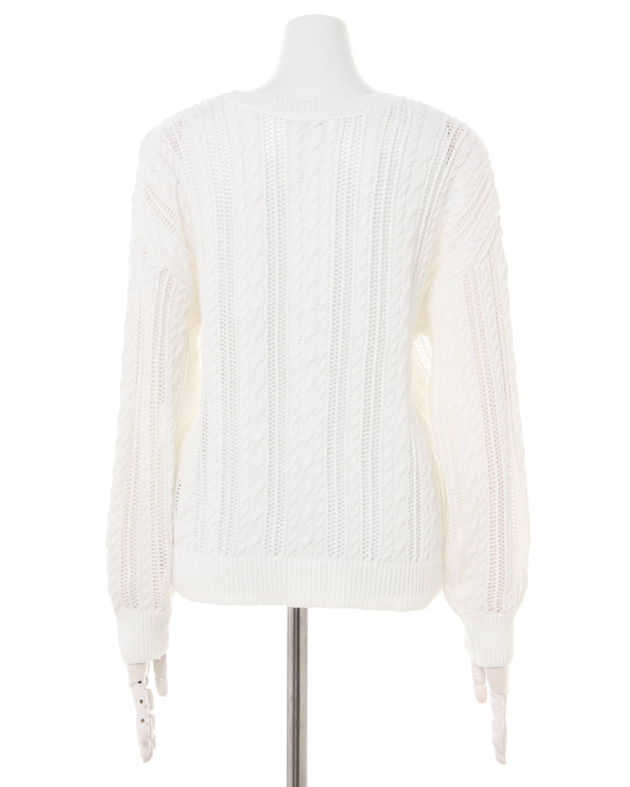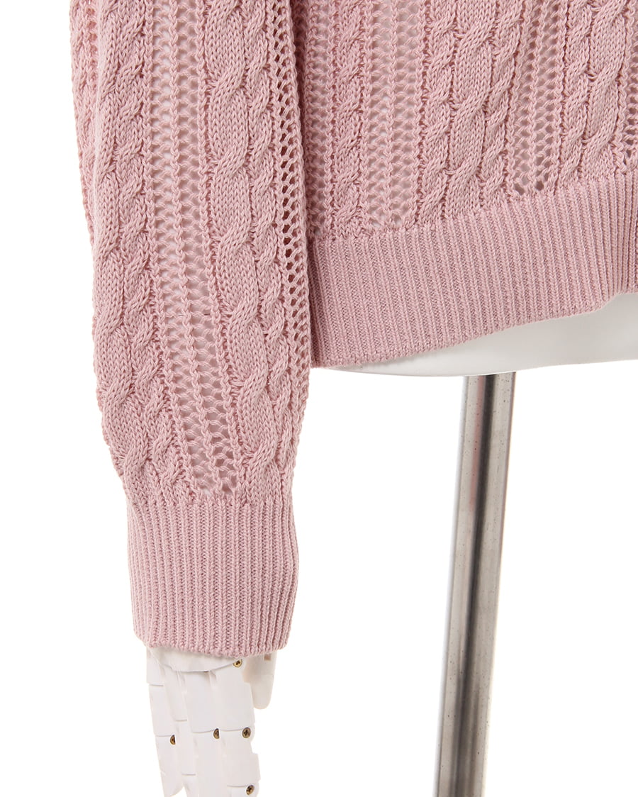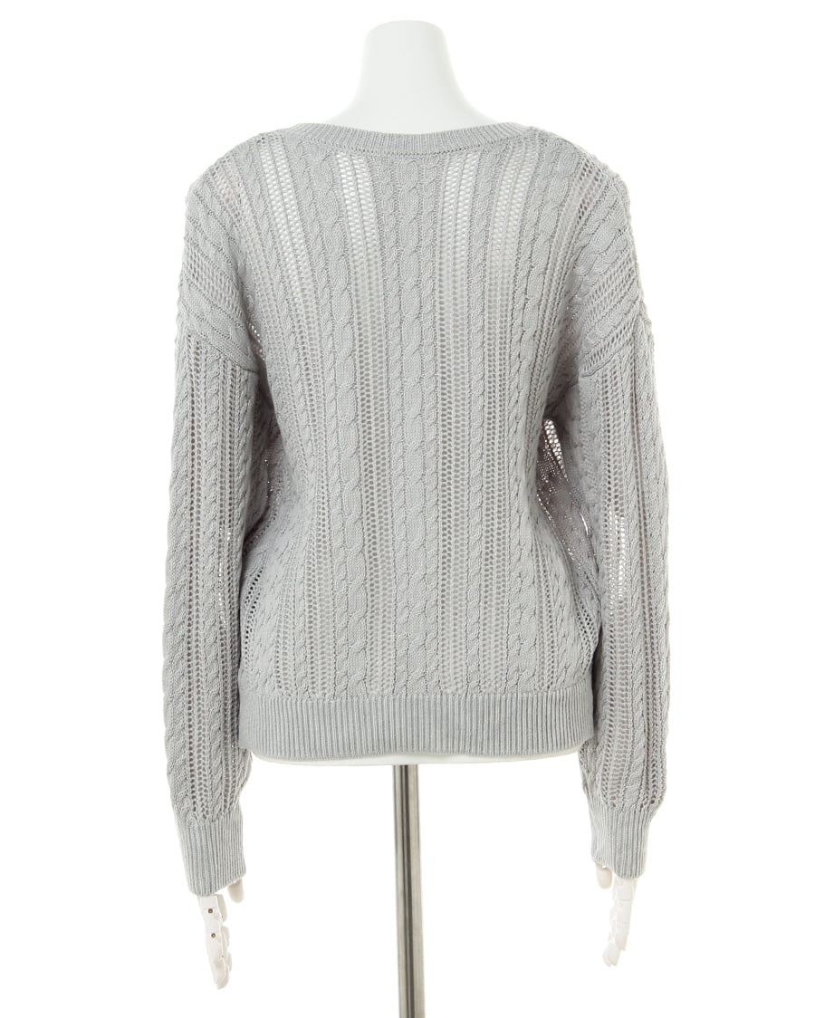 編み地の変化で抜け感のあるスタイルを叶えるVネックカーディガン。ケーブル編みと透け感ある編地のコントラストがレディな雰囲気を演出。フロントにはコロンと丸いフォルムのボタンをアクセントにして、クラシカルに仕上げています。インナーとのカラーコントラストで様々なスタイルを実現。上品なカラーラインナップでオンオフ問わずに着回せます。