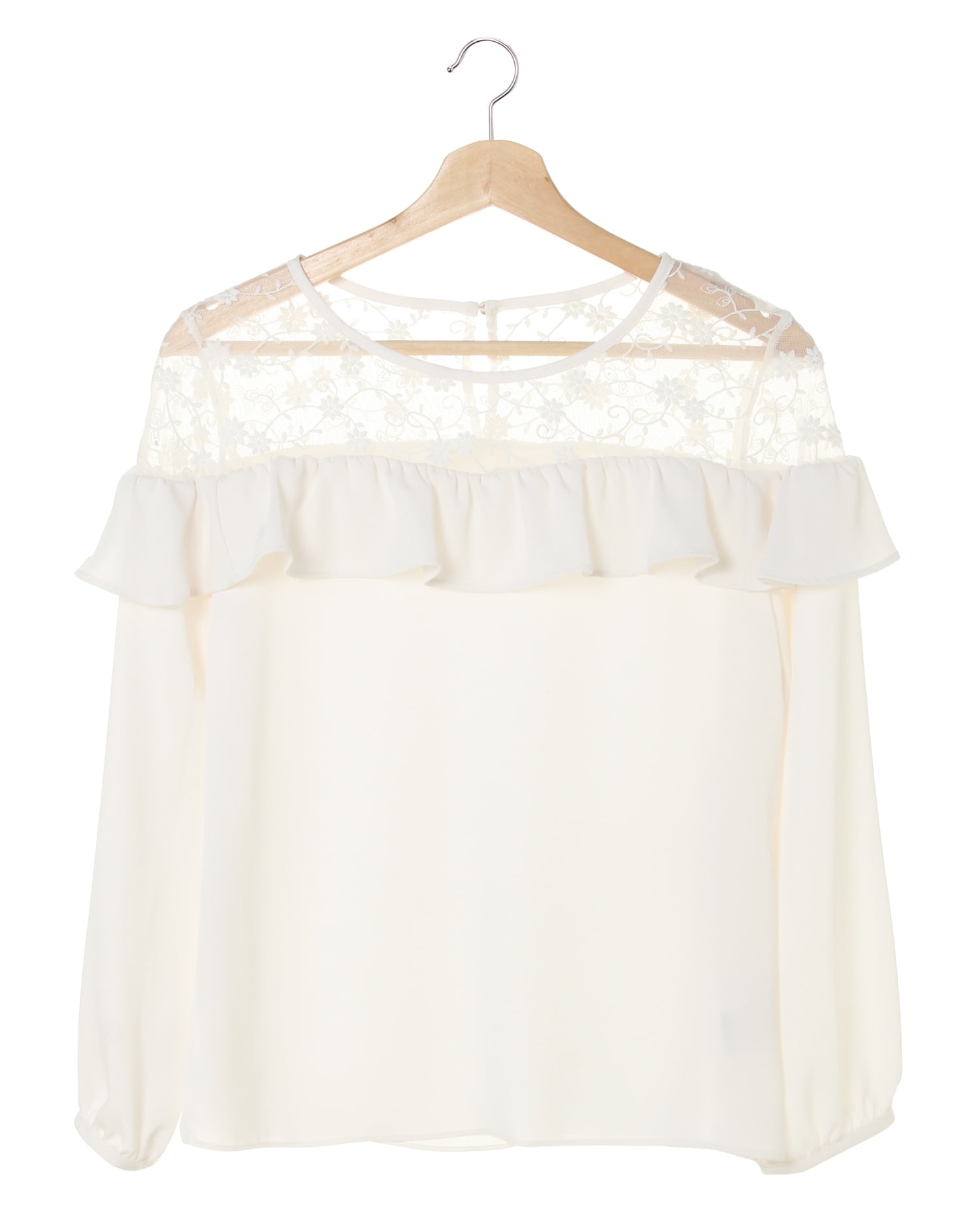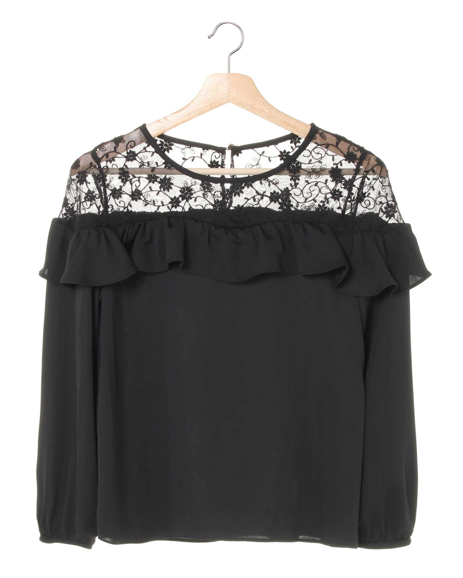 レースとフリルの組み合わせがエレガントで華やかなトップス。デコルテ前後の繊細なシアーレースから透ける素肌が女性らしさをプラス。胸元のフリルが視線を上に集め、バランスの良いスタイルを叶えます。滑らかでハリのある身頃の生地が上品な印象に。程よい丈感でトップスインスタイルも相性抜群。ワンカラーで仕立てているので、合わせやすいのも魅力的です。