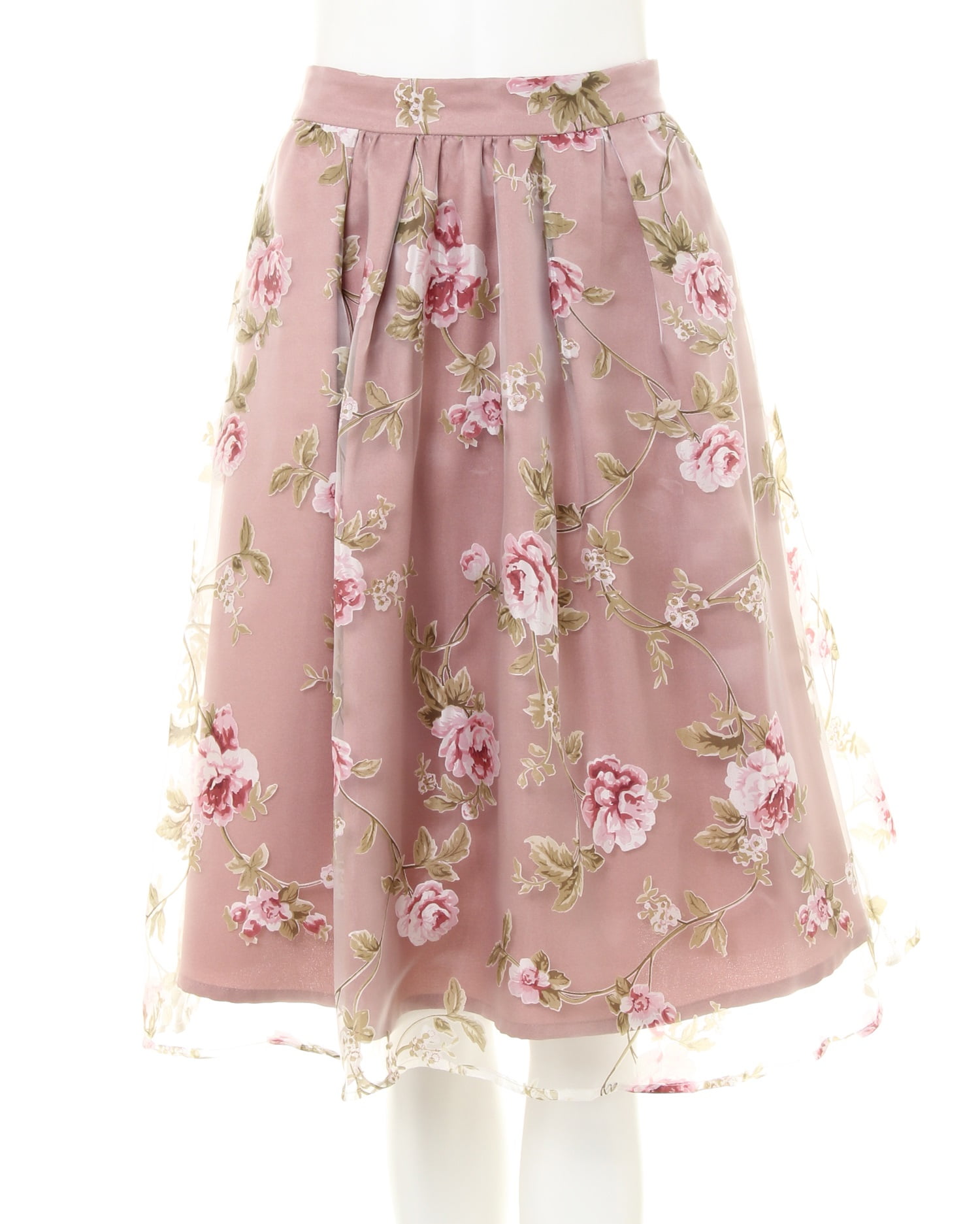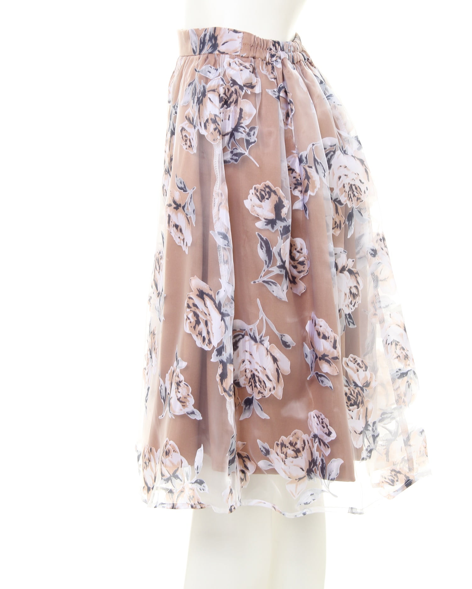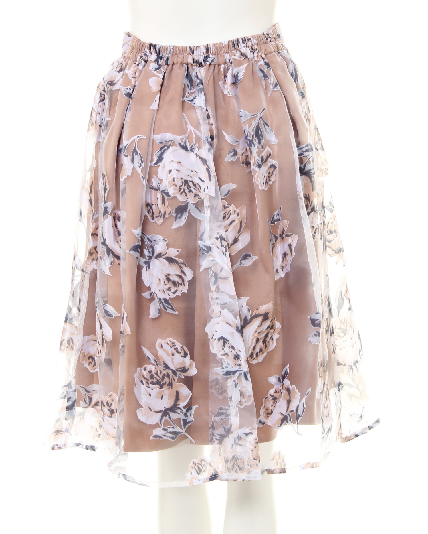 大ぶりな花柄をオーガンジーに取り入れた新鮮デザインのスカート。光沢のある滑らかな質感のスカートに、透け感のあるオーガンジーをドッキングさせたエアリー感ある1枚です。クラシカルな花柄がフェミニンな雰囲気をプラス、膝下の丈感が大人っぽい着こなしを演出します。裾の長さを変えたデザインで脚長効果も狙える優秀アイテム。
