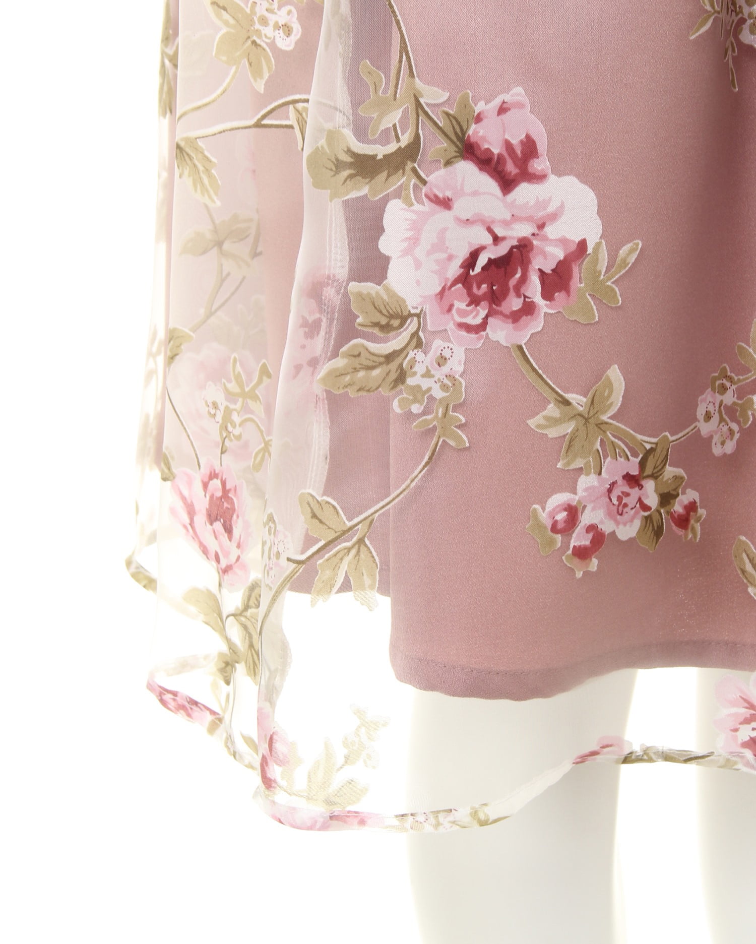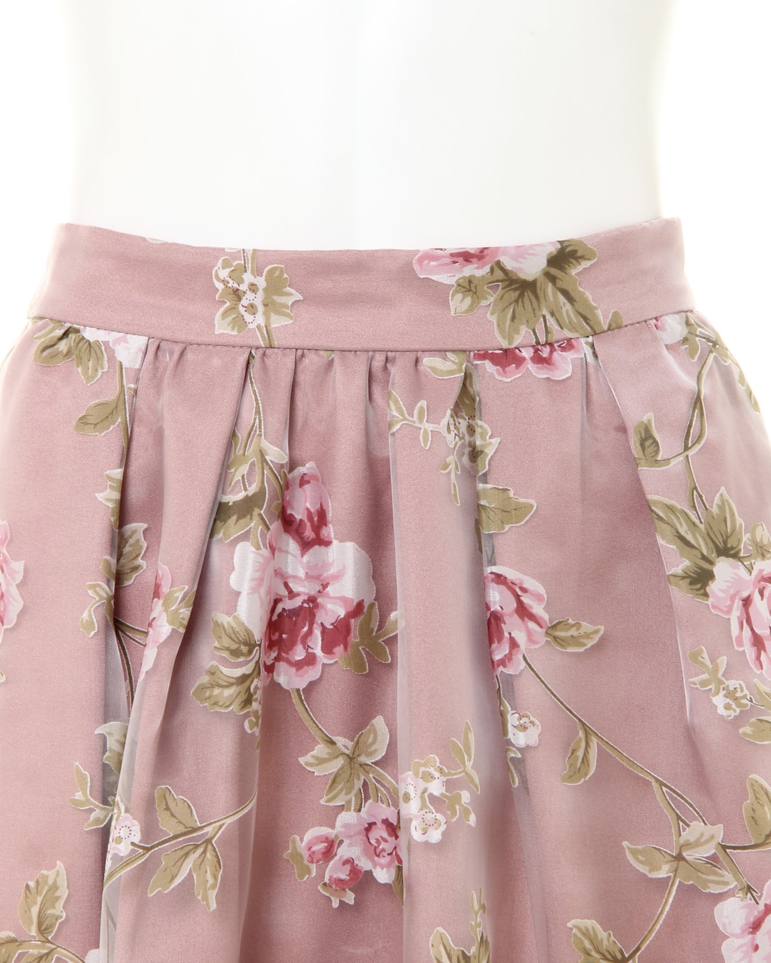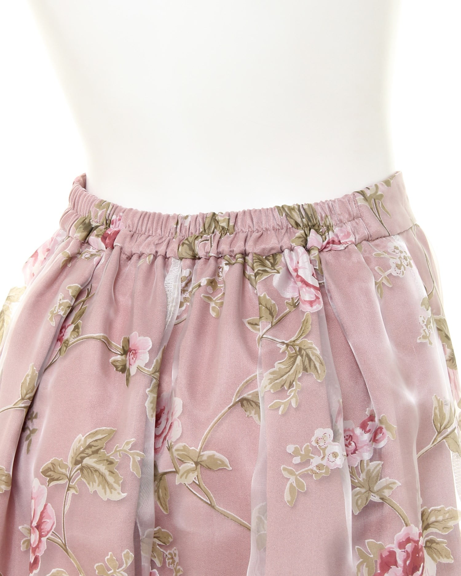 大ぶりな花柄をオーガンジーに取り入れた新鮮デザインのスカート。光沢のある滑らかな質感のスカートに、透け感のあるオーガンジーをドッキングさせたエアリー感ある1枚です。クラシカルな花柄がフェミニンな雰囲気をプラス、膝下の丈感が大人っぽい着こなしを演出します。裾の長さを変えたデザインで脚長効果も狙える優秀アイテム。