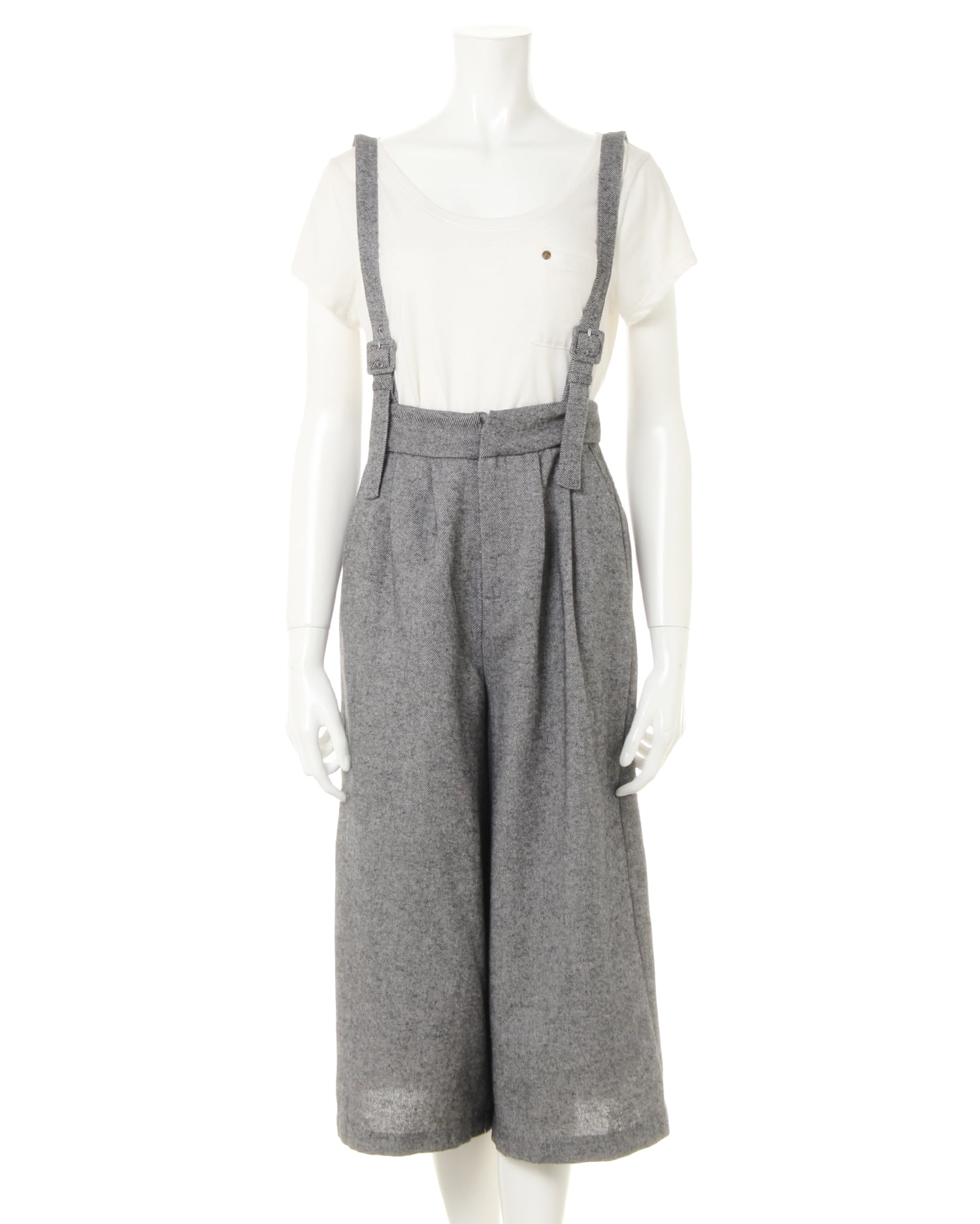 とことんシンプルに仕上げた事で着回せる幅の広いサス付きガウチョパンツ。ツィードカラーは合わせやすく、どんなトップスとも好バランスの着こなしに。気になる腰回りをカバーしてくれるタックを施し、着心地と機能性を兼ね備えた優秀アイテム。落ち着いたカラー展開で、幼くなりすぎず着回せます。ウエストの後ろにはゴムを入れたので脱ぎ穿きもスムーズです。サスペンダーを取り外せば印象の変わるスタイリングも楽しめます。