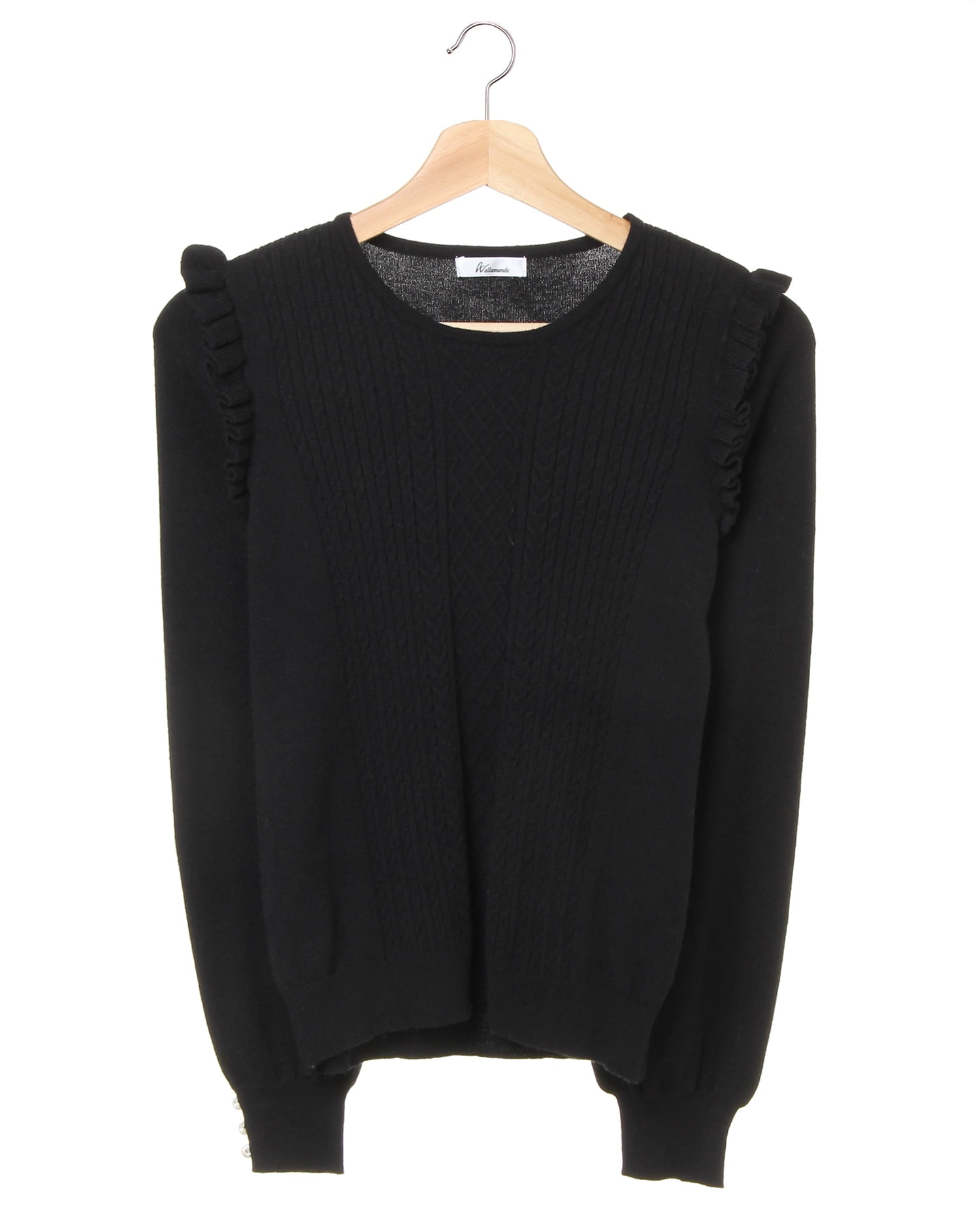 ガーリーになりすぎない絶妙なカラー使いにナチュラルなケーブル編みが旬顔のニットトップス。ショルダーにあしらった立体的なフリルがアクセントに。ボリュームスリーブと袖口のパール装飾でレディ要素もたっぷりです。クルーネックは顔周りをすっきりと見せ、女性らしい優しげな印象をプラス。肌触り柔らかで着心地の良いニットは着回しやすく、デイリーに重宝します。