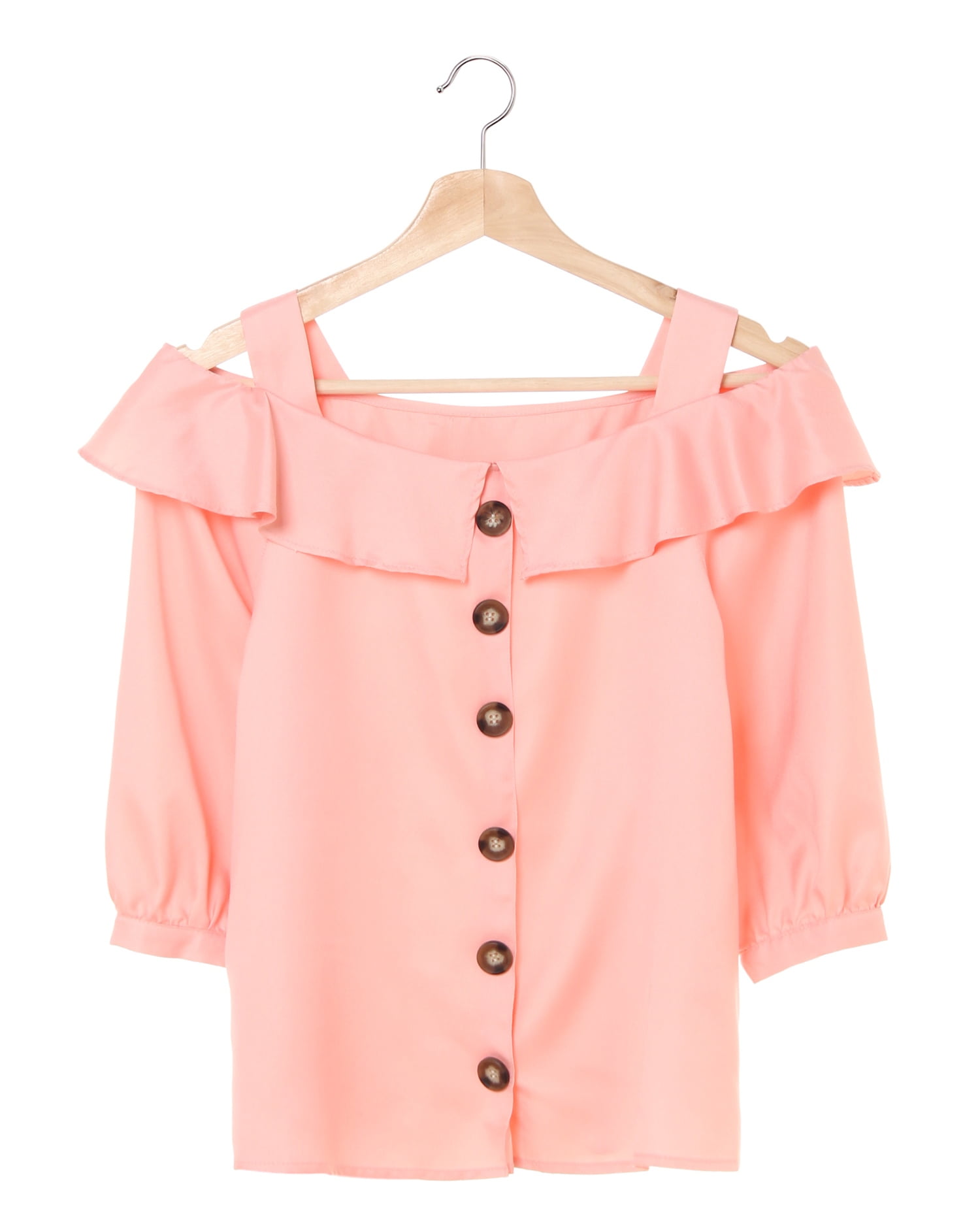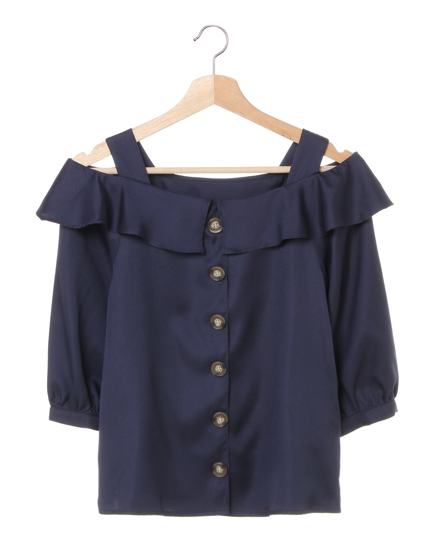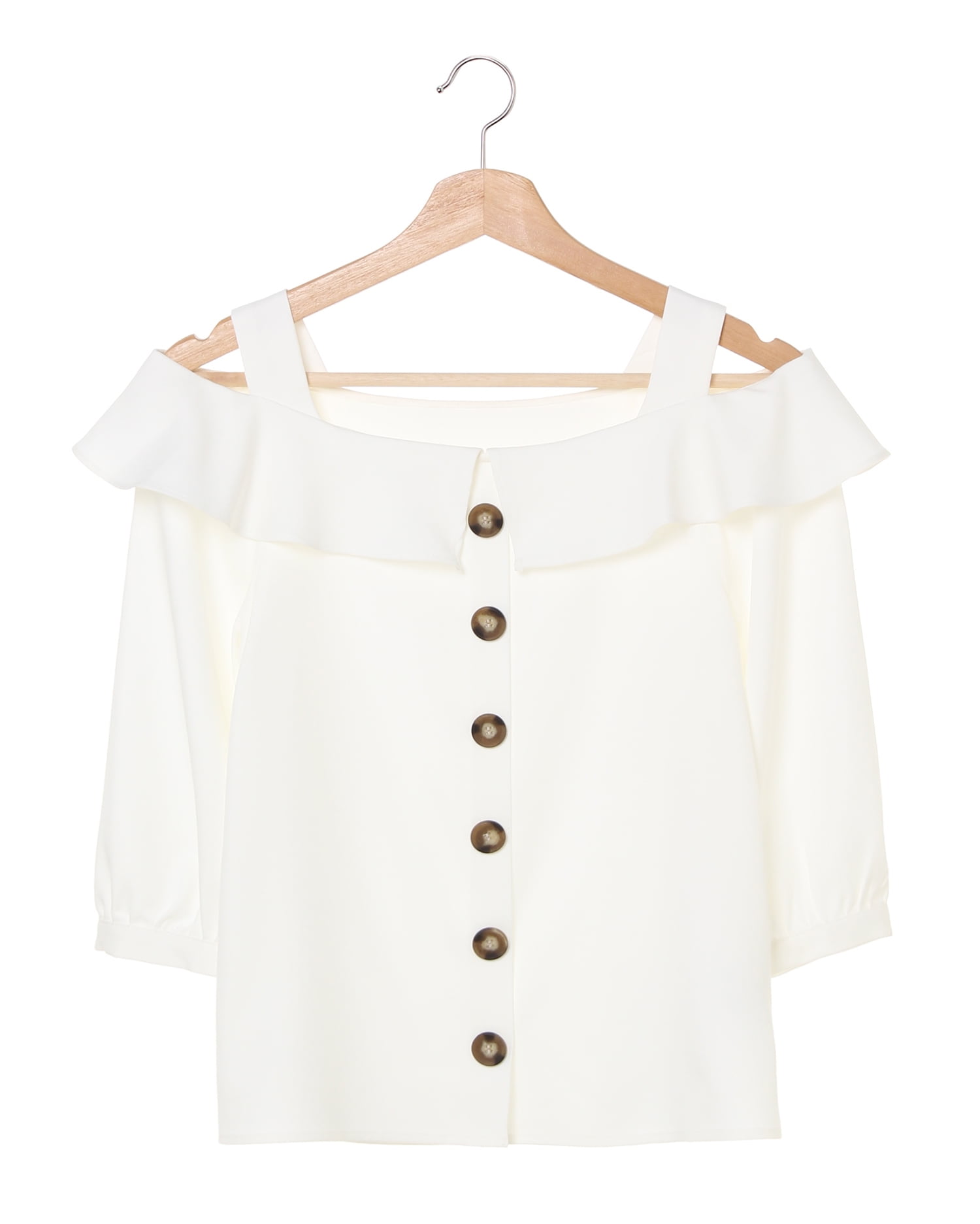 ヘルシーな肌見せでトレンド感のあるコーディネイトが完成するオフショルダートップス。すっきりとしたデコルテと胸元のフリルの組み合わせでバランス良く着こなせます。ベーシックなワンカラーにフロントのボタンがアクセントに。合わせるボトムスを選ばないので、デイリー使いにぴったりです。程よくゆとりを持たせた身頃はインナーを合わせた着こなしもオススメ。