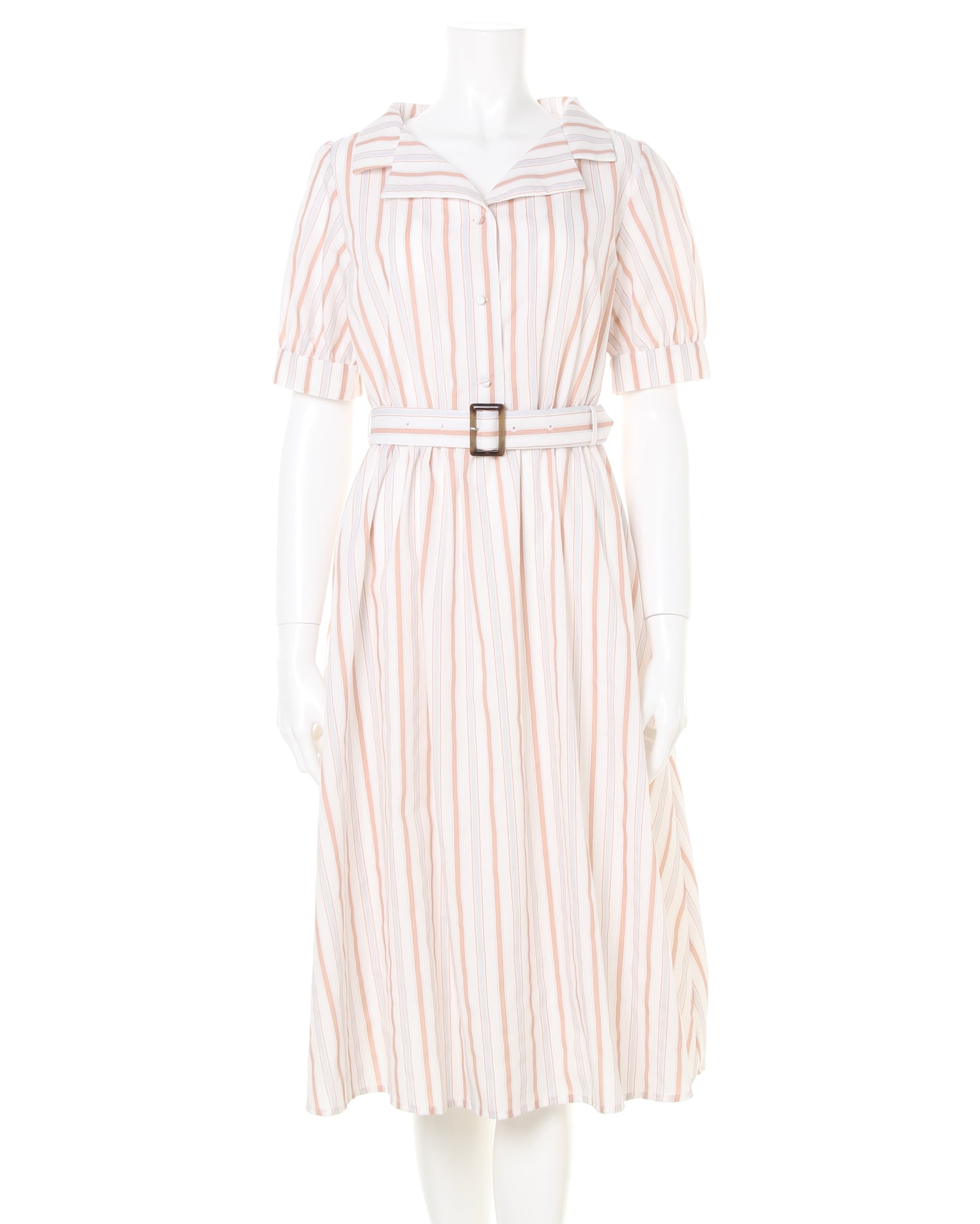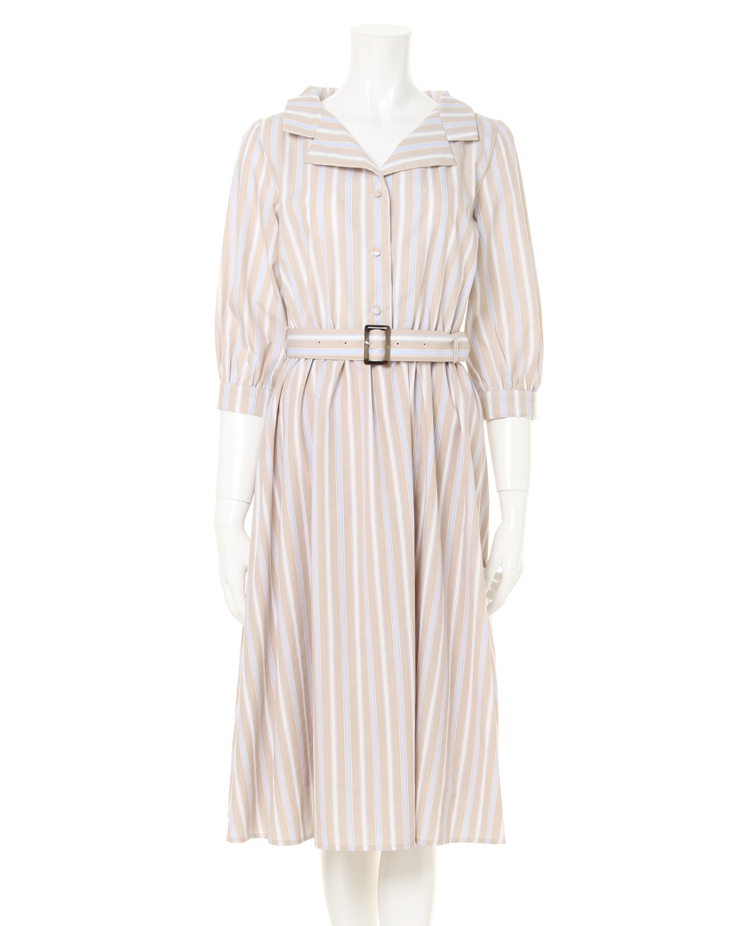 きちんと感のあるシャツデザインのワンピースはオンオフ問わずに活躍するオススメアイテム。すっきり開いた開襟デザインが顔周りをすっきり明るく彩ります。高めに入れたウエスト位置で美シルエットに。ゴムを入れているのでブラウジングも可能です。ハリ感のある生地は、スカート部分にのみ裏地を貼っているので透けも気にすることなく着られます。清涼感のあるストライプが季節感をあおります。