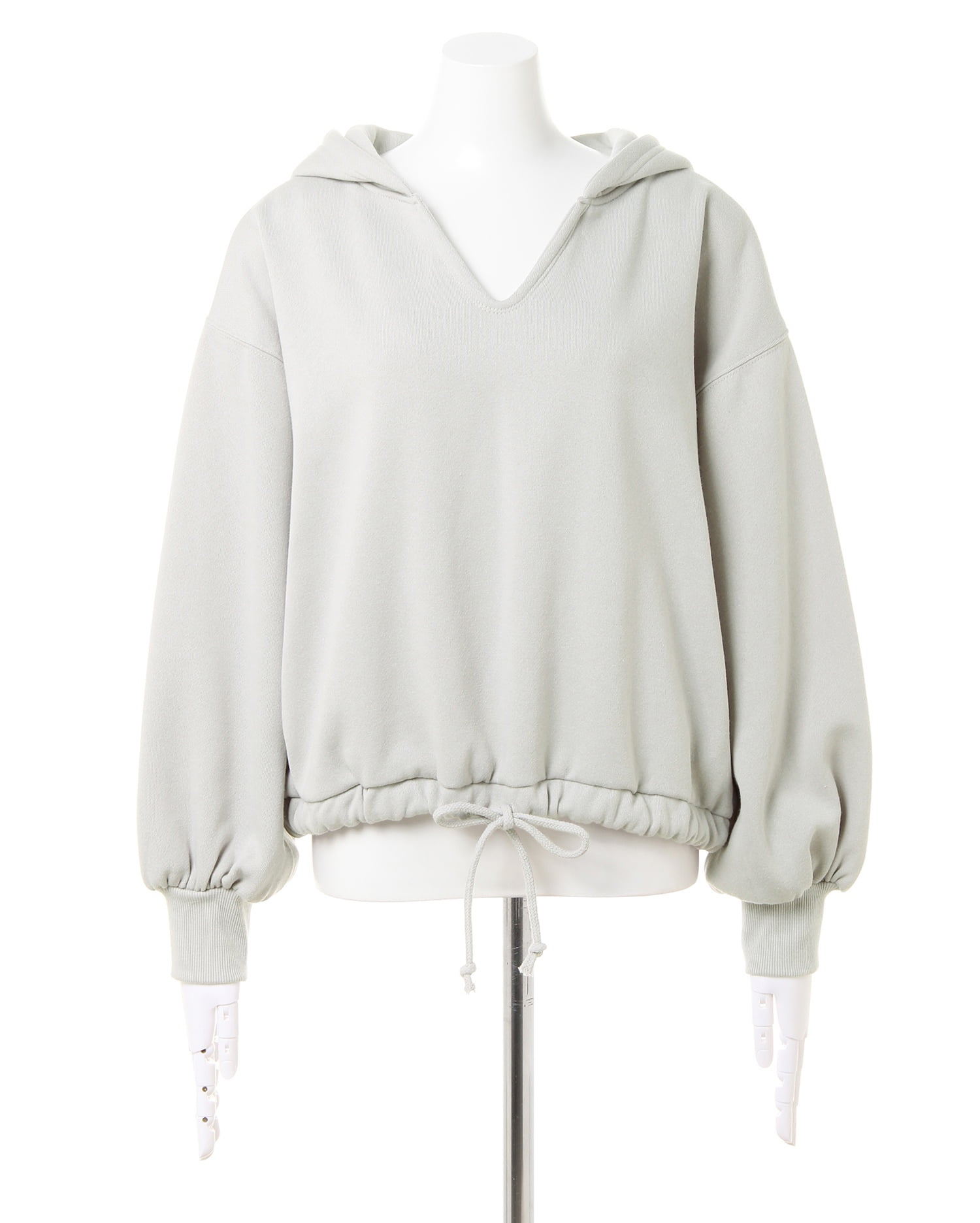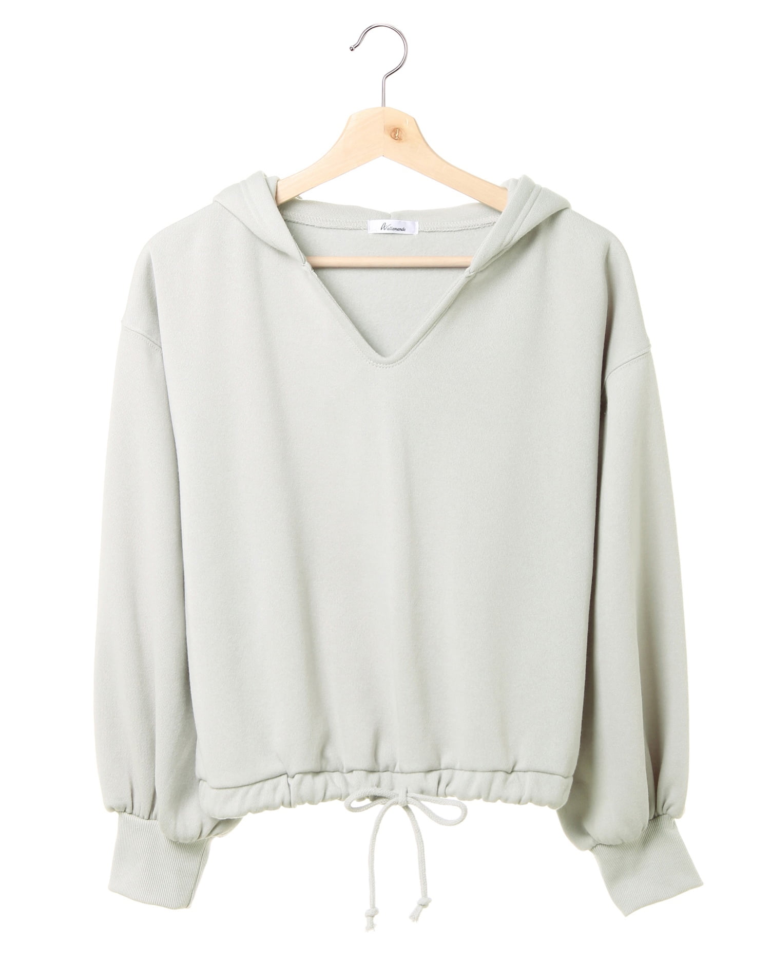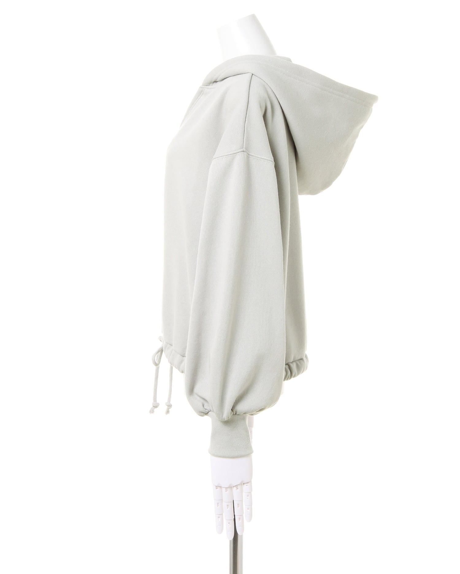 裏起毛素材で暖かなスウェットパーカーはくすみカラーでトレンド感抜群。ゆったりとした身幅とショートな丈で好バランスのスタイルが狙えます。Vネックデザインは顔周りをすっきり見せ、大人っぽい着こなしに。シンプルなワンカラーでスタイリング力も抜群です。シーンに合わせてシルエットを変えられるドローストリングは防寒性も◎。程よい厚さでコートのインにもオススメです。