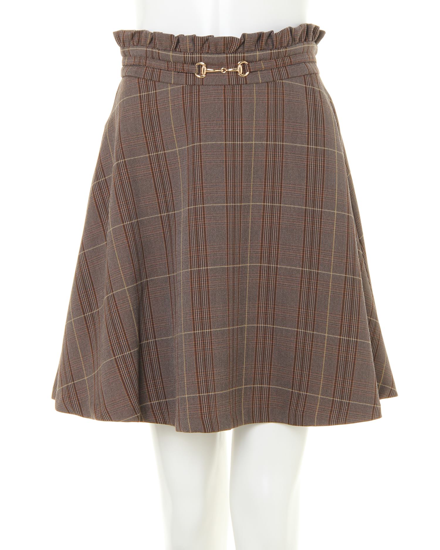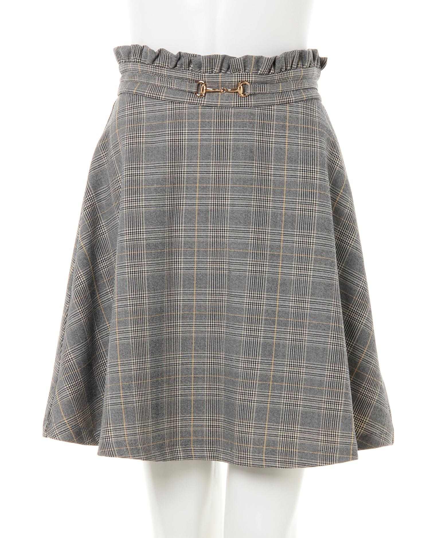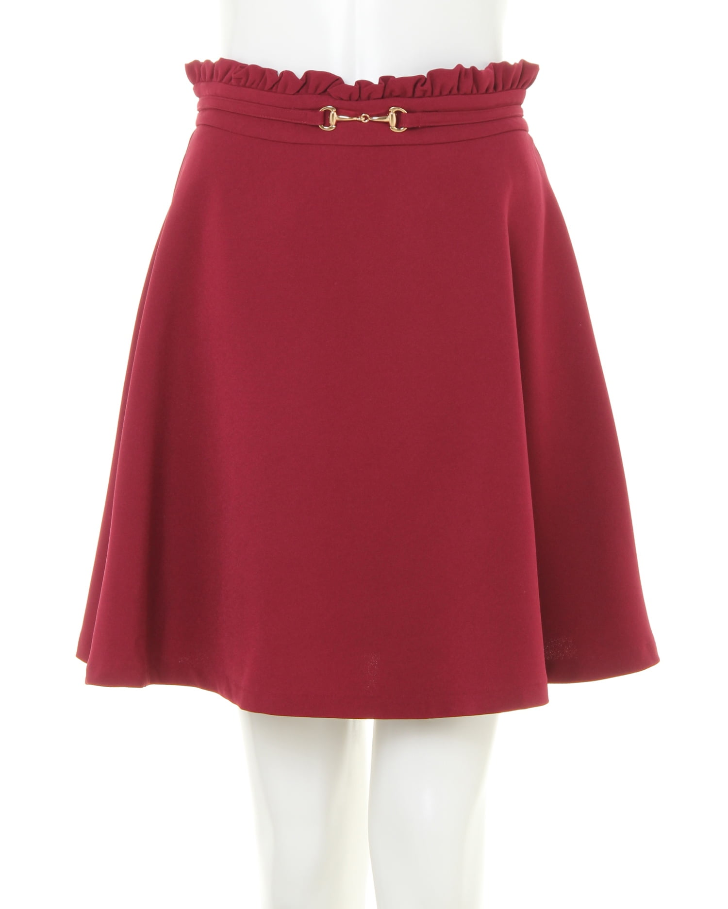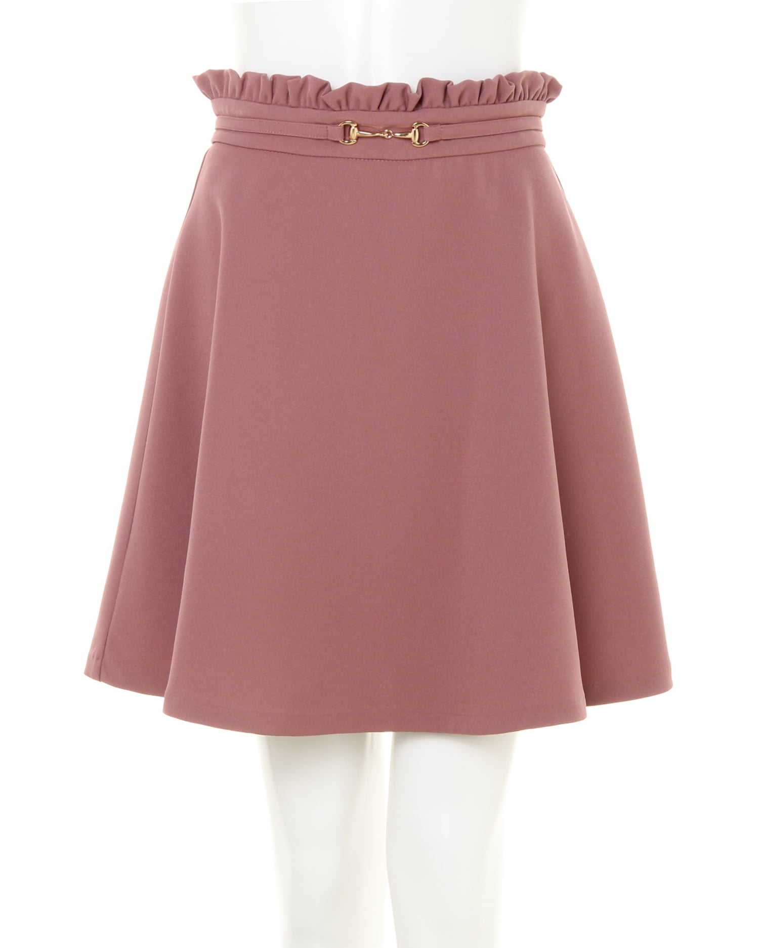 ハリと光沢のある上品素材できれいめに着こなせるスカートです。ベーシックなシルエットのウエスト部分にまるでベルトを締めているかのようなデザインがアクセント。ゴールドのビットがクラス感をプラスします。ウエストラインにはフリルをオン、トップスインスタイルもサマに◎。程よい厚みのシワになりにくい素材は普段使いに重宝します。ふんわりと揺れるフレアーシルエットがフェミニン。