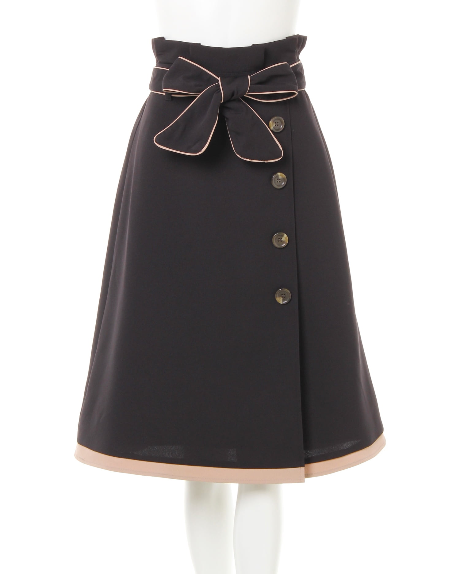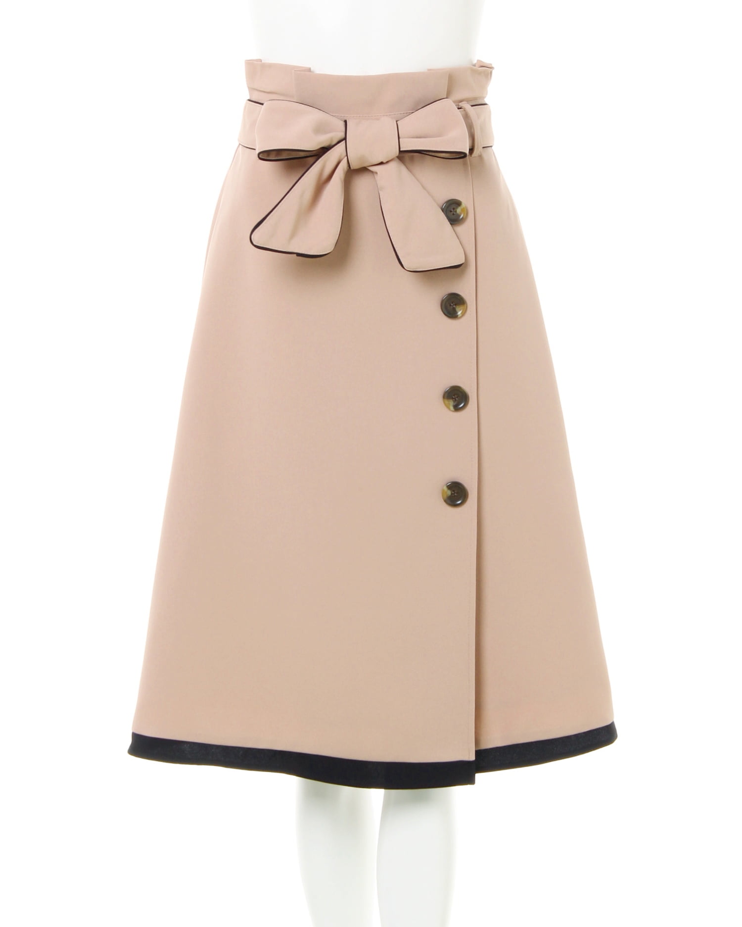 大人のきれいめスタイルにもフィットするミディアム丈の配色スカート。ハリのあるしなやかな素材は伸縮性も抜群で穿き心地も快適です。コントラストの効いたヘムの配色ラインがメリハリをプラス。スタイリングをきゅっと引き締めます。ラップ風のディテールと大きめの飾りボタンがフェミニン。タックを効かせたフレアなフォルムは、可愛らしさだけでなく気になるレッグラインをカバーしスタイルアップ効果も狙えます。