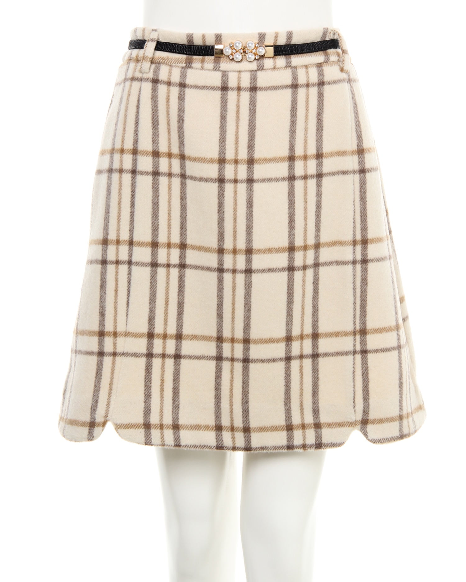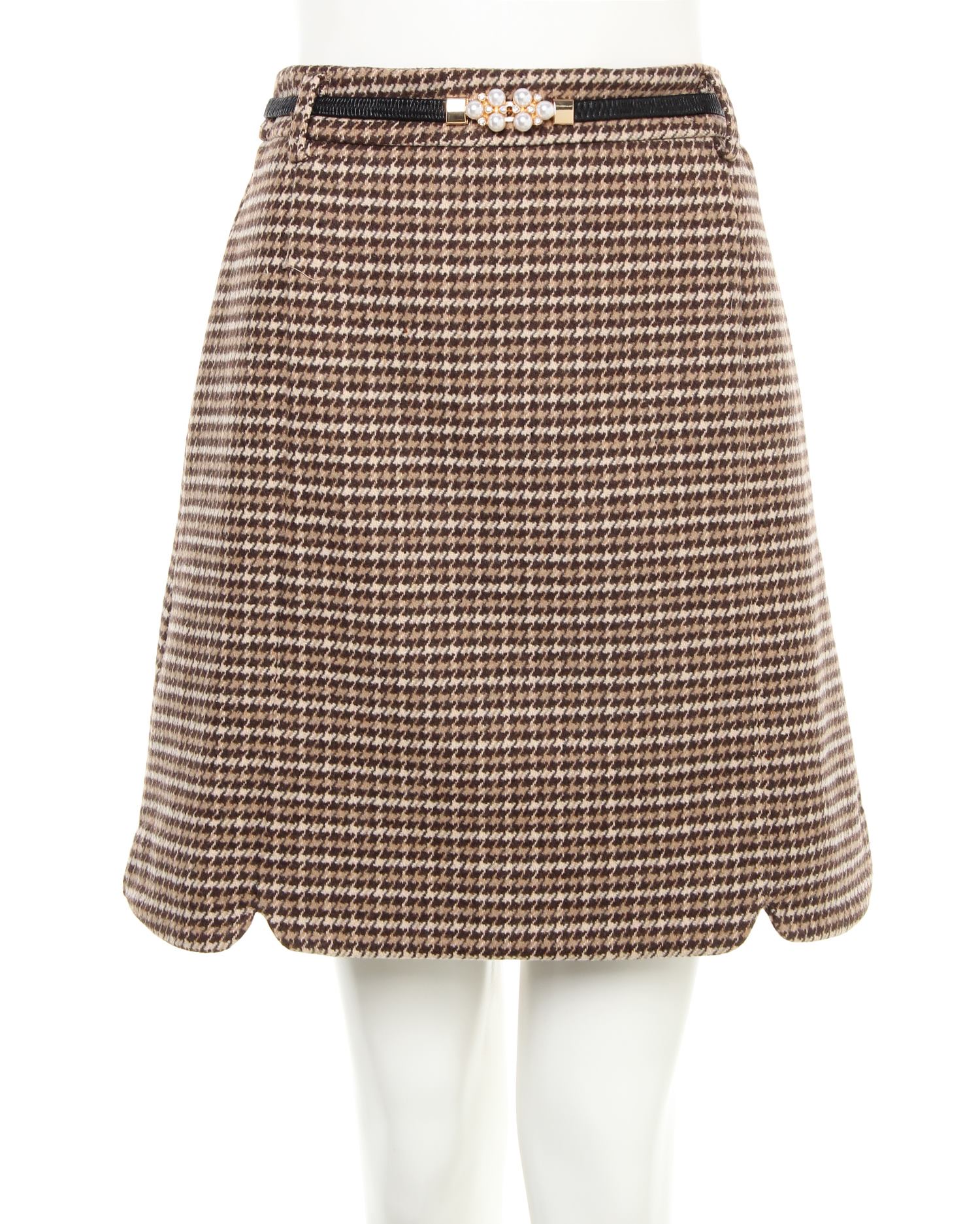 トレンドのチェック柄がコーディネイトのアクセントにぴったりな台形シルエットのスカート。美脚効果抜群の計算されたラインでデイリー使いにぴったりの1枚です。落ち着いたカラー使いでカジュアルになりすぎず大人っぽく着られるのも◎。バックウエストはゴムになっているので穿きやすいのもポイントです。ウエストマークに便利なパールビジュー付きのベルトがセットになっています。