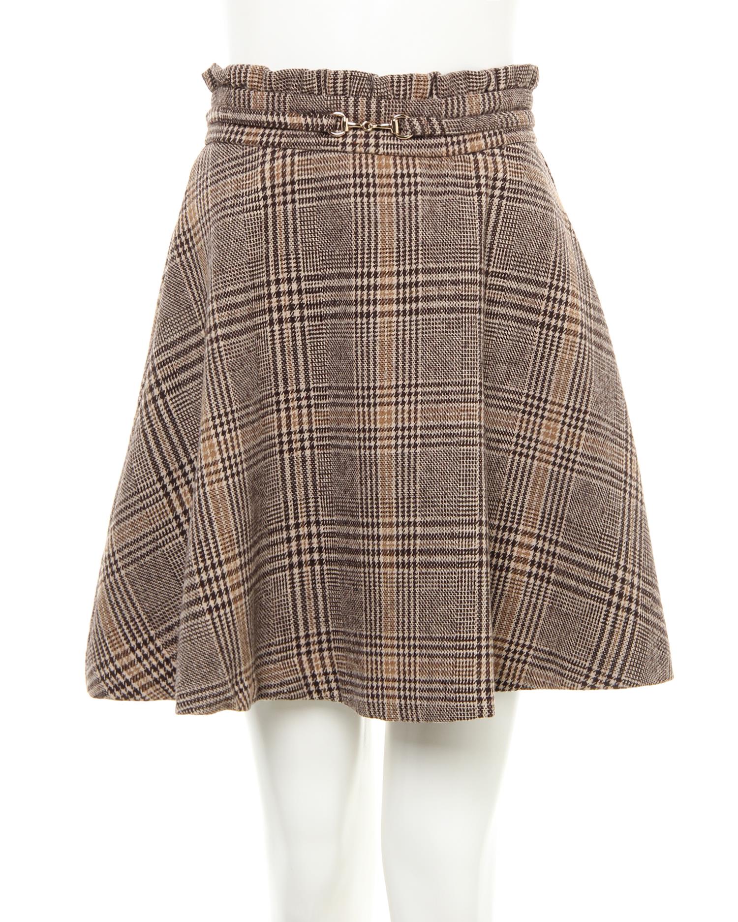 上品なチェック柄でお出かけシーンにぴったりなフレアスカート。裾へ向かってふわりと広がるフェミニンなフレアシルエットが魅力です。フロントにあしらったリュクスなビットがアクセント。ウエストマークのデザインでメリハリのある着こなしが完成します。バックウエストはゴムになっているのでトップスインスタイルも◎。落ち着いたカラー使いで大人っぽく着こなせる1枚です。