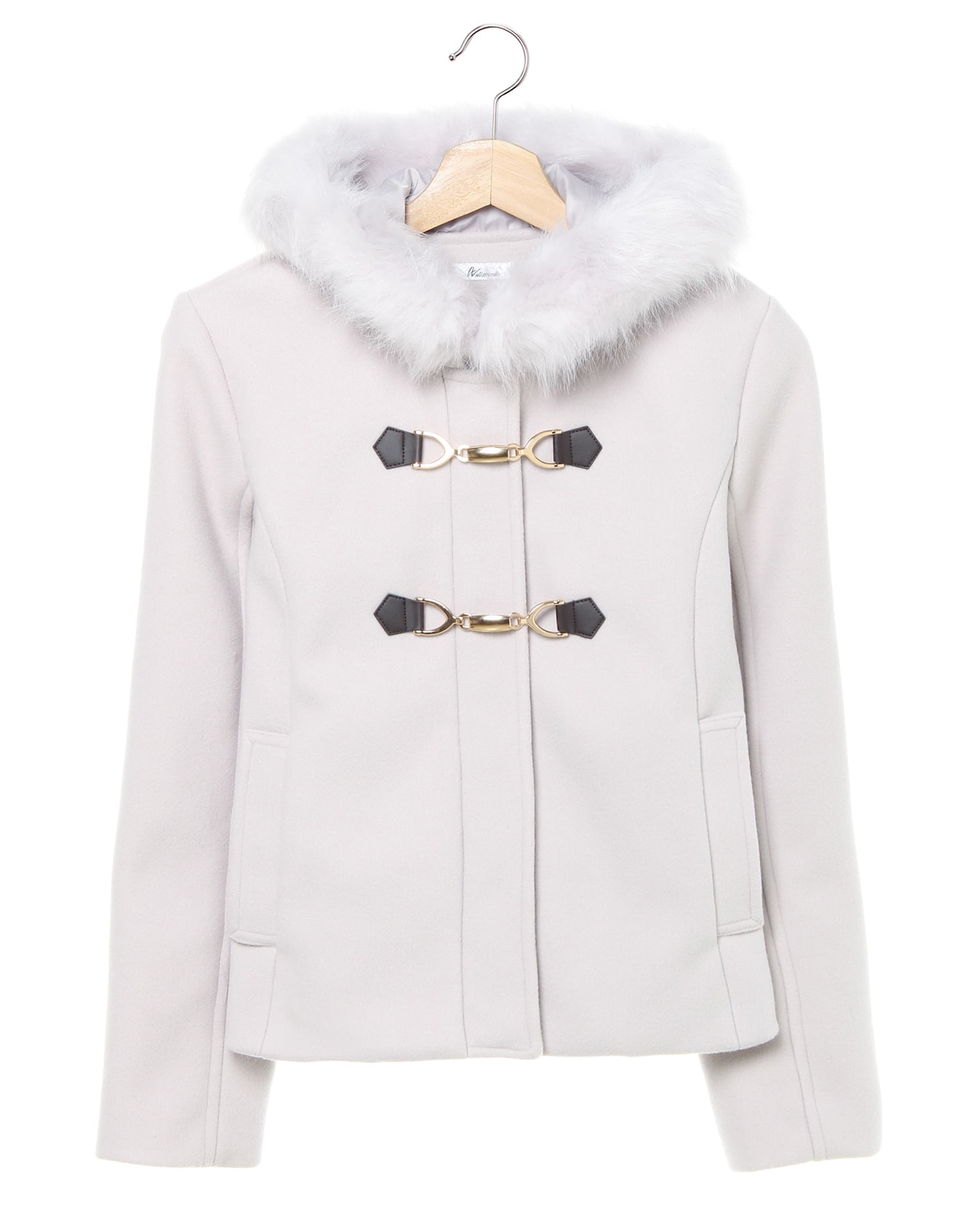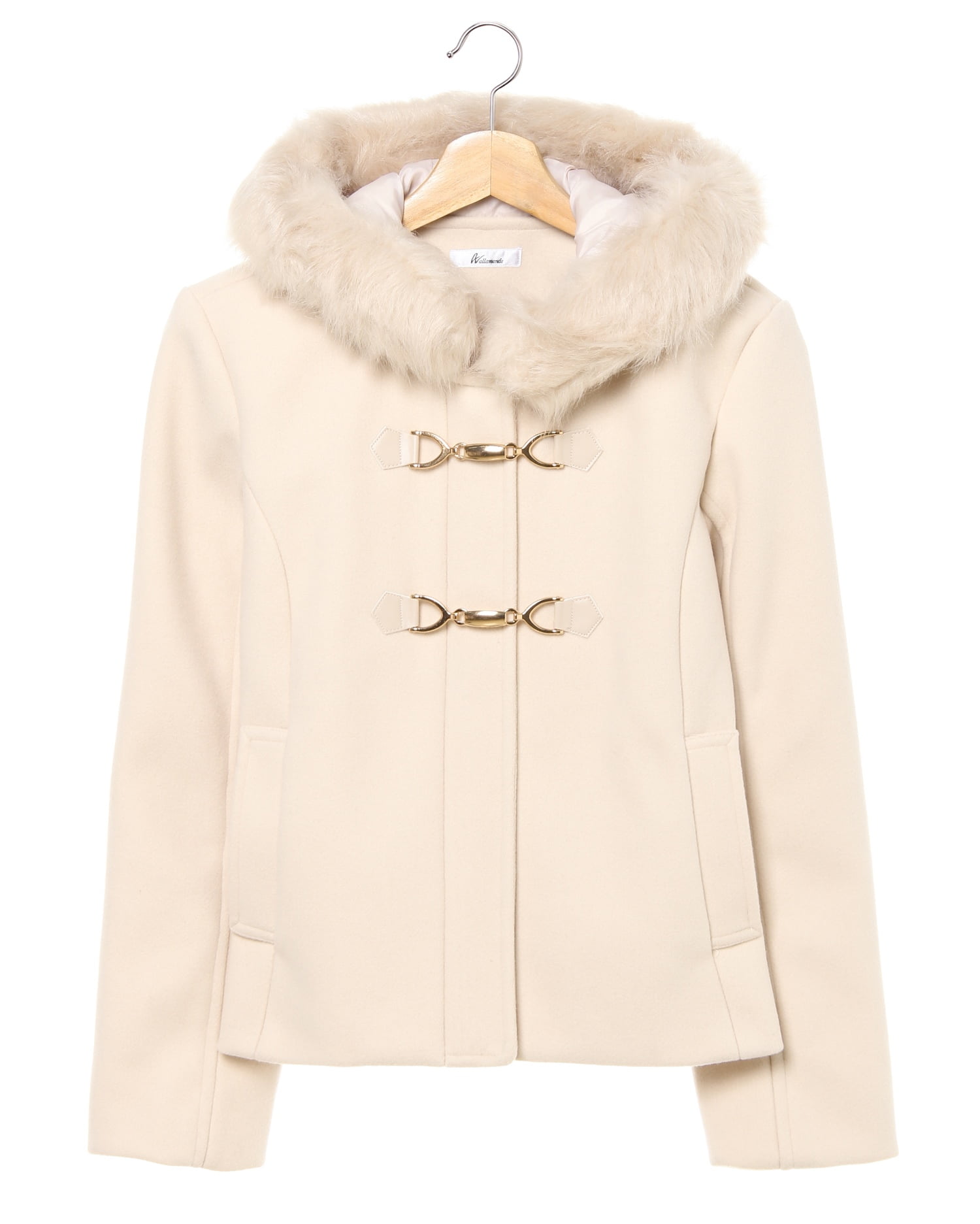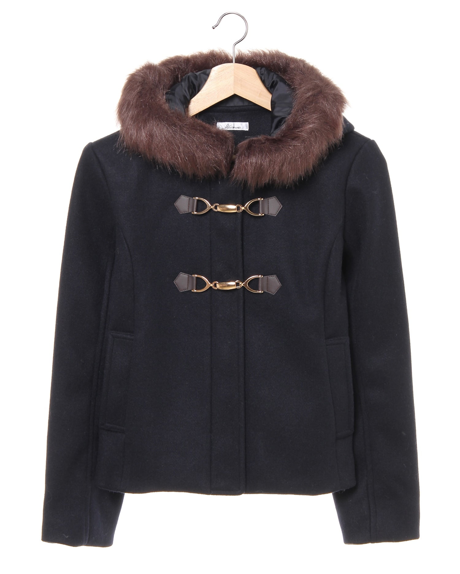 きちんと感のあるフェミニンコートはオンオフ問わずに活躍すること間違いなしのアイテム。ハリ感のある生地がきれいなラインをキープし、上品な印象に。開閉部分はジップになっているので脱ぎ着も楽チン。フロントにあしらったビットがリュクスなアクセントになっています。フード部分にはファーをあしらってボリュームをプラス。ファー部分はボタンで取り外し可能です。
