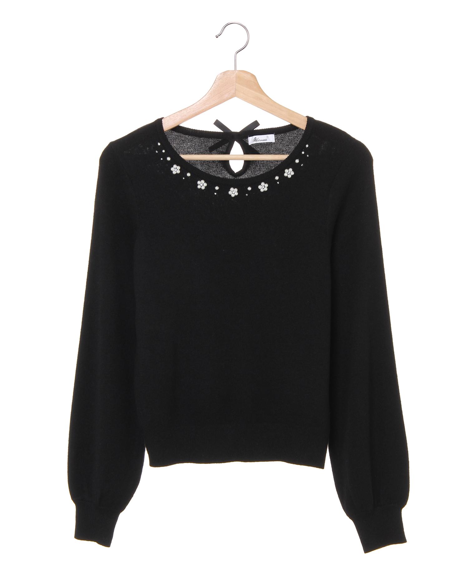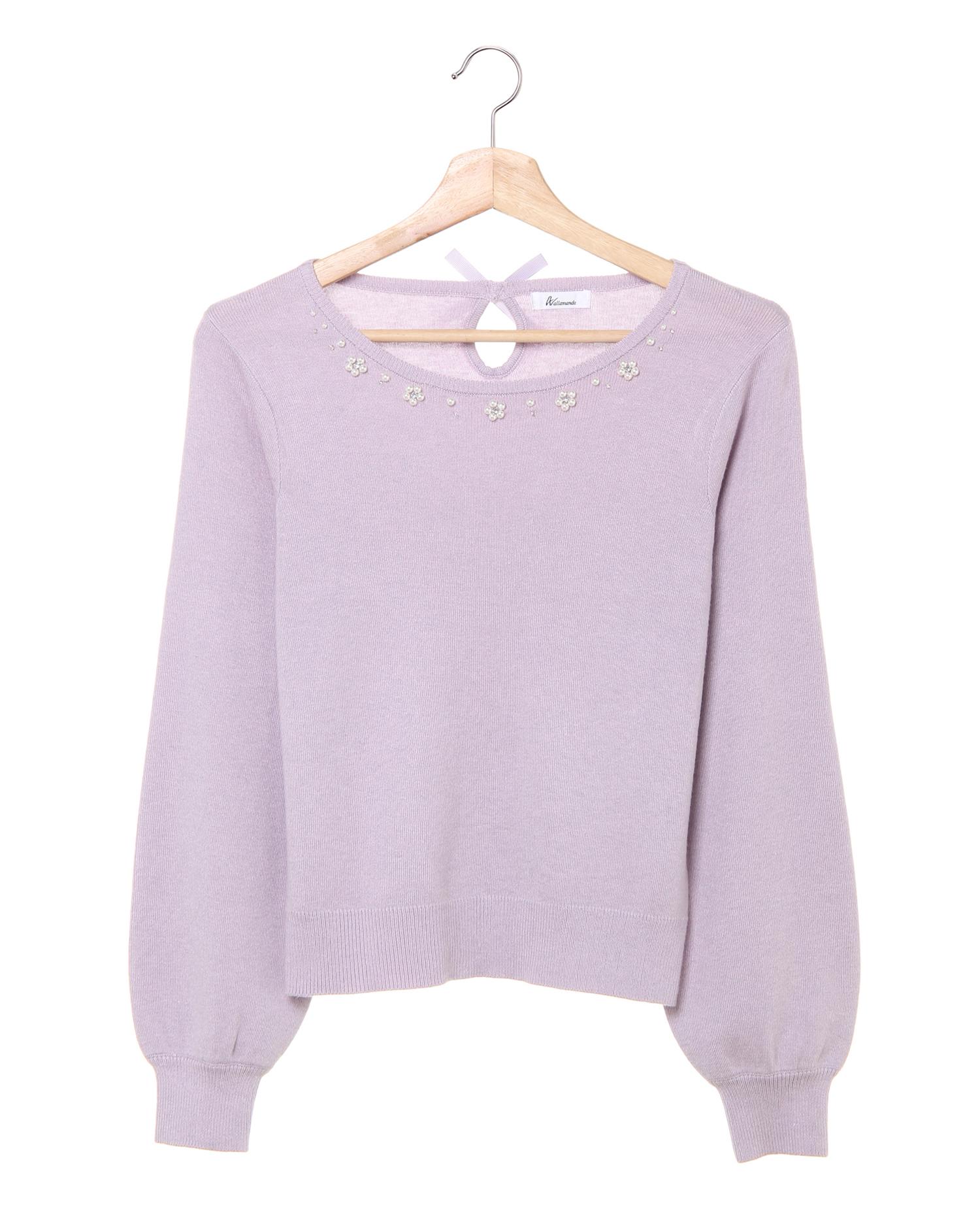 フロントのビジューとバックリボンでとことんガーリーに仕上げたニットトップス。広めに開いたネックラインとゆったりめの身幅で1枚ではもちろん、インナーを合わせてももたつかずすっきり着られます。ふんわりとボリュームを持たせたスリーブで今年らしいシルエットに◎。合わせやすい落ち着いたカラーからコーディネイトのアクセントになるキレイカラーまでバリエーションも豊富に揃っています。