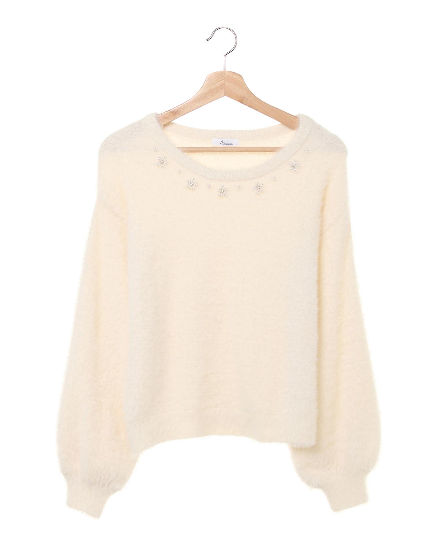 思わず触れたくなるような毛足の長いふんわりフェザーで仕立てたガーリーニット。しっとり柔らかな質感で肌触りも良く快適な着心地のアイテムです。ネックラインのパール装飾が華やかさをプラス。フラワーモチーフがフェミニンなアクセントになっています。シンプルなワンカラーで合わせるボトムを選ばないもの嬉しい。程よい厚みでコートのインナーとしても活躍します。