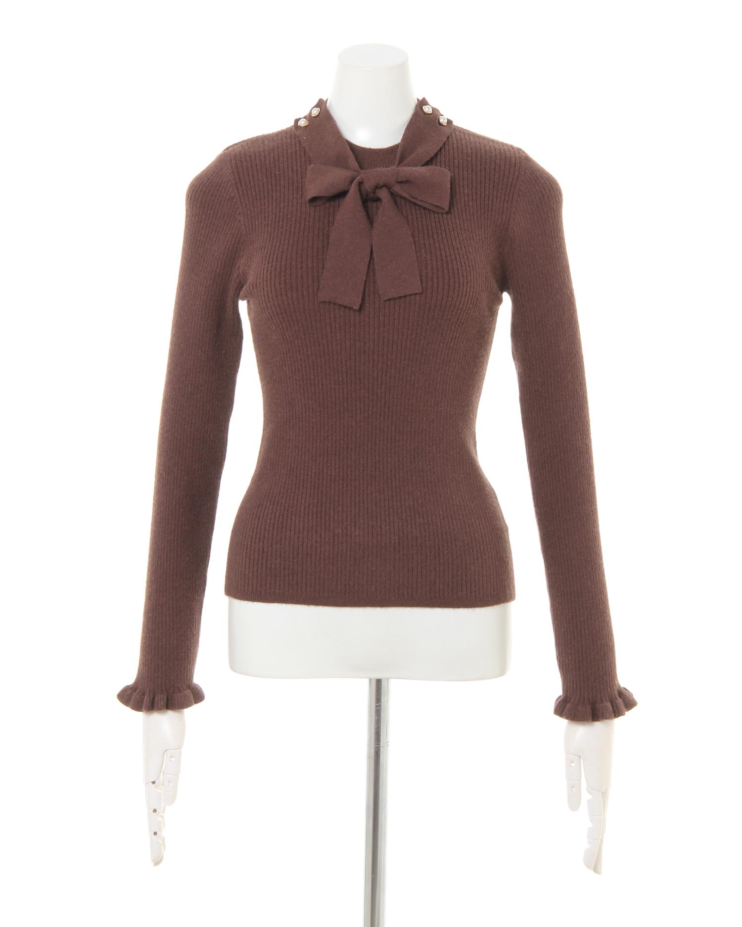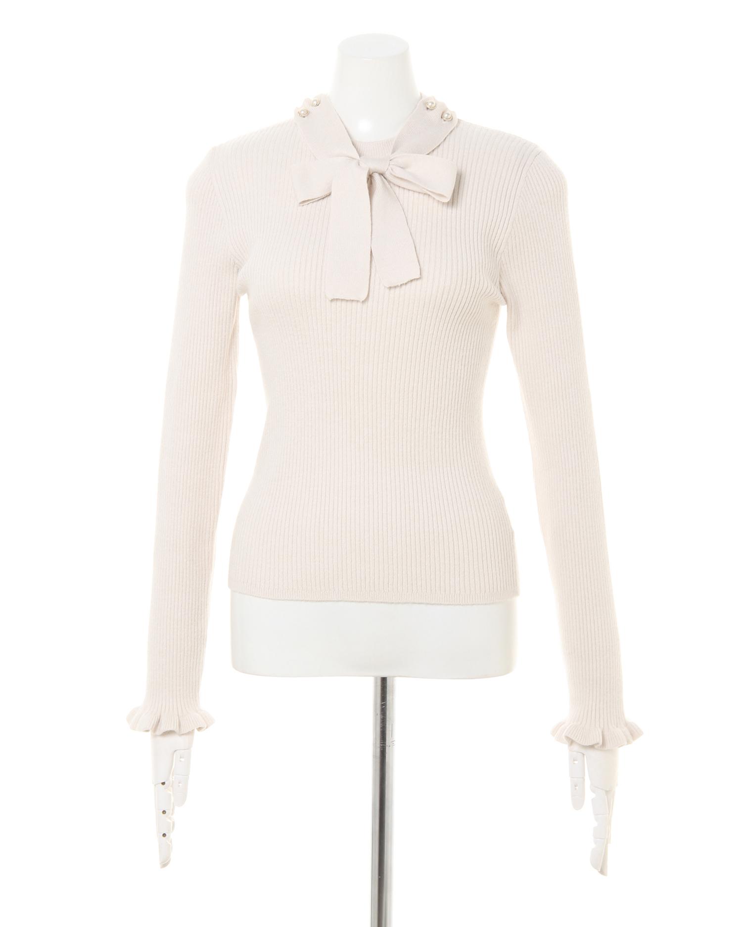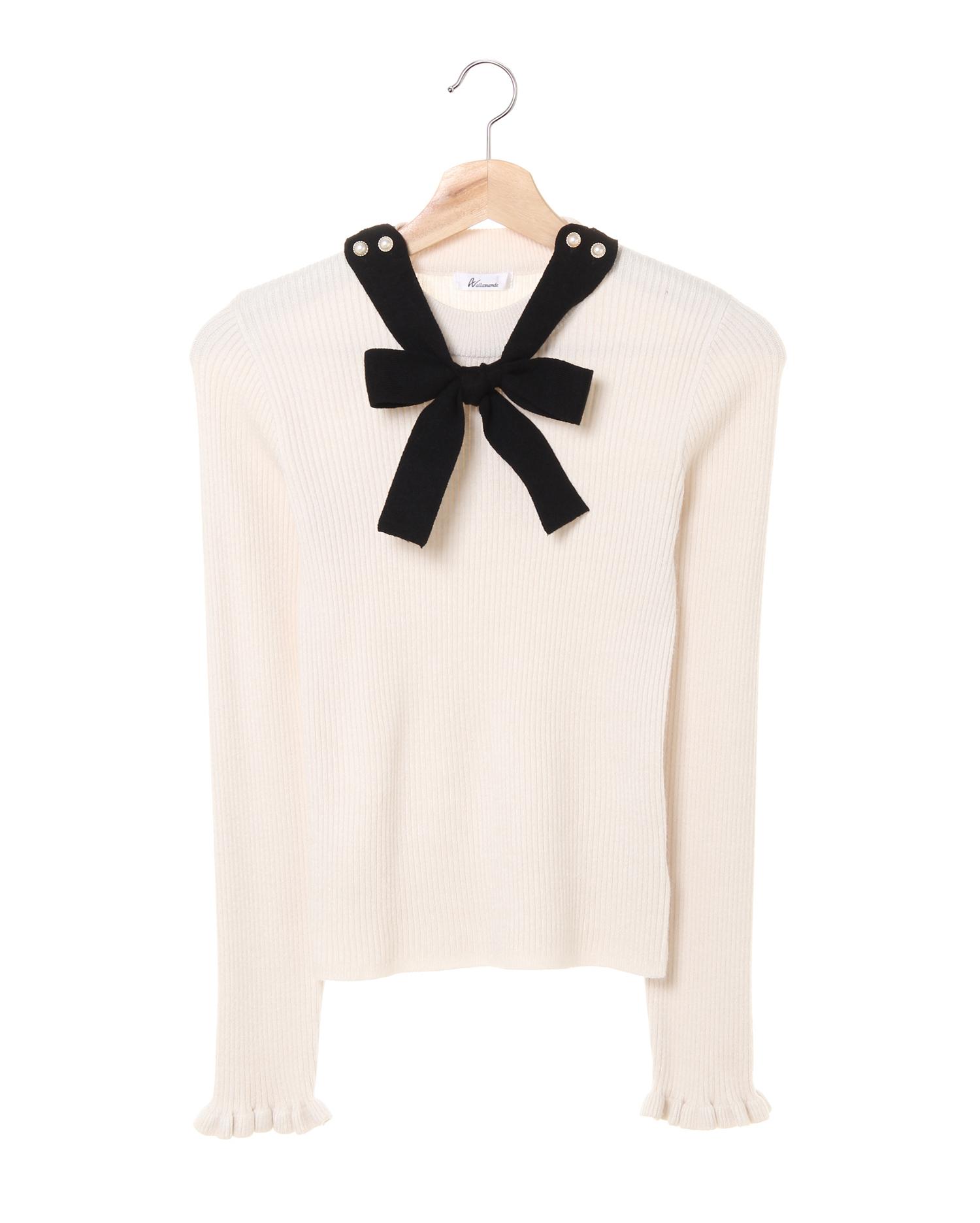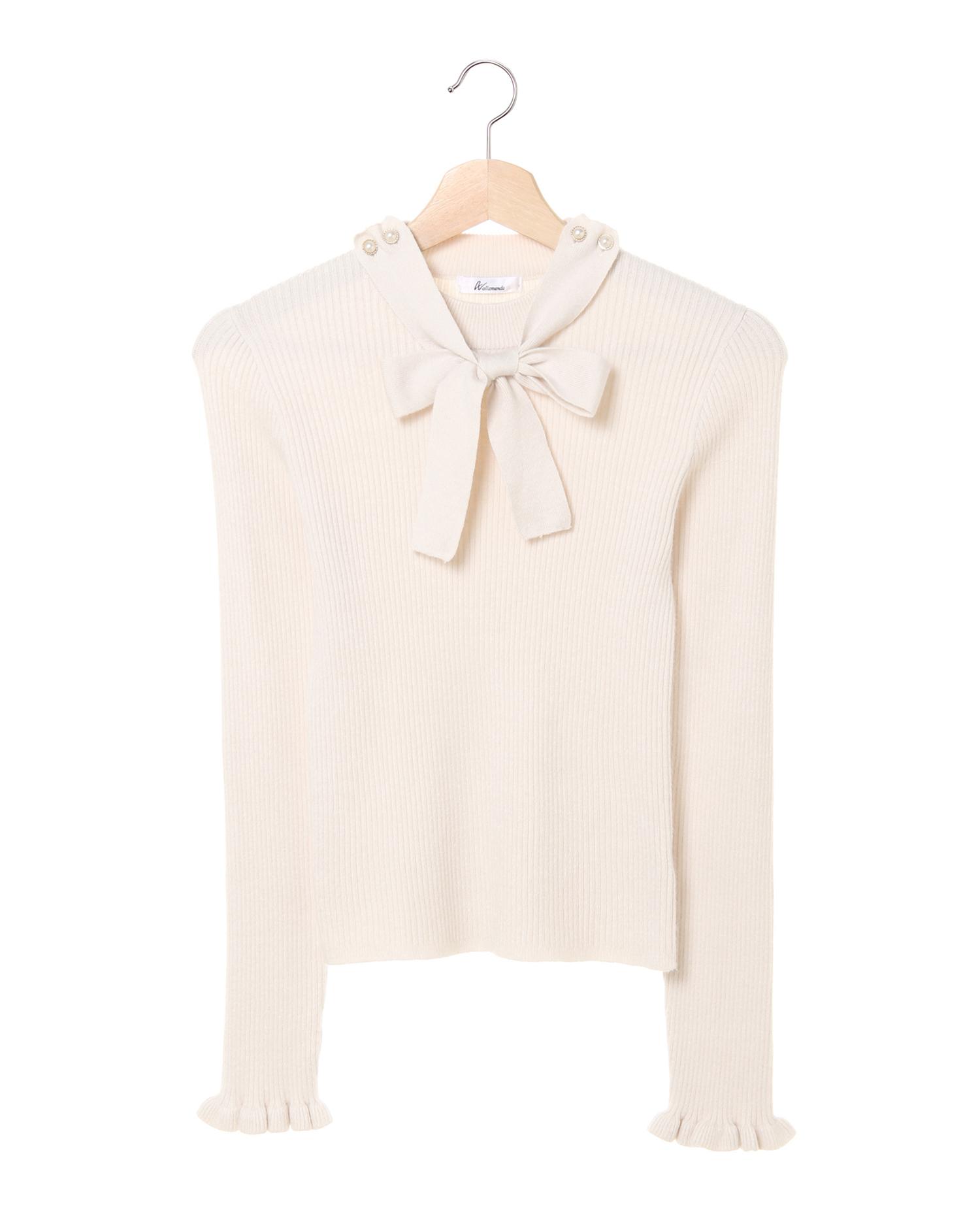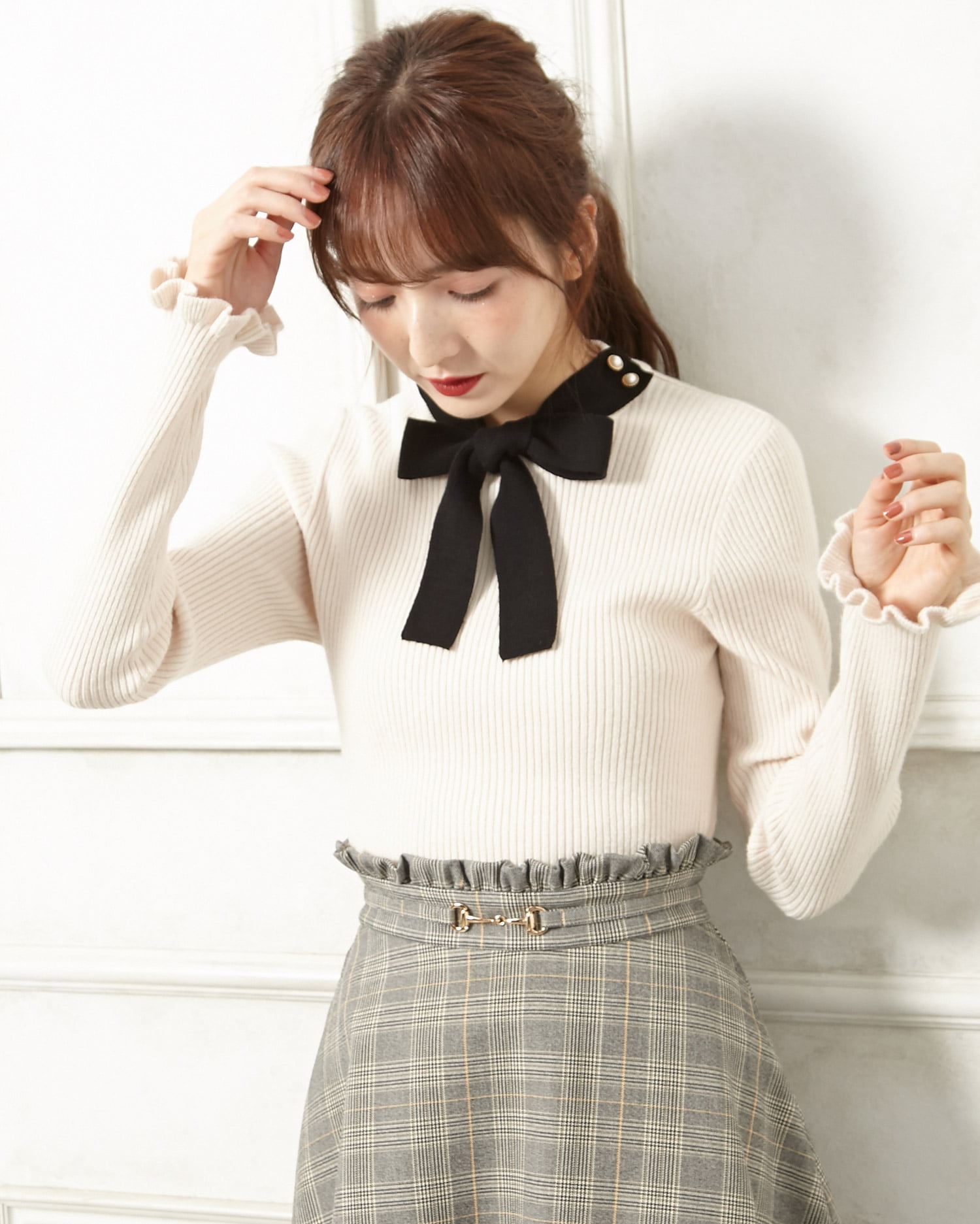 シンプル&ベーシックなリブニットはボウタイデザインが新鮮。ボディラインに沿うコンパクトなシルエットでスタイルアップも狙えるアイテムです。パールビジューが大人っぽいボタンで取り外し可能なボウタイ付き。きちんと感があるのでオフィススタイルにもおすすめです。袖口には控えめフリルでフェミニンなアクセントをプラスしています。