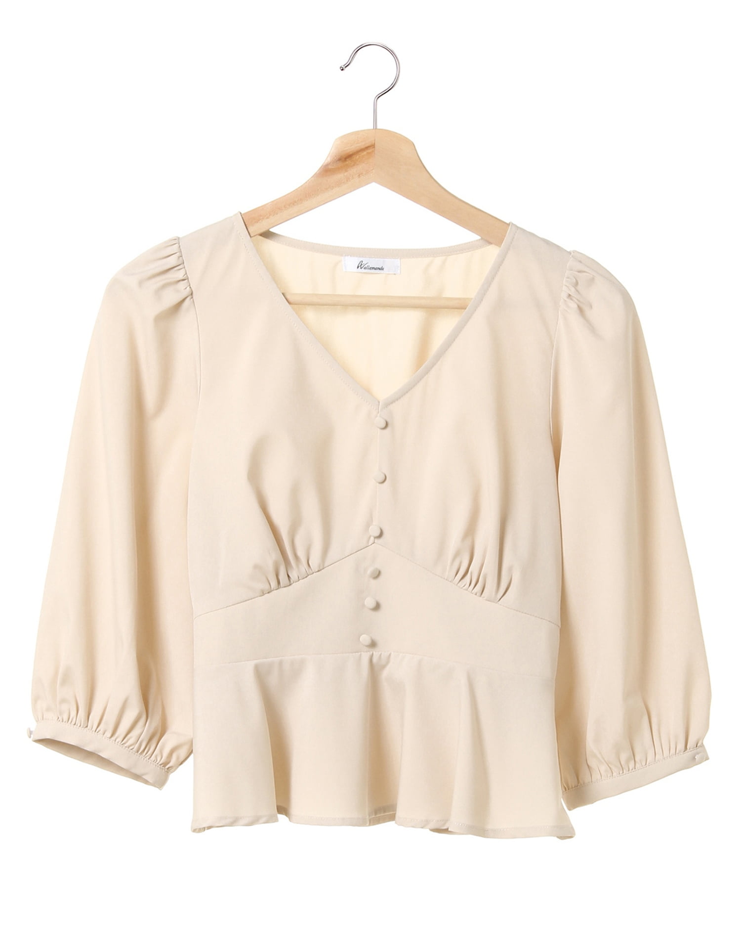 ふんわりスリーブとショート丈でバランス良く着こなせるシンプルトップス。ウエストラインから広がるペプラムシルエットが上半身をコンパクトに見せてくれます。バスト部分にはギャザーを入れて立体感をプラス。ハリのある素材はきちんと感もあるので普段使いはもちろん、オフィスシーンにもオススメ。すっきりと開いたVネックとゆったりめの身頃でインナーを合わせても◎。