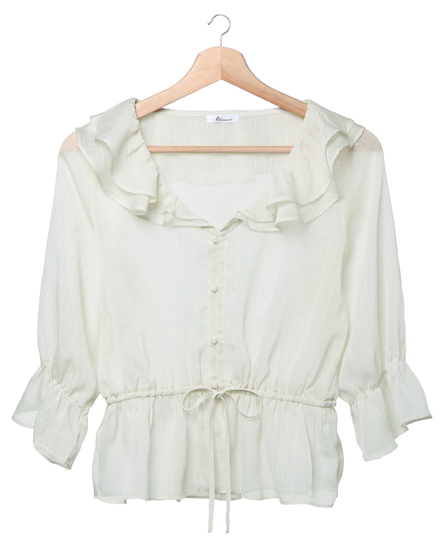 シアー素材で仕立てたフェミニンブラウスでトレンド感たっぷりのスタイルに。ほんのり分かる格子柄と表面感のある素材との組み合わせで表情のある着こなしへと導きます。襟元や裾にあしらったフリルがアクセント。すっきり開いたネックラインは顔周りをすっきり明るく見せてくれます。高めに入れたウエスト部分のドロストでメリハリのあるシルエットで着られるのも◎。