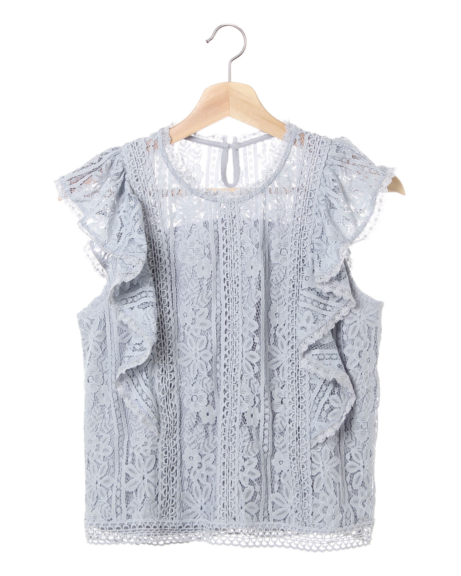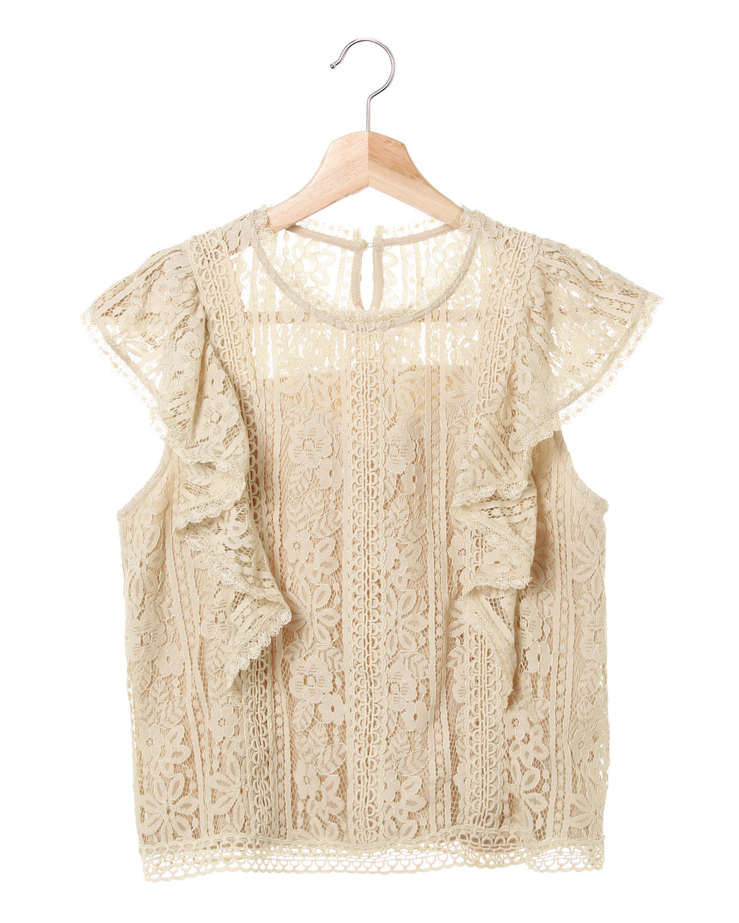 全体にあしらったレースがロマンティックなノースリーブトップス。様々なレースを組み合わせることでワンカラーも表情のあるアイテムに仕上げています。伸縮性があるので着心地も快適。柔らかな裏地付きで1枚でも安心して着られます。袖口のフリルがフェミニンなアクセントに。きちんと感があるのでオンオフ問わずに活躍すること間違いなしです。